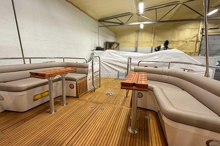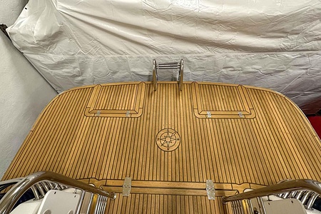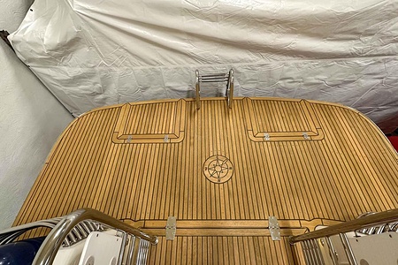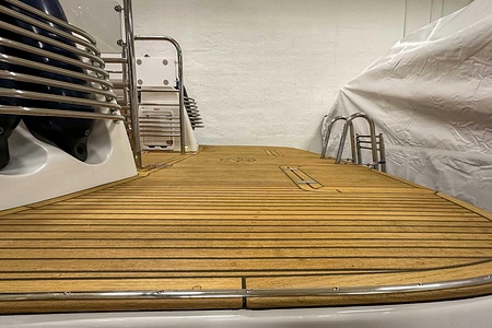 Förlängd badbrygga 63cm med nytt teakdäck, infällda luckor, stege ny 2021