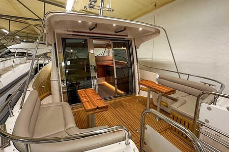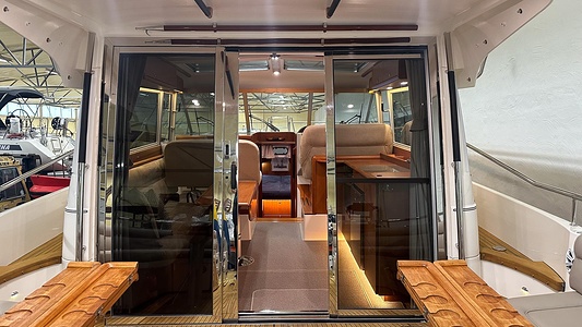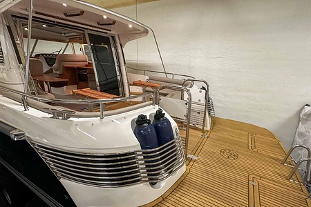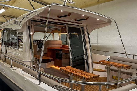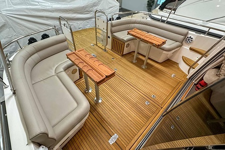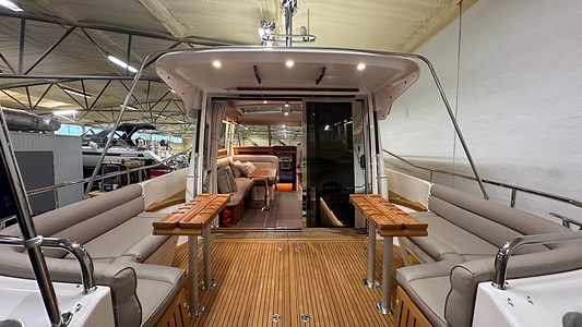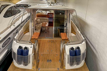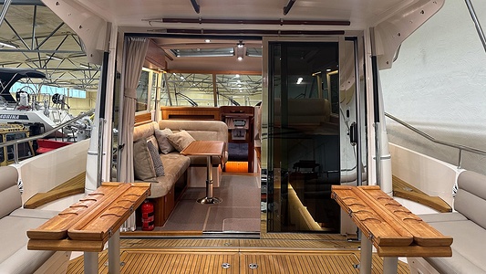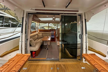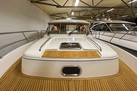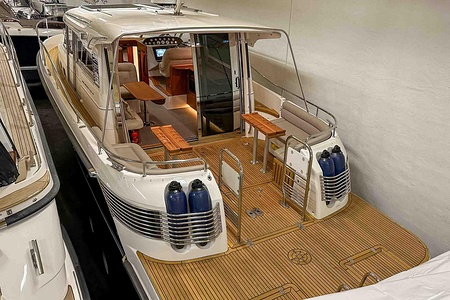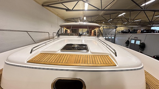 Denna Nimbus med förlängd badbrygga (43 Nova) är byggd på Storebro Bruk och utrustad med dubbla Volvo Penta D6–370 hk – en kraftfull och driftsäker motorlösning som ger både prestanda och trygghet på vattnet.