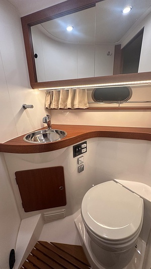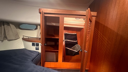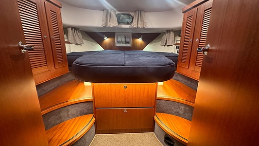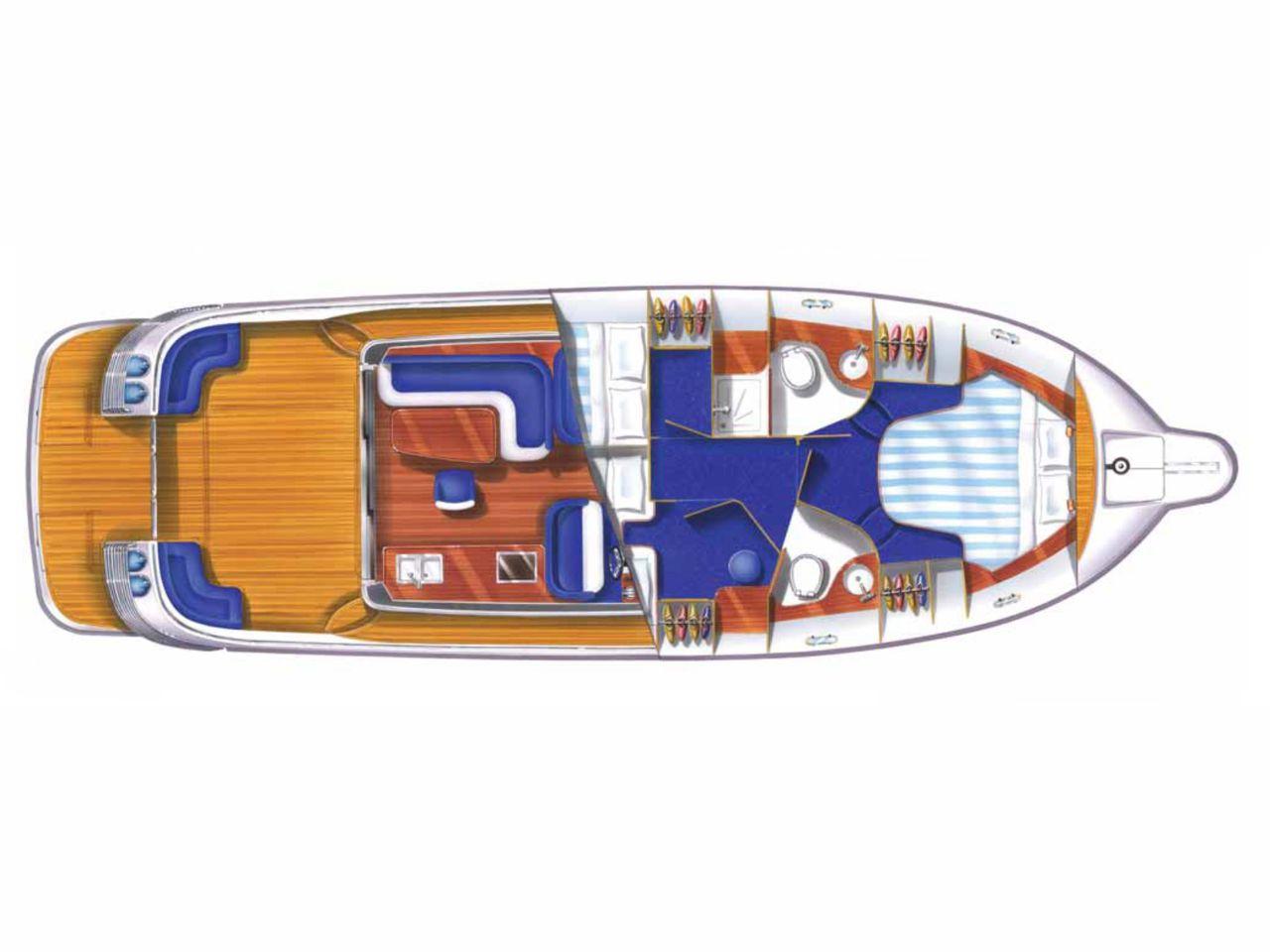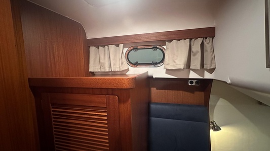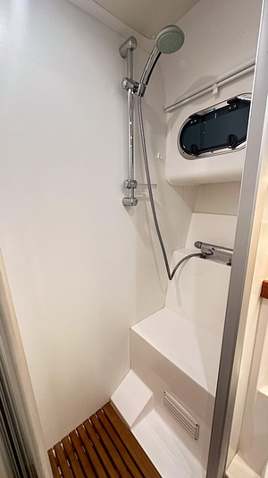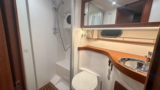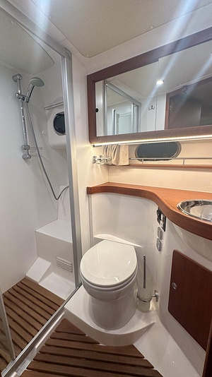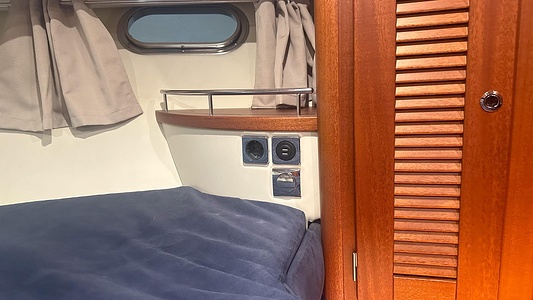 Båten erbjuder tre rymliga dubbelhytter och två toaletter, varav den ena med separat duschkabin – perfekt för längre turer med familj eller vänner.