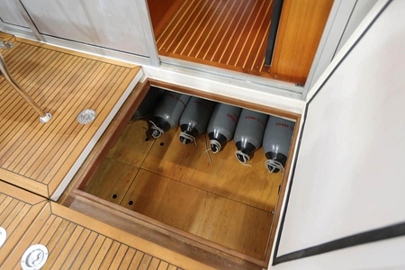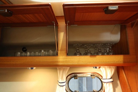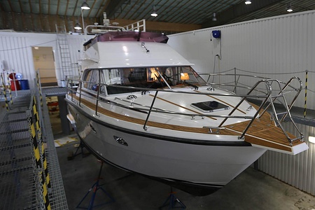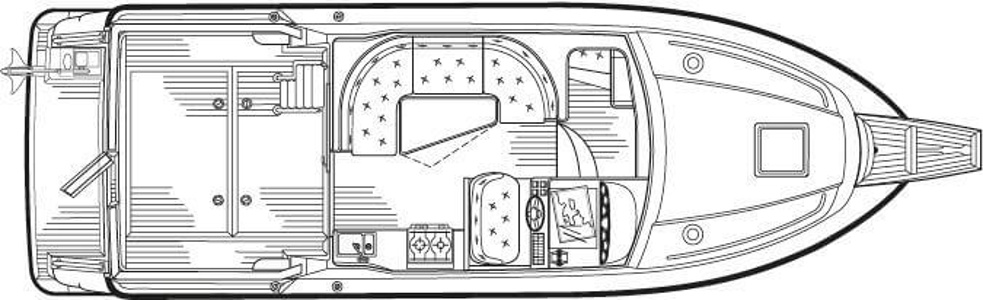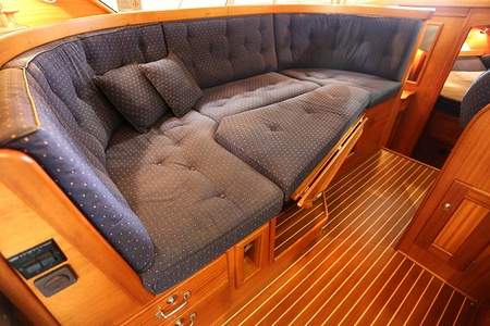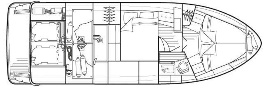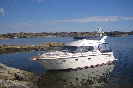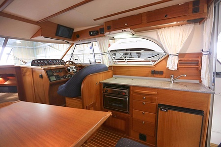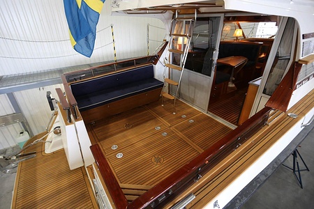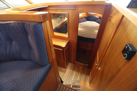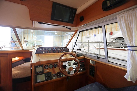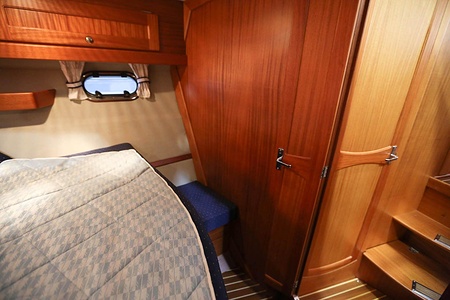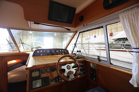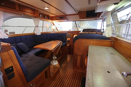 This NordWest 355 has a layout with six berths in two double cabins and lowerable table in saloon. There is very good storage possibilities and a large cockpit. The flybridge has a L-sofa and table (like a Nord West 390) and a radar arch of fiberglas (most NW355 has radar arch in white painted aluminium).