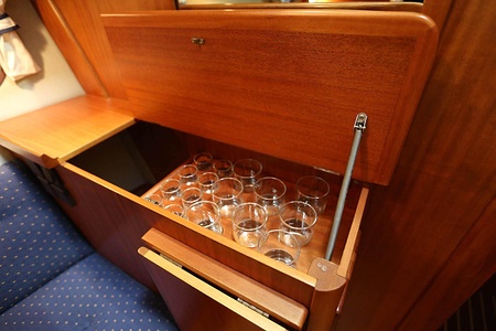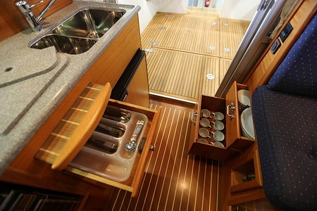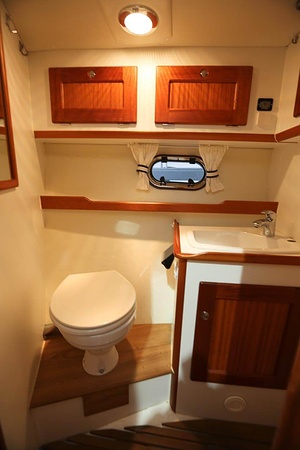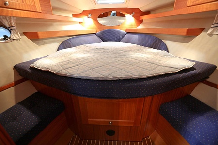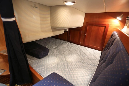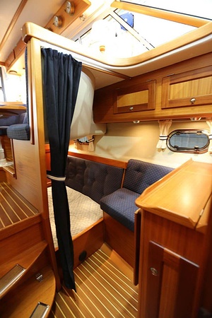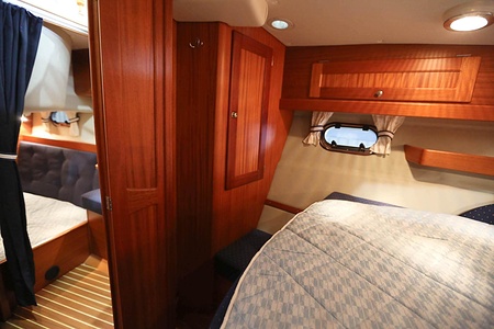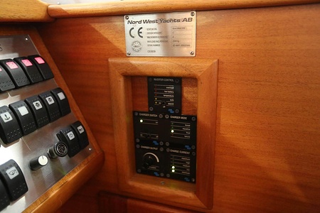 Denna NordWest 355 har en layout med sex sovplatser i två dubbelkabiner och baddbar salong. Mycket goda stuvmöjligheter och en stor härlig sittbrunn. Flybridge har en layout med L-soffa och bord (likt en Nord West 390) och targabågen är av glasfiber (till skillnad mot de flesta andra NW355 där targabågen är i vitmålad aluminium).