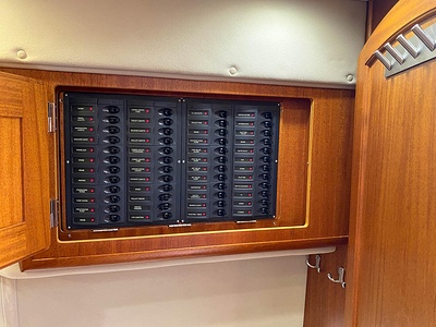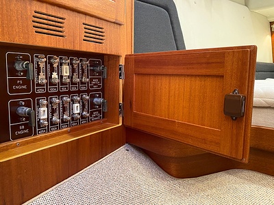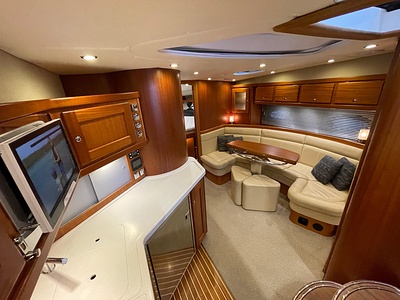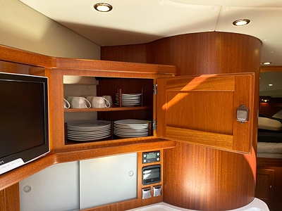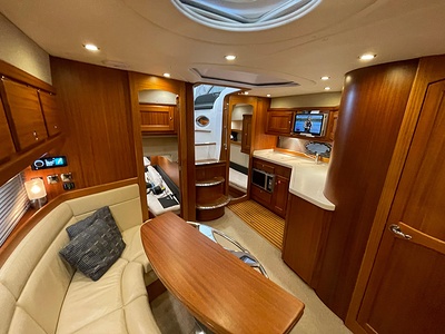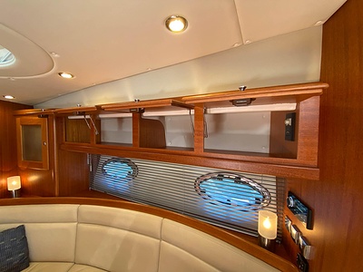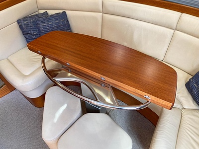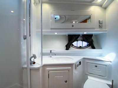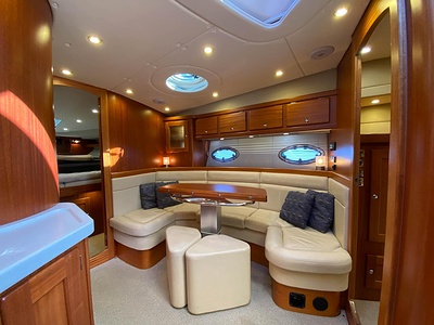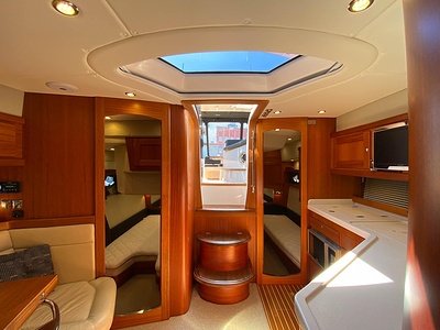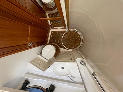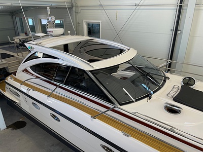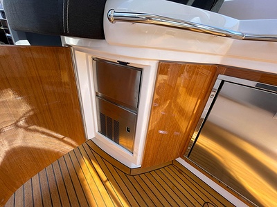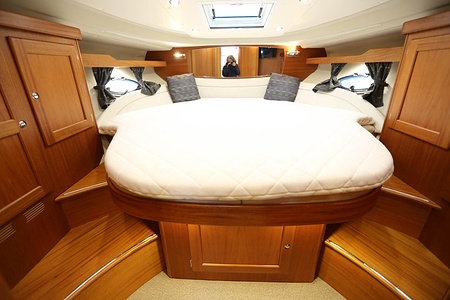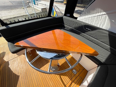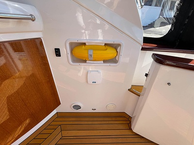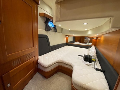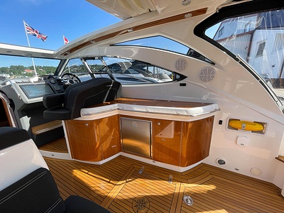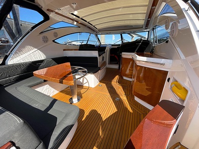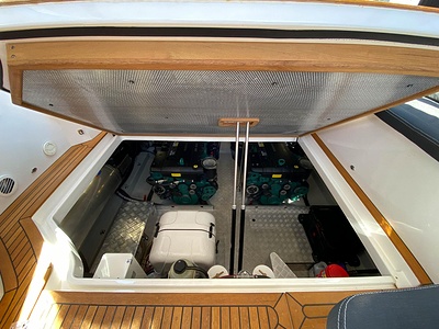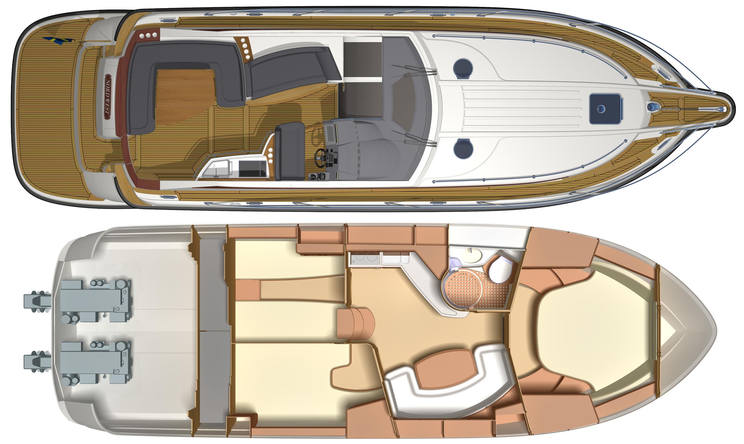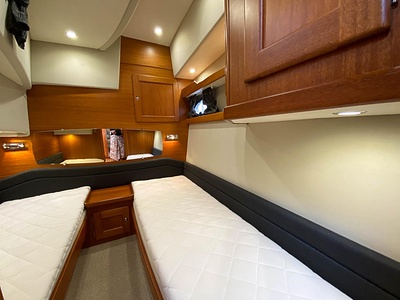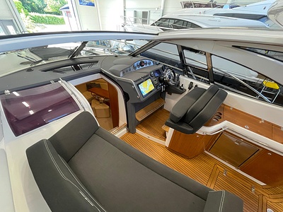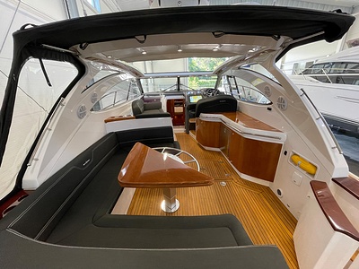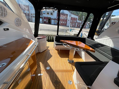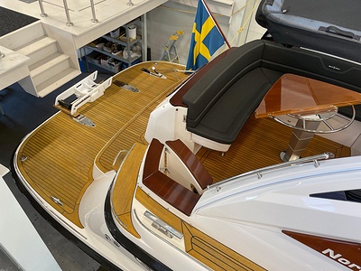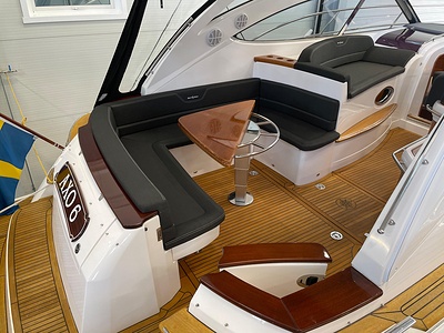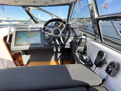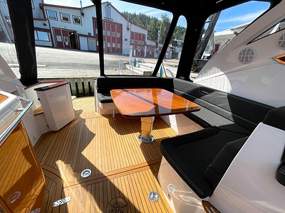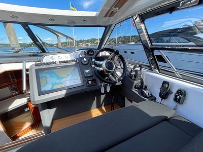 NordWest 430 Sportstop är en daycruiser med fantastiska sjöegenskaper, joystick för trygg tilläggning och bekvämt elektrisk kapelltak. Båten är dessutom utrustad med de största drevmotorerna med 400hk, Humphree automatiskt trimplanssystem, generator och vagga med vinsch för att kunna ta med sig en gummibåt eller vattenskoter. Tre dubbelkabiner och WC med duschkabin.