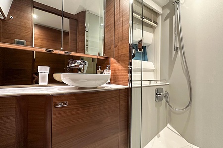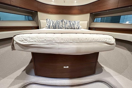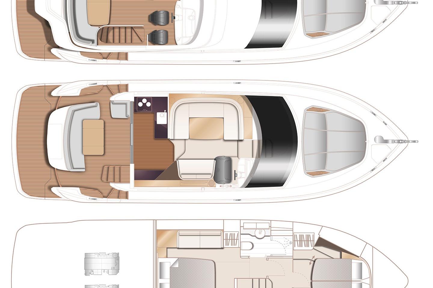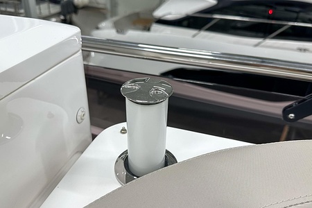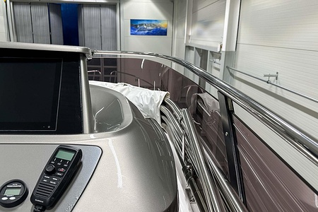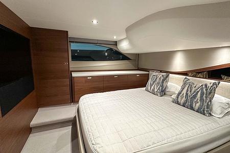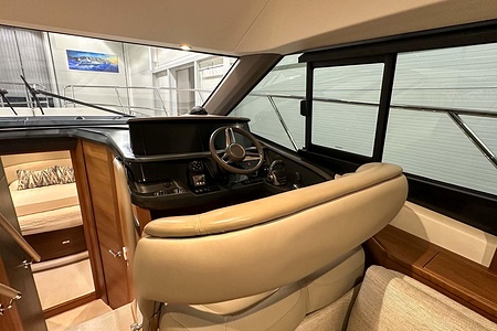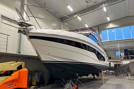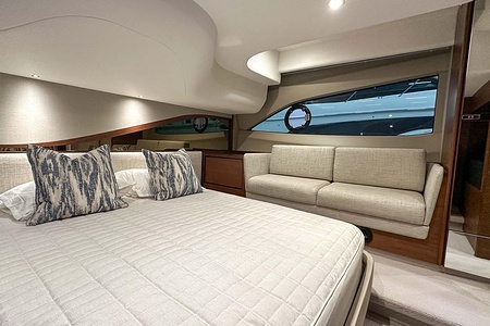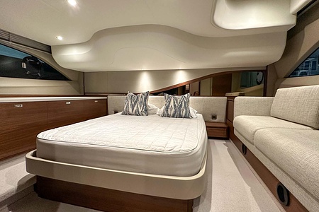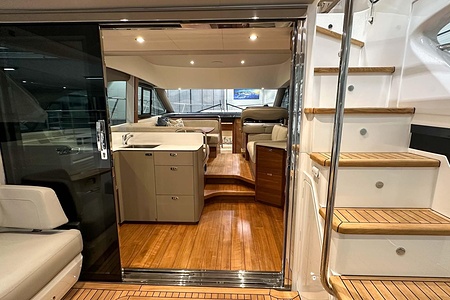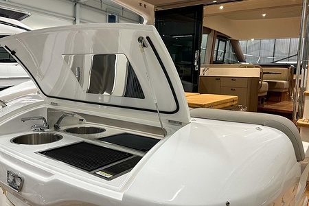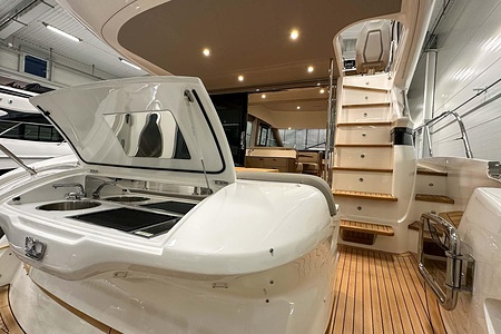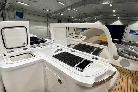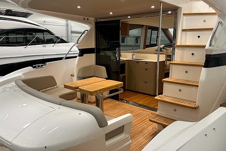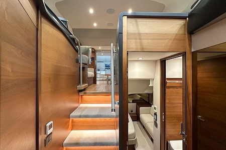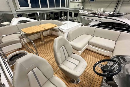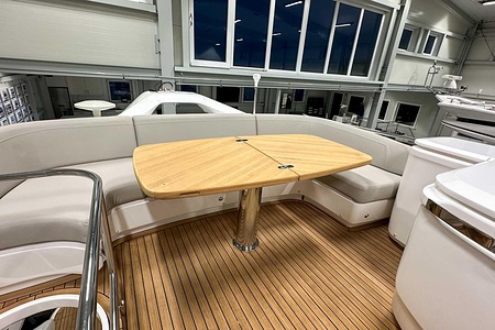 Det ljusa och luftiga salongsutrymmet, det välutrustade pentryt och den sömlösa övergången mellan inne- och uteytor gör båten perfekt för både helgturer och längre semesterturer. De två smakfullt inredda kabinerna, båda med tillgång till badrum, erbjuder utmärkta övernattningsmöjligheter för familj och gäster. Flybridgen bjuder på en generös social yta med sittplatser, solsäng och allt man behöver för avkopplande stunder till sjöss.