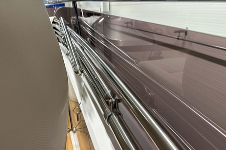 Elhydraulisk sänkbar badplattform (300kg SWL – maxvikt gummibåt 200kg) med gummbåtssystem. Om både gyro och landgång är monterad får gummibåten väga max 125kg.