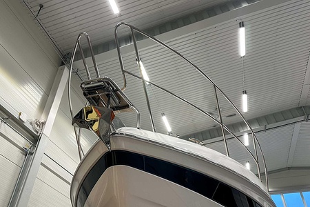 Belysning under flybridgekonsolen, extra däcksbelysning till flybridge, sidodäck och fördäck (totalt 8), pop-up lampa vid främre flybridgesoffa”