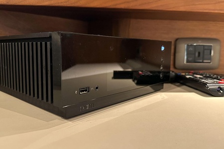 Salong – 40″ UHD LED TV på hiss kopplad till Naim Uniti Atom audio system med Bluetooth, multi-zone med streaming och app. UHD Blu-ray CD/DVD spelare kopplad till Focal högtalare (2) och subwoofer.