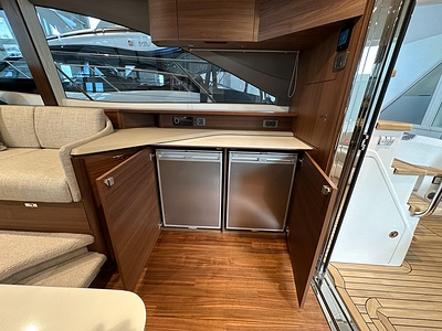 Optional flybridge wetbar incorporating sink, electric griddle/BBQ, waste bin and top loading coolbox