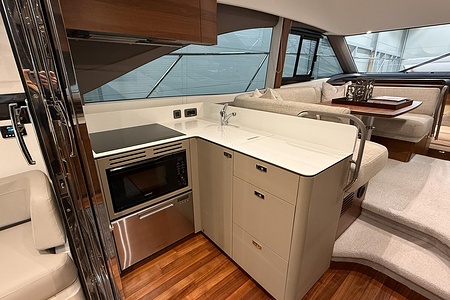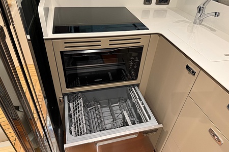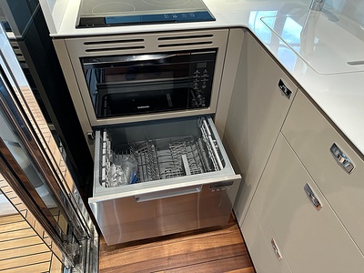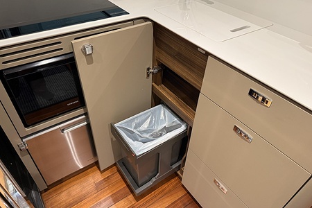 Galley worktops including starboard sideboard are Sylmar White Solid Surface (satin finish) as standard