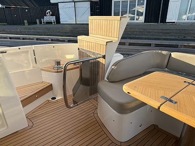 Fold down transom seat with seat pads. Incorporates storage locker (suitable for paddleboard storage or SEABOB storage and charging)