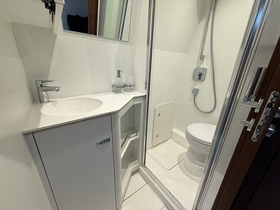 “Aft/crew cabin fit out (single berth with separate head and shower) includes porthole to cockpit seating upstand.