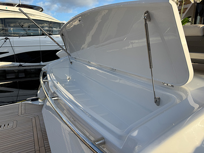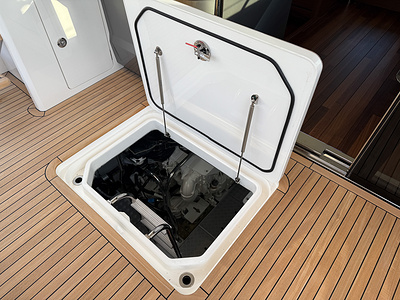 Electro hydraulic bathing platform with 450kg SWL fitted in place of standard fixed bathing platform. Includes stainless steel two-rung ladder, to access stern from bathing platform when bathing platform is in lowered position