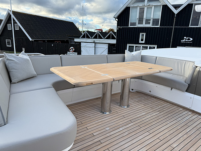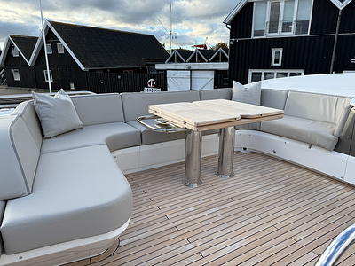Standard deck material to bathing platform, transom steps, cockpit, flybridge stairway and steps to side deck, is 6mm teak with black caulking