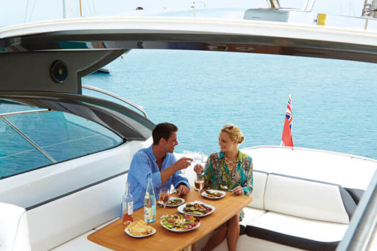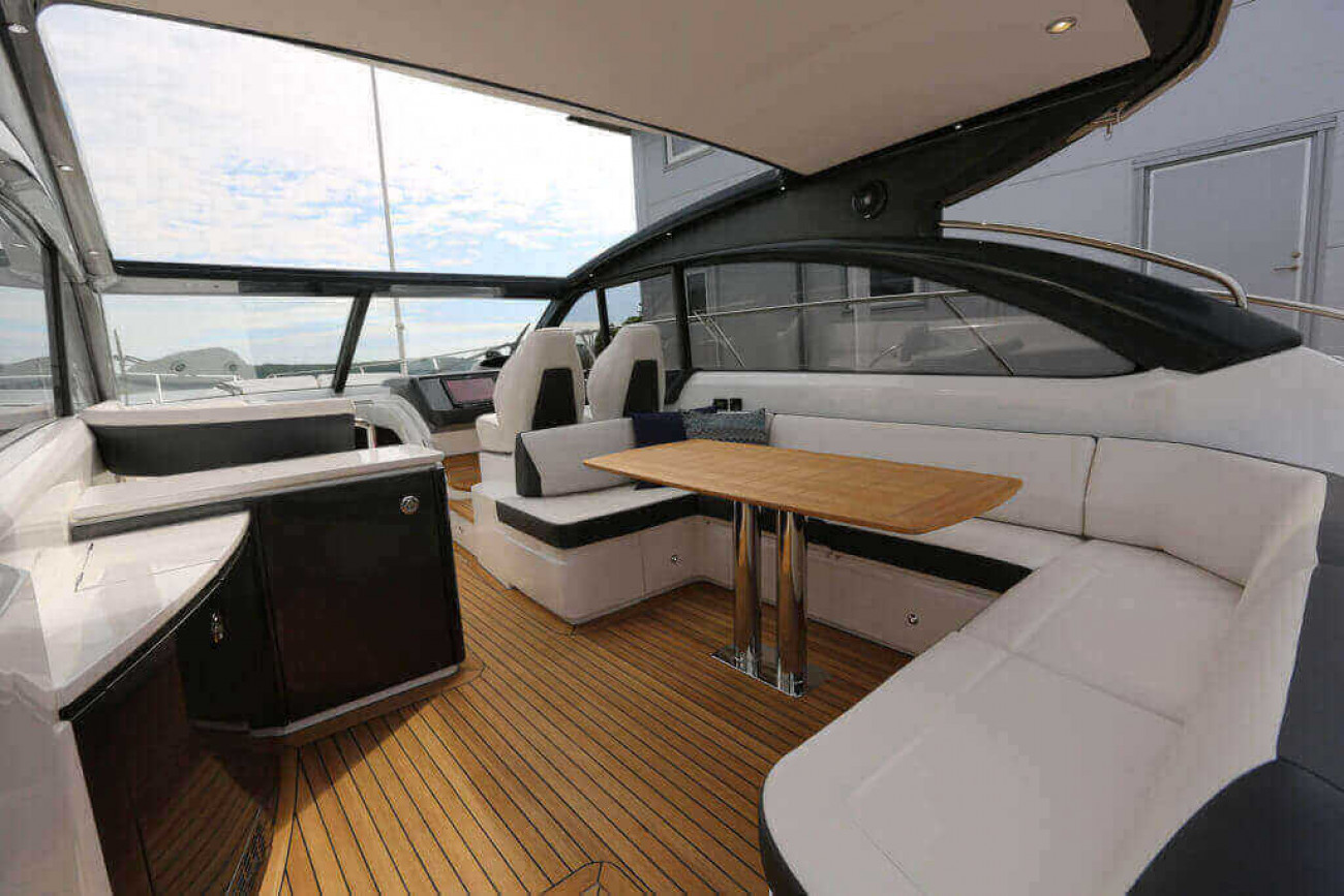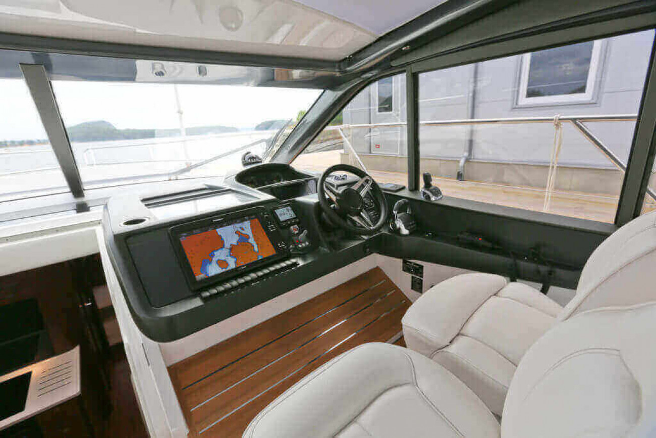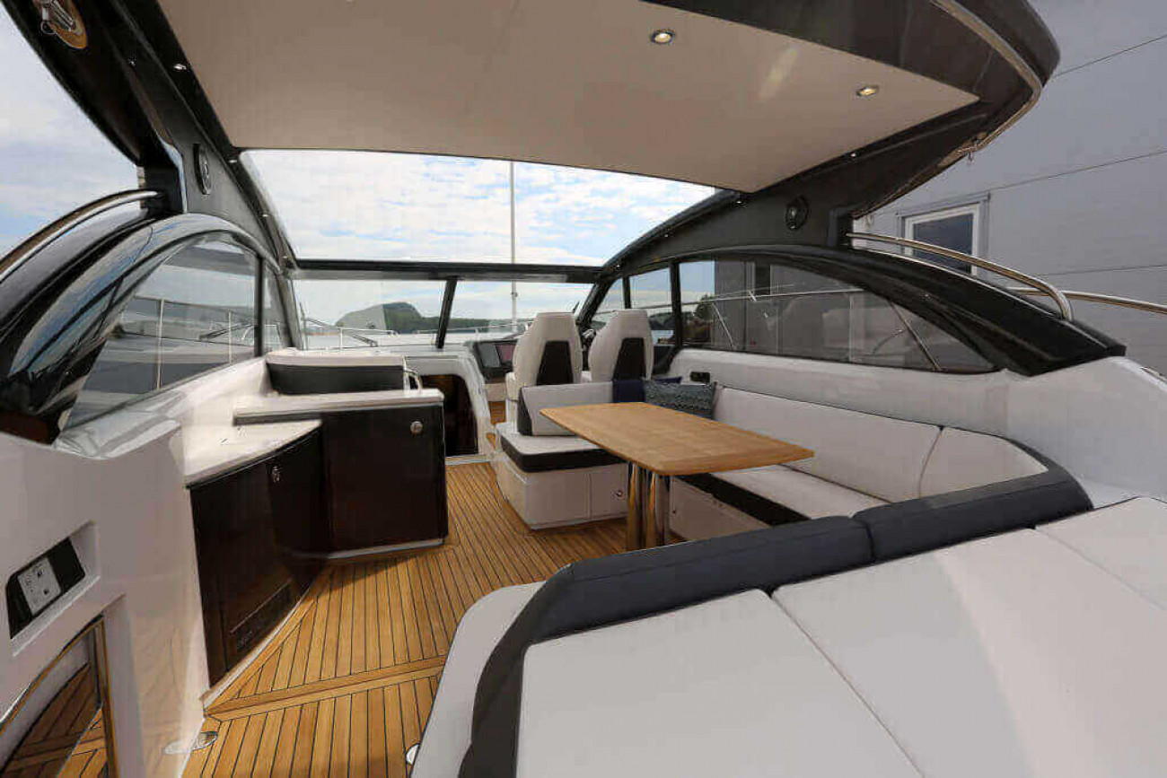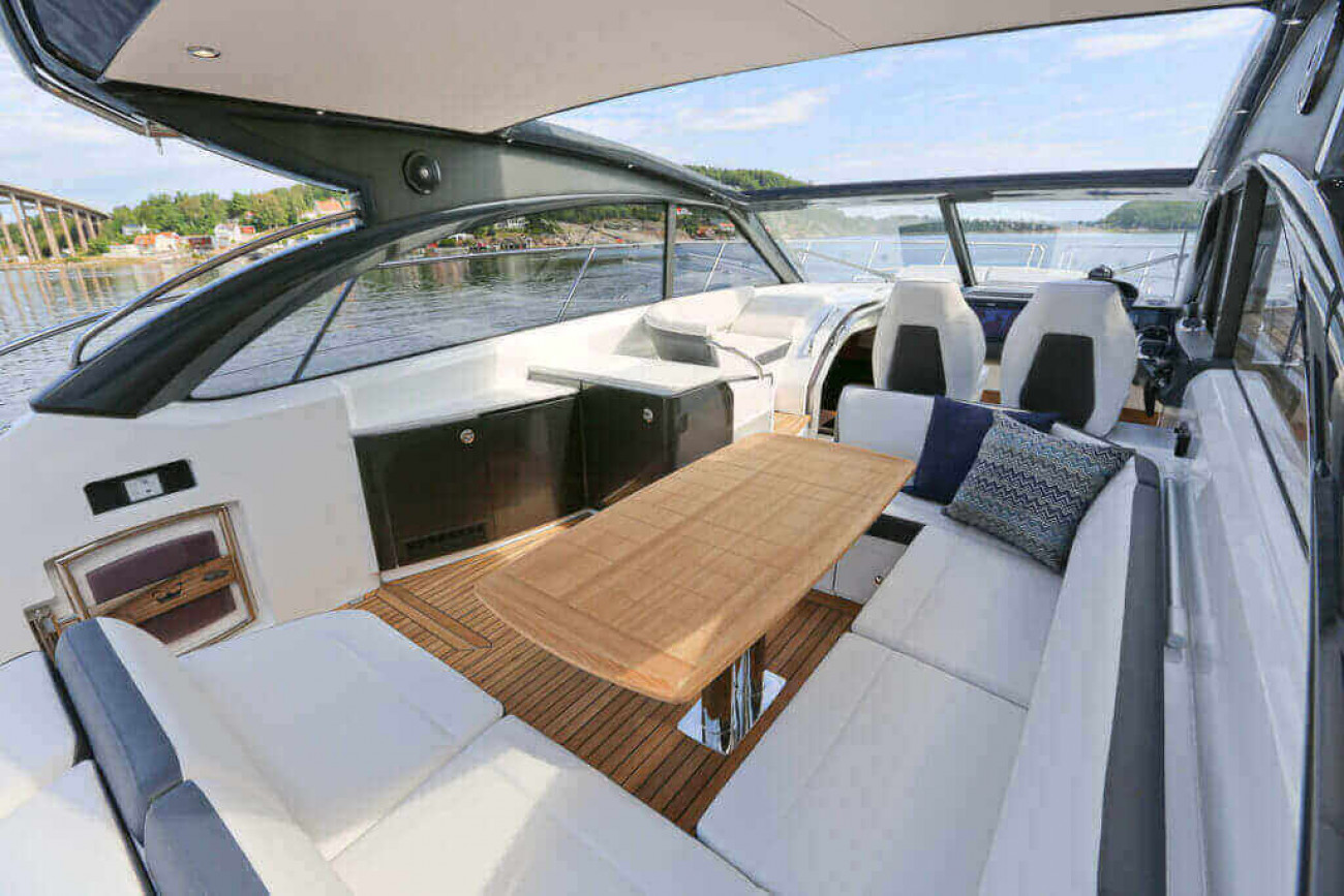 Den L-formade förarkabinen fungerar utmärkt, och med en sufflett kan hela utrymmet vid behov täckas över med minimal insats. V48 Open har ett hopvikbart textiltak som manövreras elektriskt. Den är en traditionell sportscruiser med soldyna i aktern, ett tendergarage och en nedre salong. I tendergaraget finns plats för en 3,25 meters jet-RIB, och det är en enkel sak att sjösätta jet-RIB:en med den elektrohydrauliska badplattformen som levereras som standard med V48 Open.