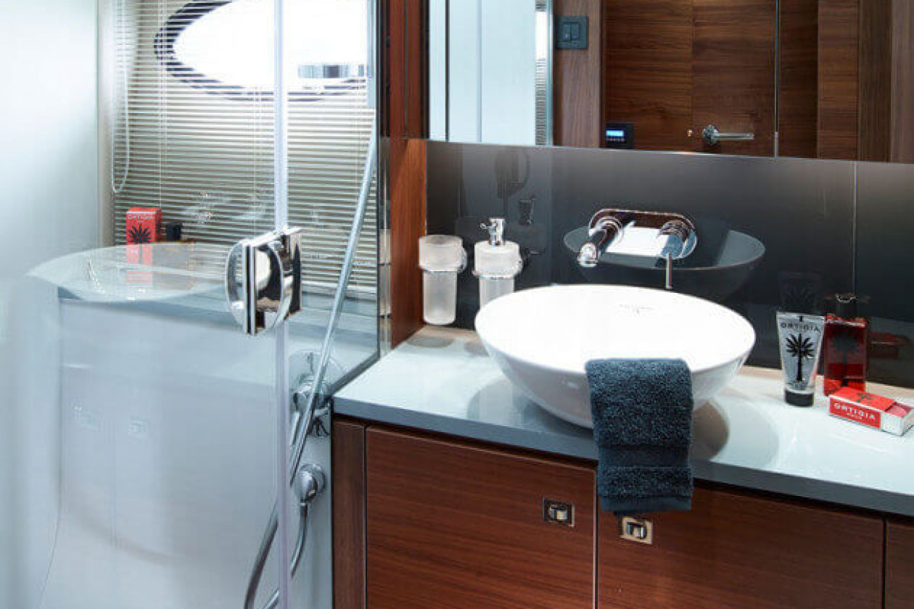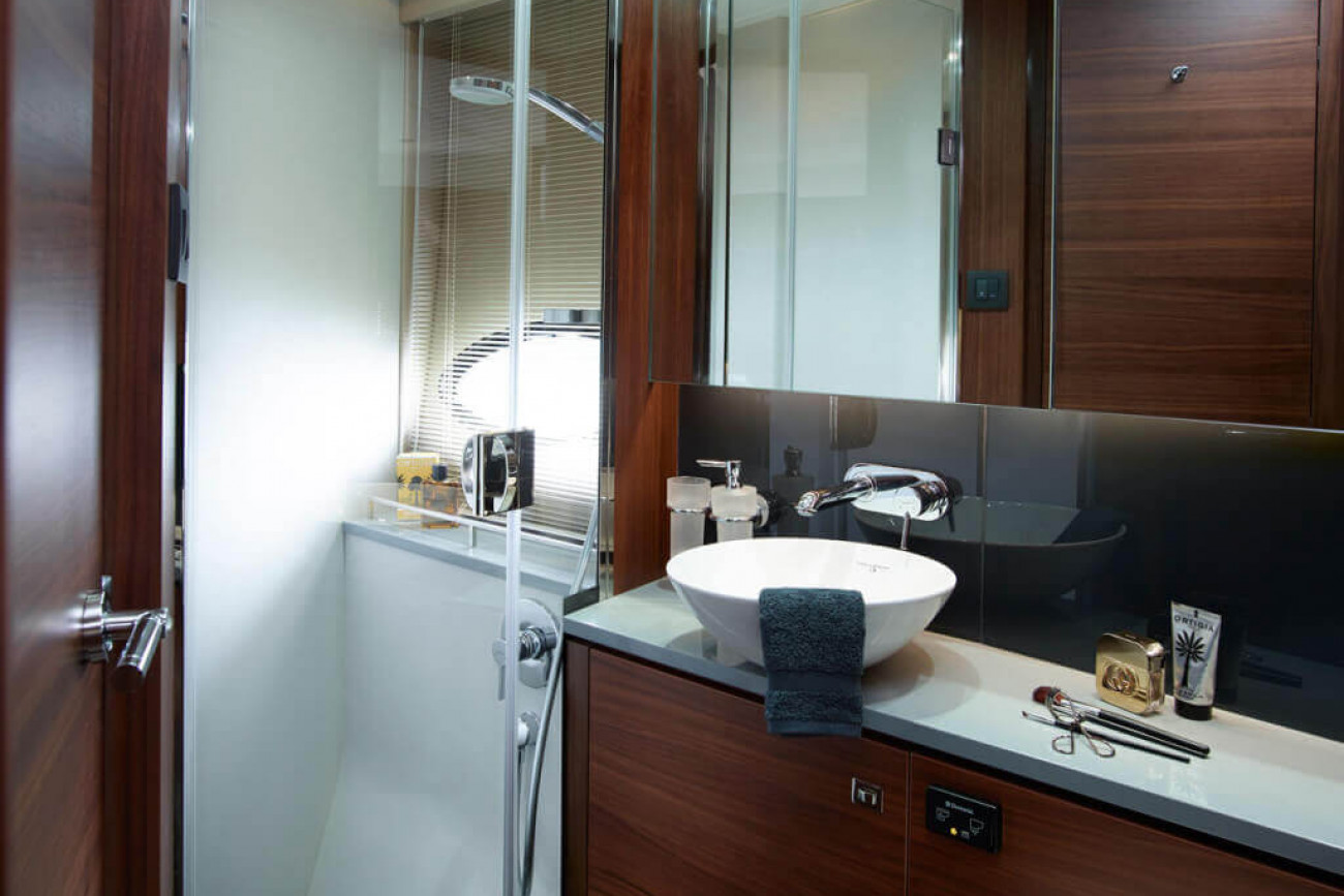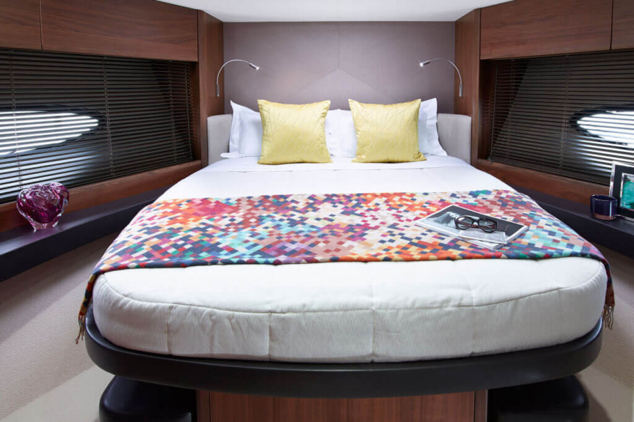 Större höjd har uppnåtts i kabinerna genom att de sänkts ned djupare i skrovet, vilket får båten att kännas som om den var betydligt större. Ägarkabinen midskepps är inget annat än magnifik, och Princess typiska ramlösa skrovfönster får kabinen att kännas mycket ljus och rymlig.