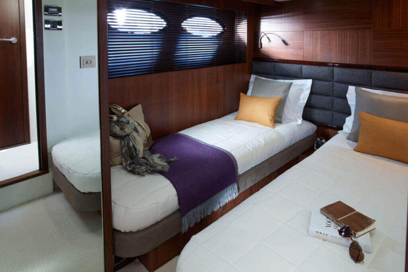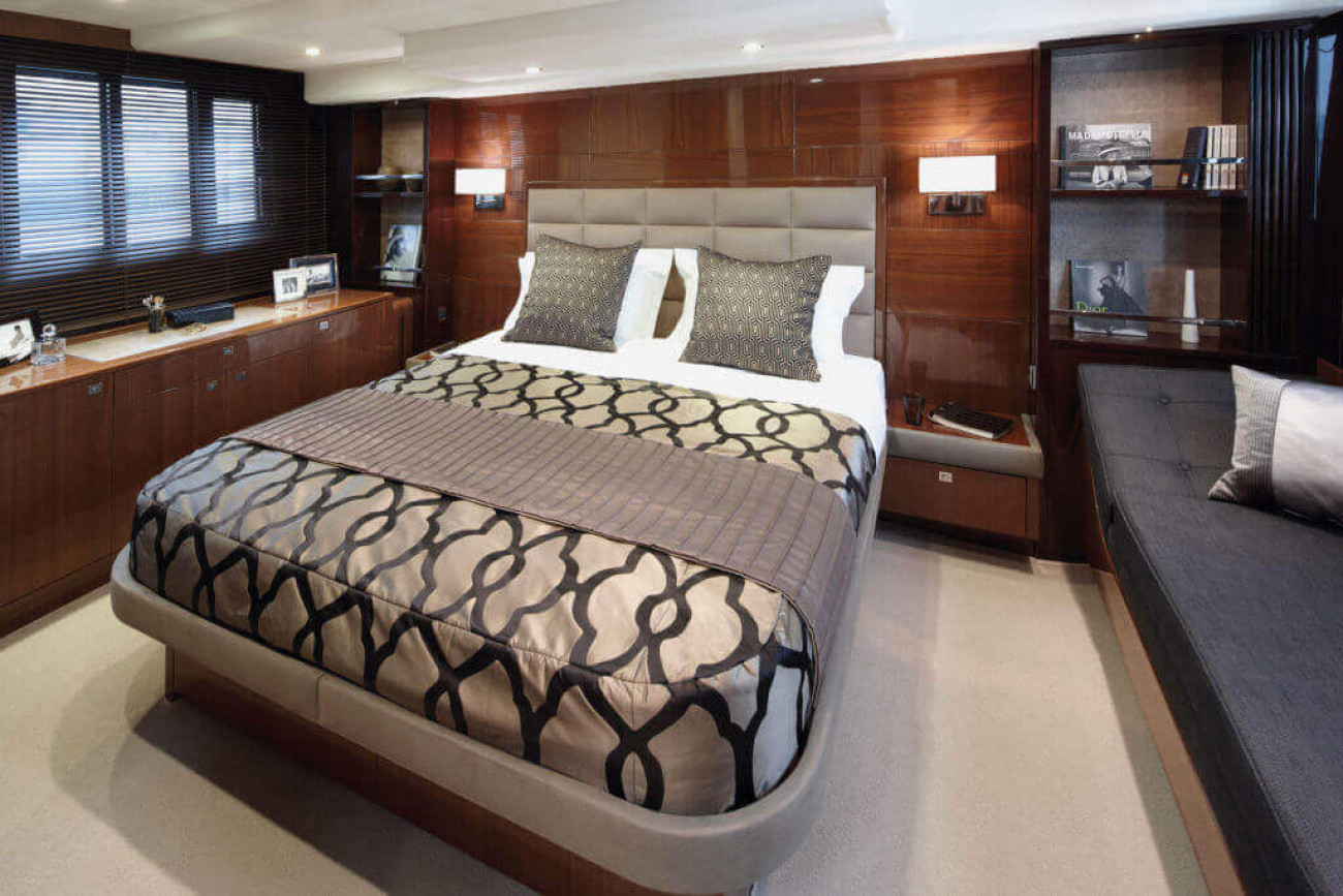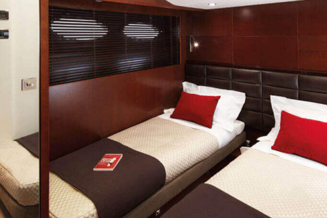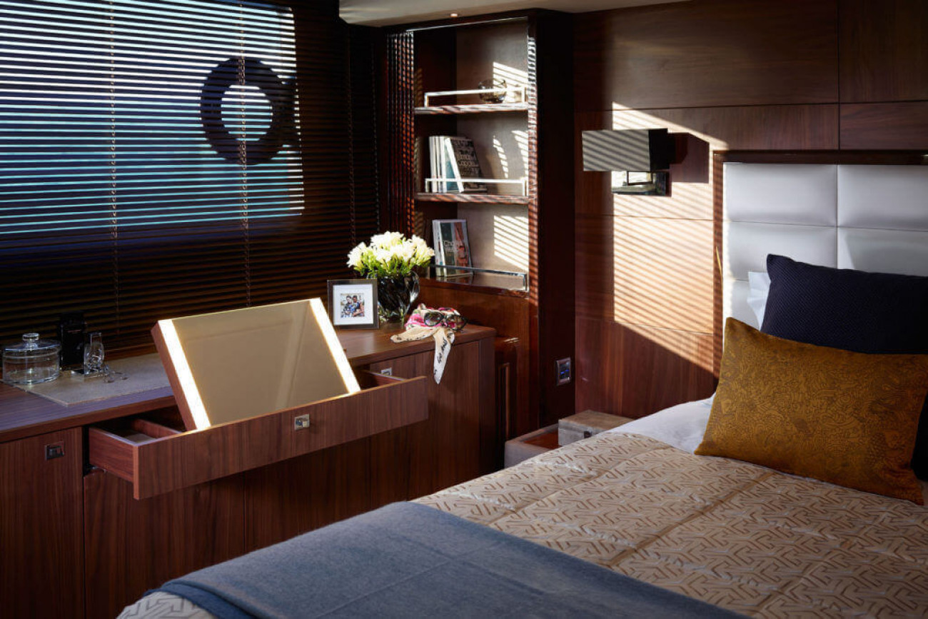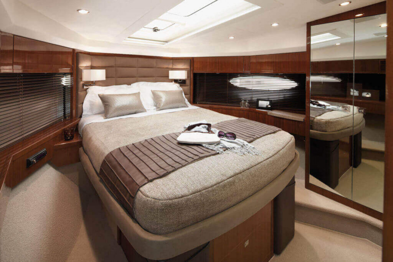 Bakom sin eleganta, sportiga profil döljer sig en oerhört rymlig 4-kabins motoryacht. Det är imponerande för en yacht av den här klassen, men kanske ännu mer så då inget tyder på att man kompromissat någonstans. En VIP-svit med badrum och ytterligare två gästkabiner ger lyxigt boende för alla dina gäster, men den magnifika fullbreddskabinen midskepps, som är upplyst av enorma skrovfönster, ger mer känslan av “’boutiquehotell” än “motoryacht”!