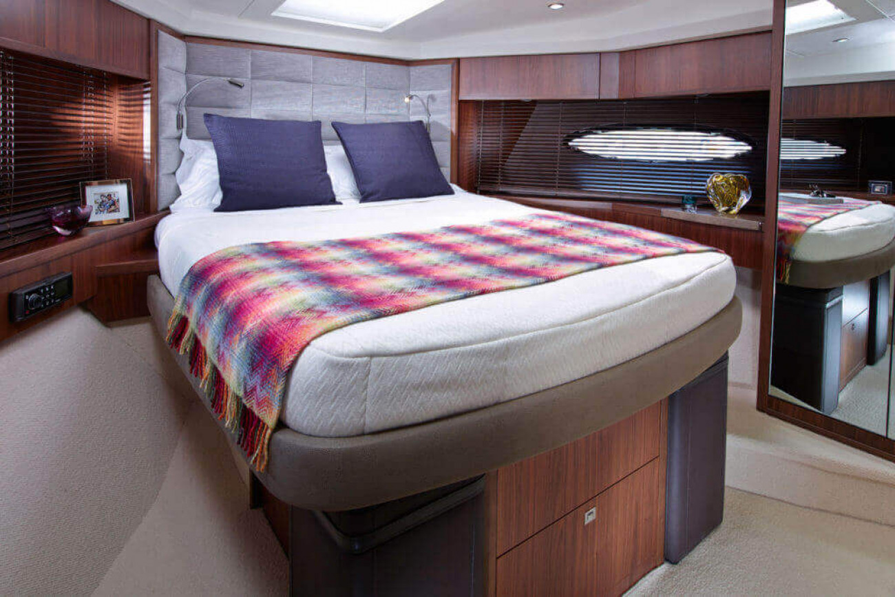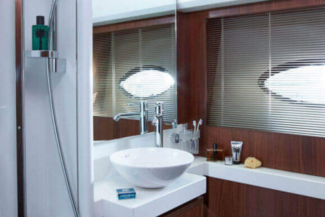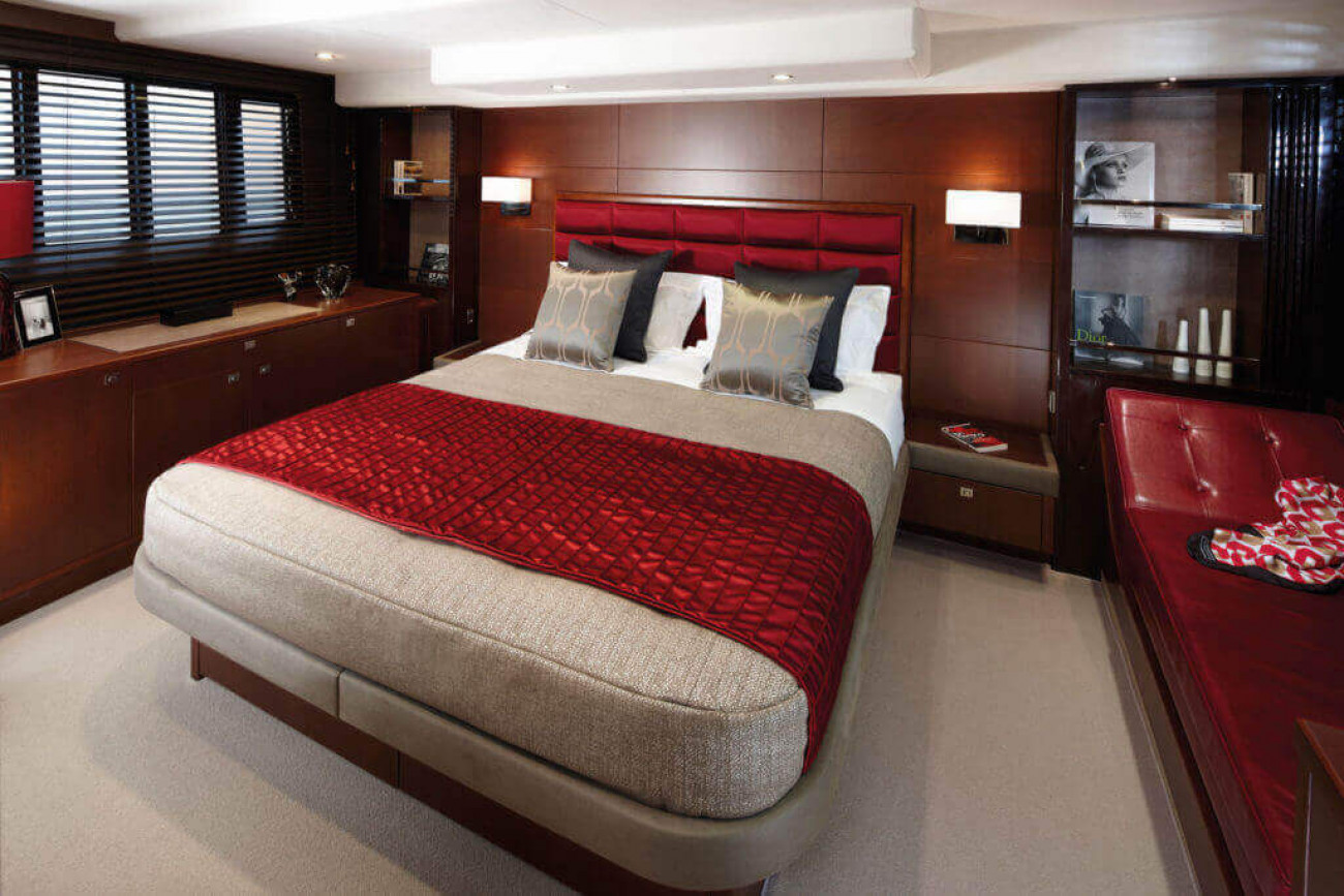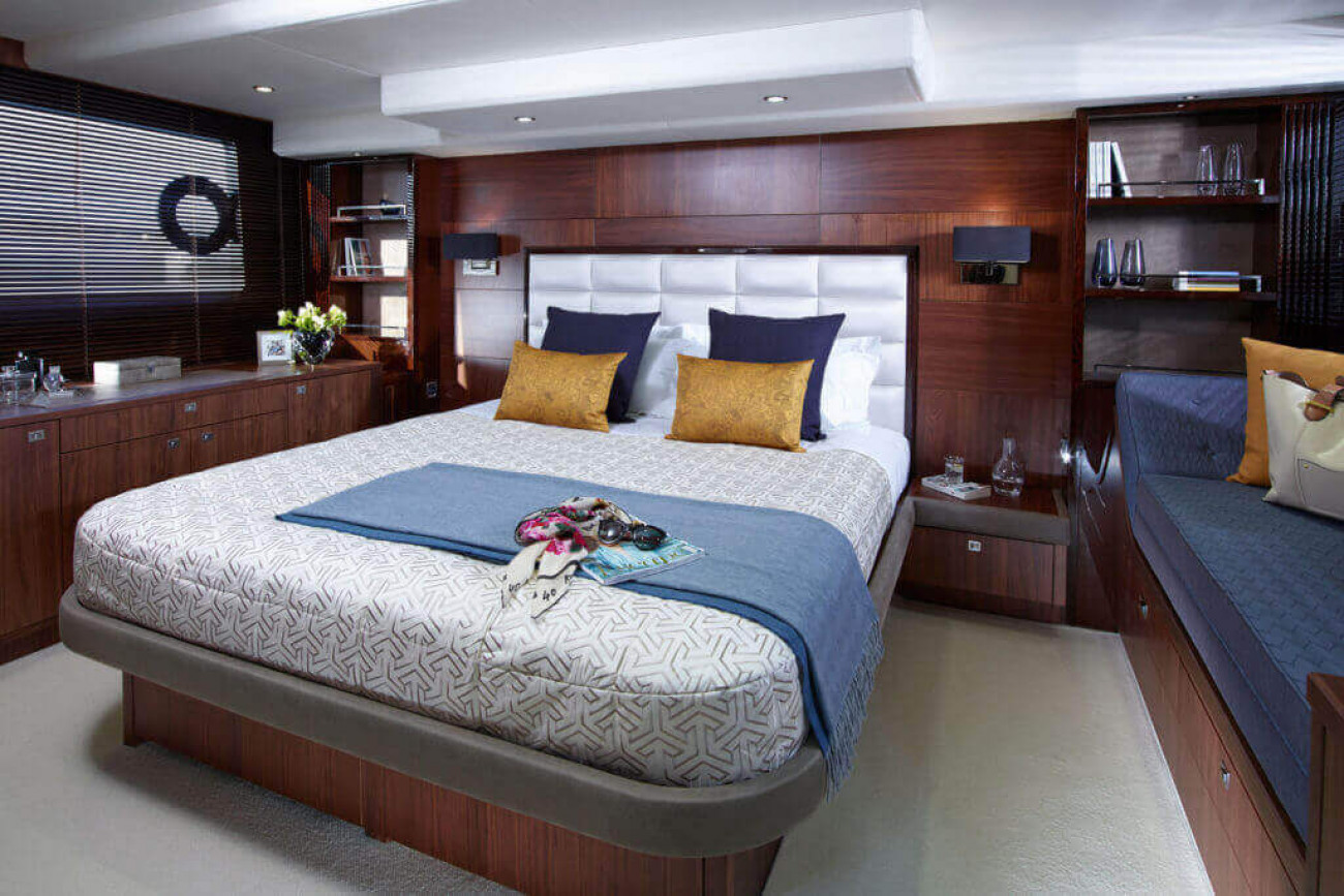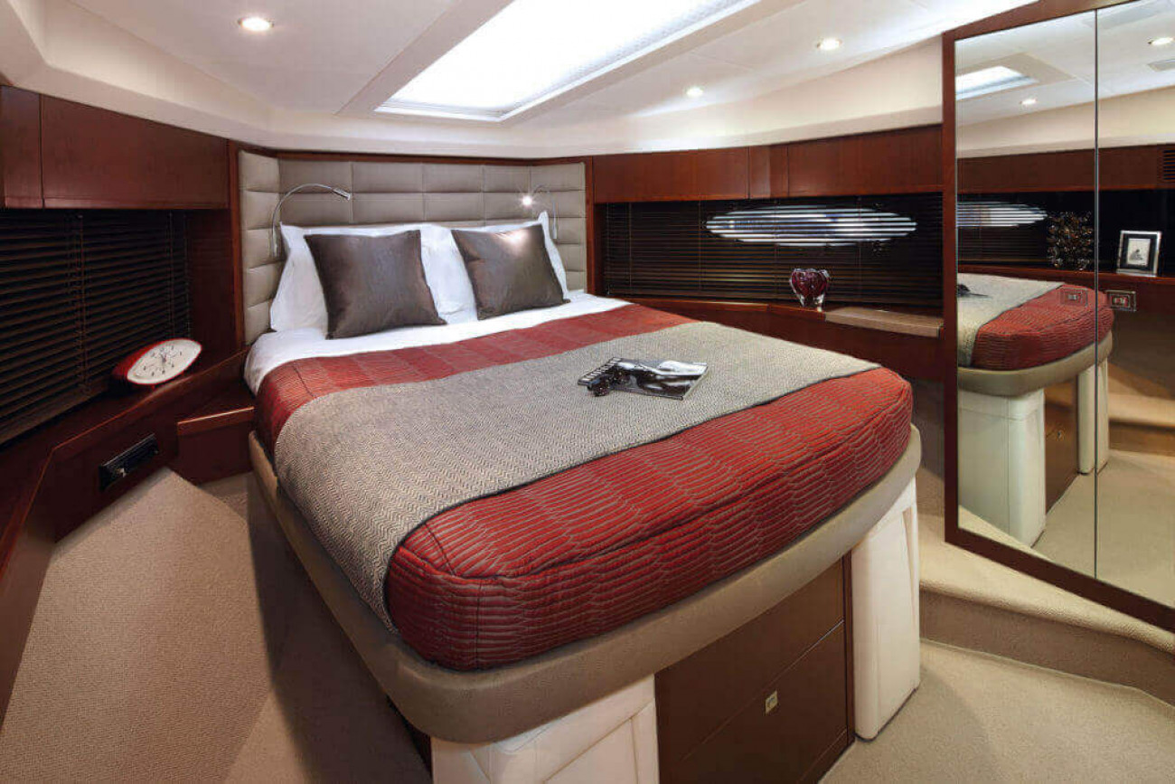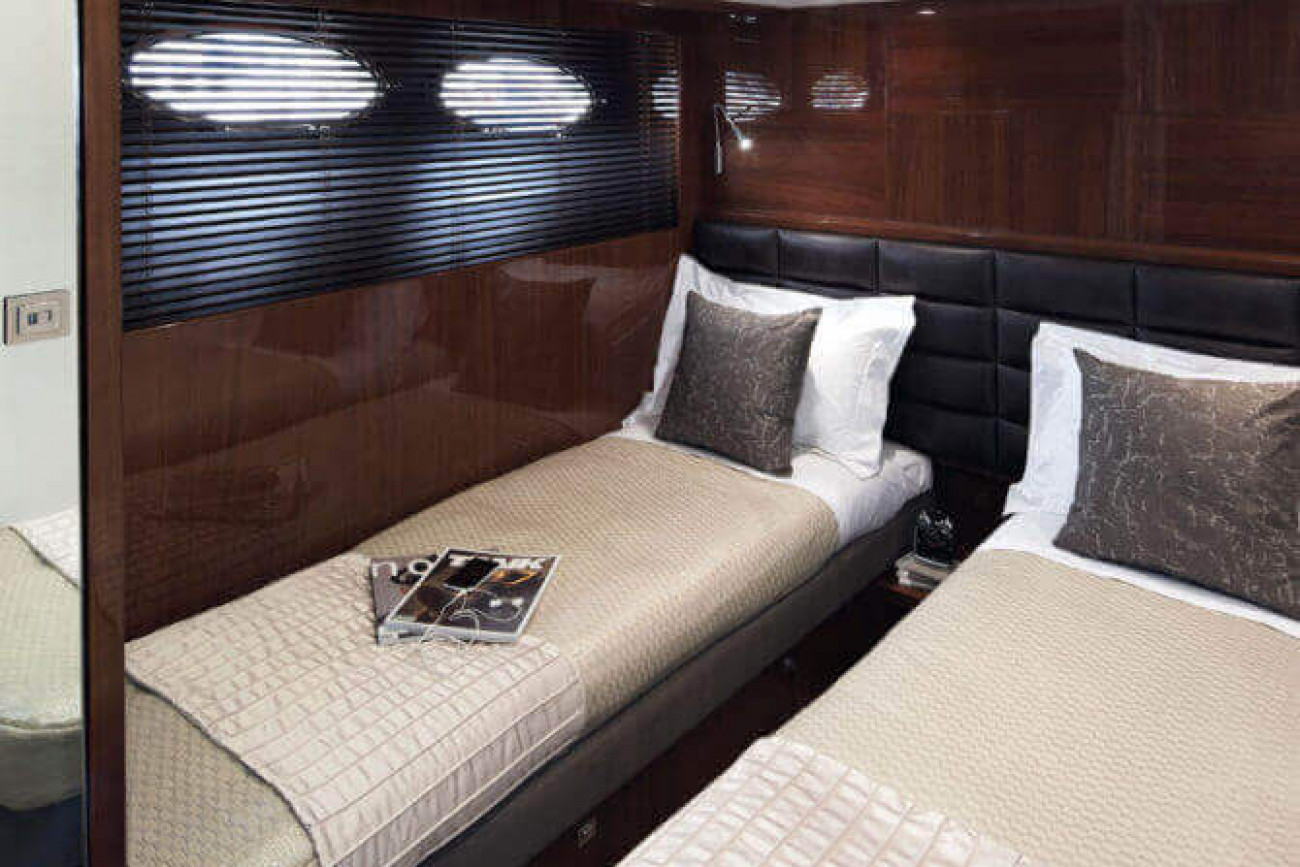 Bakom sin eleganta, sportiga profil döljer sig en oerhört rymlig 4-kabins motoryacht. Det är imponerande för en yacht av den här klassen, men kanske ännu mer så då inget tyder på att man kompromissat någonstans. En VIP-svit med badrum och ytterligare två gästkabiner ger lyxigt boende för alla dina gäster, men den magnifika fullbreddskabinen midskepps, som är upplyst av enorma skrovfönster, ger mer känslan av “’boutiquehotell” än “motoryacht”!