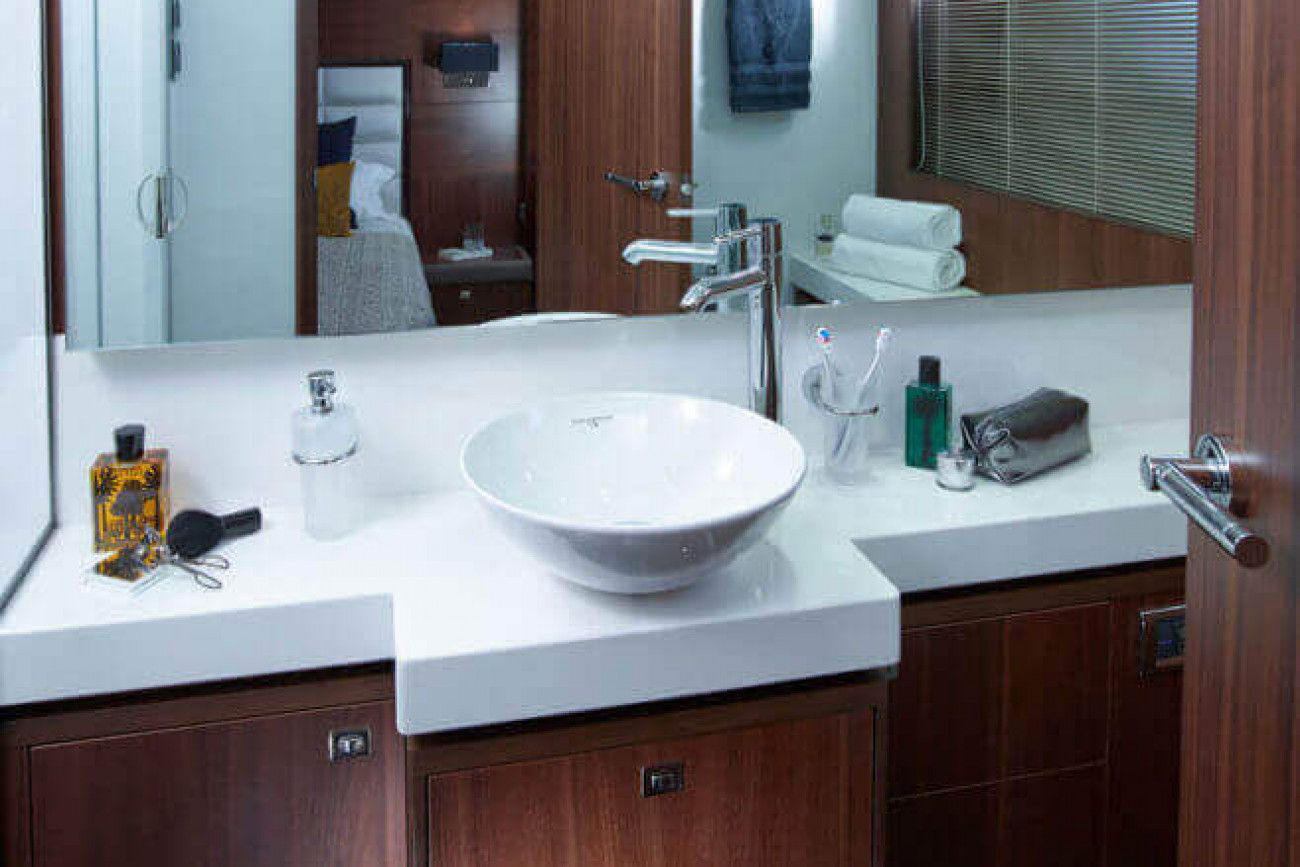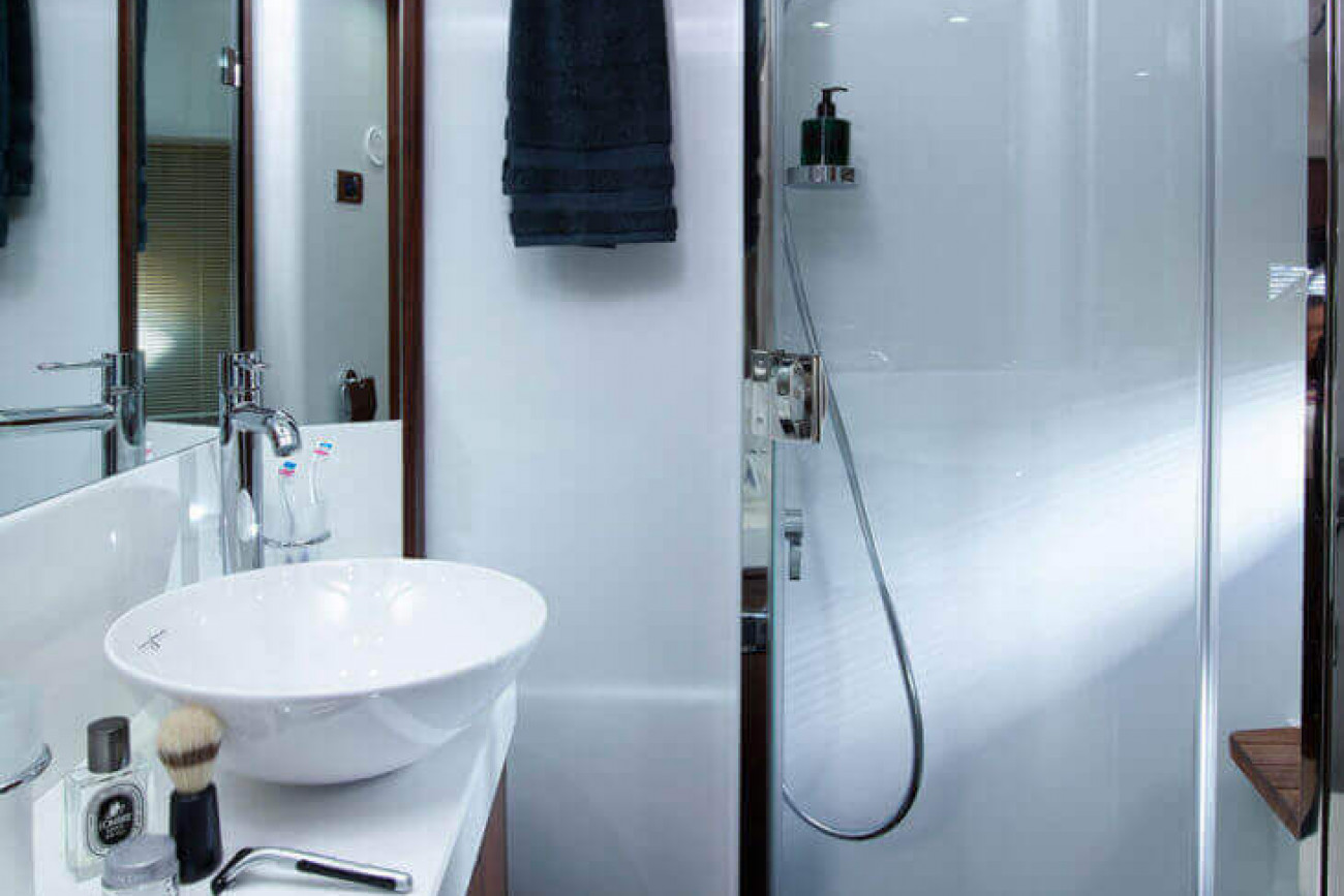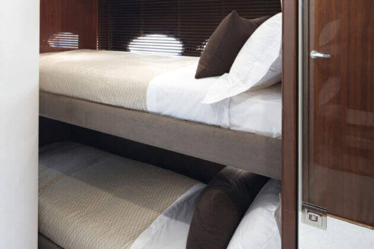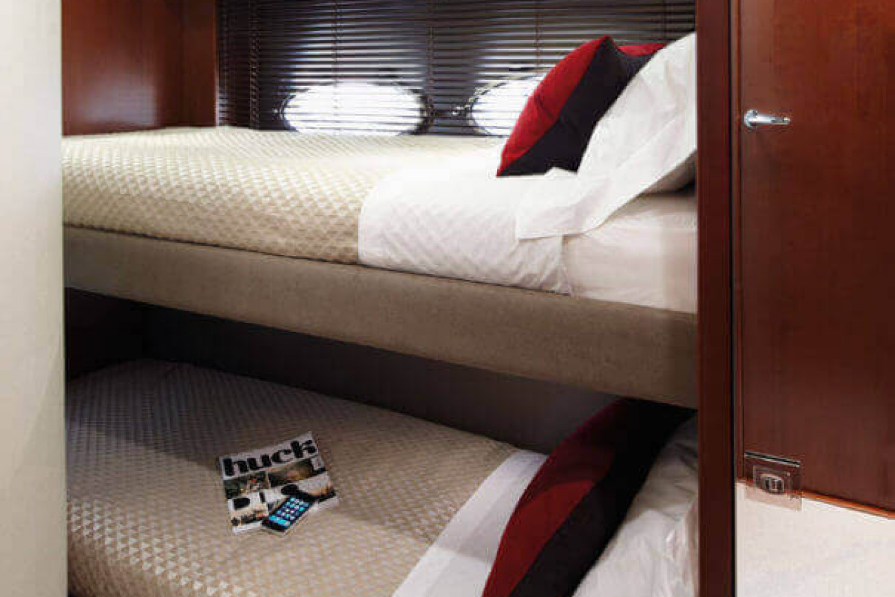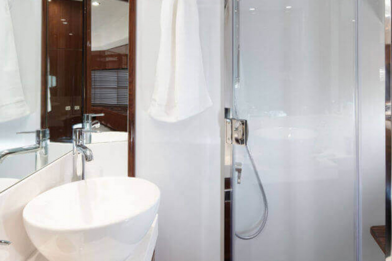 Bakom sin eleganta, sportiga profil döljer sig en oerhört rymlig 4-kabins motoryacht. Det är imponerande för en yacht av den här klassen, men kanske ännu mer så då inget tyder på att man kompromissat någonstans. En VIP-svit med badrum och ytterligare två gästkabiner ger lyxigt boende för alla dina gäster, men den magnifika fullbreddskabinen midskepps, som är upplyst av enorma skrovfönster, ger mer känslan av “’boutiquehotell” än “motoryacht”!