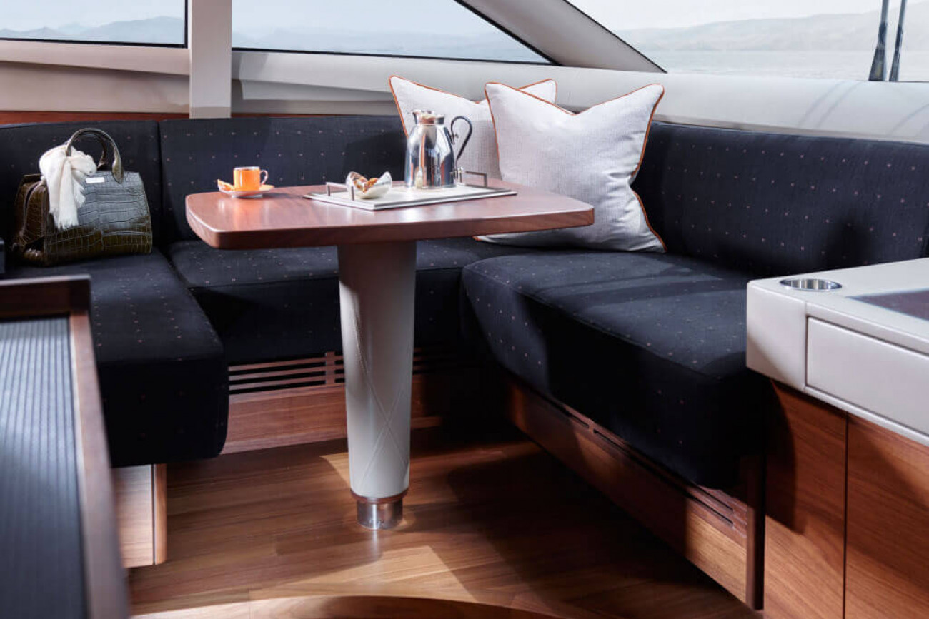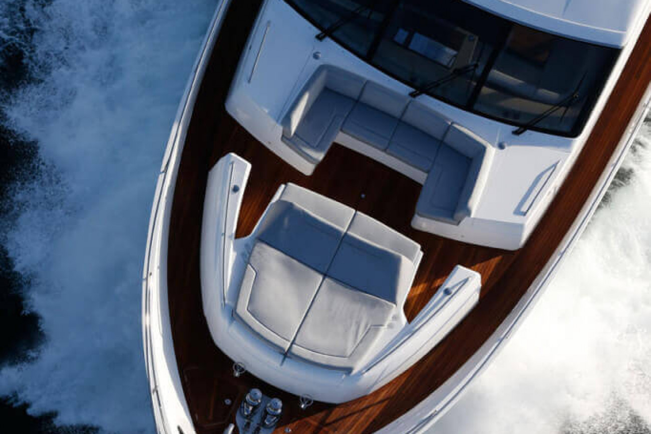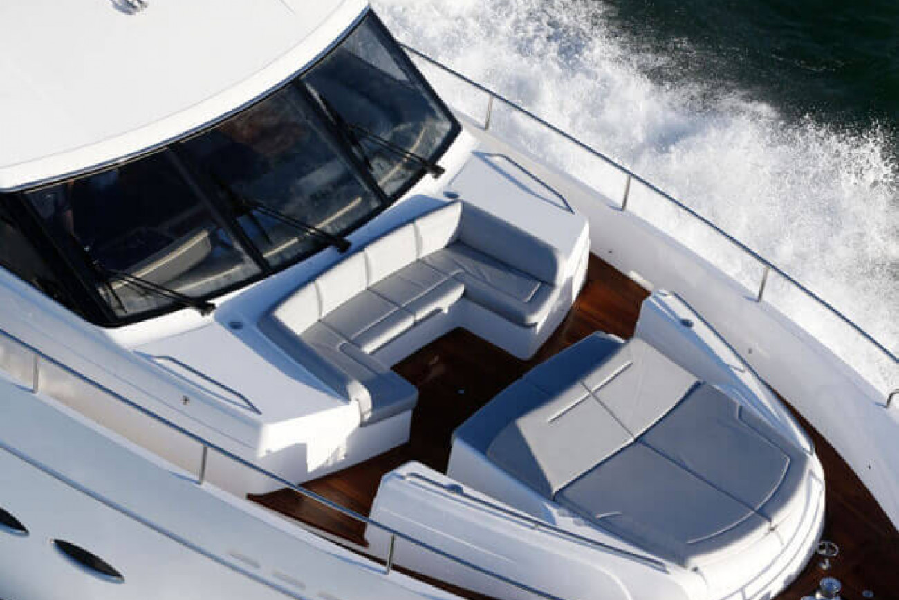 Motstående bänkar och en stor soldyna betyder att det finns gott om plats vid skeppets bog. Med den stora flybridgen och väldiga förarkabinen finns det gott om plats för dinering och umgänge. Om du vill gå ännu ett steg kan vi även installera en bubbelpool åt dig!