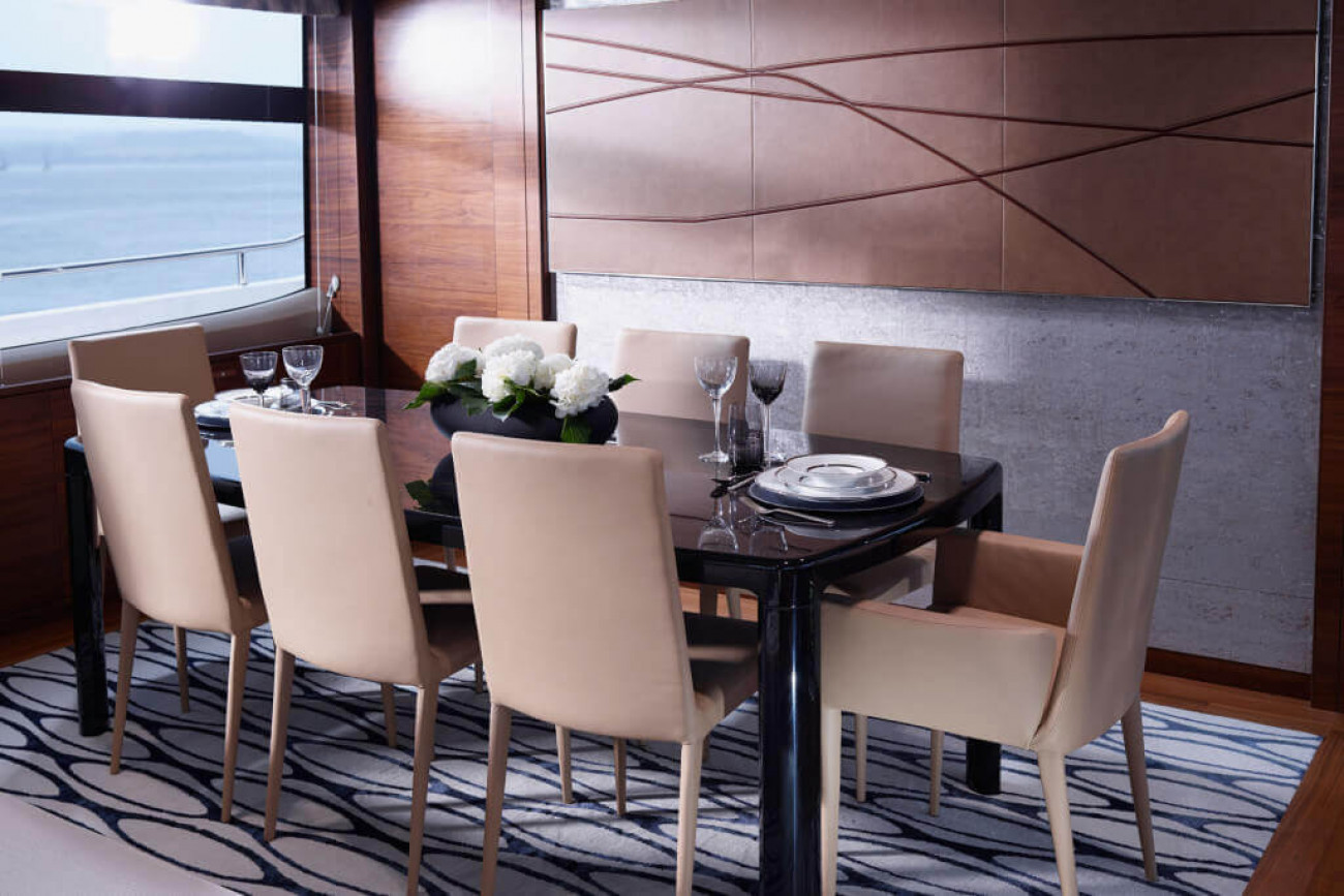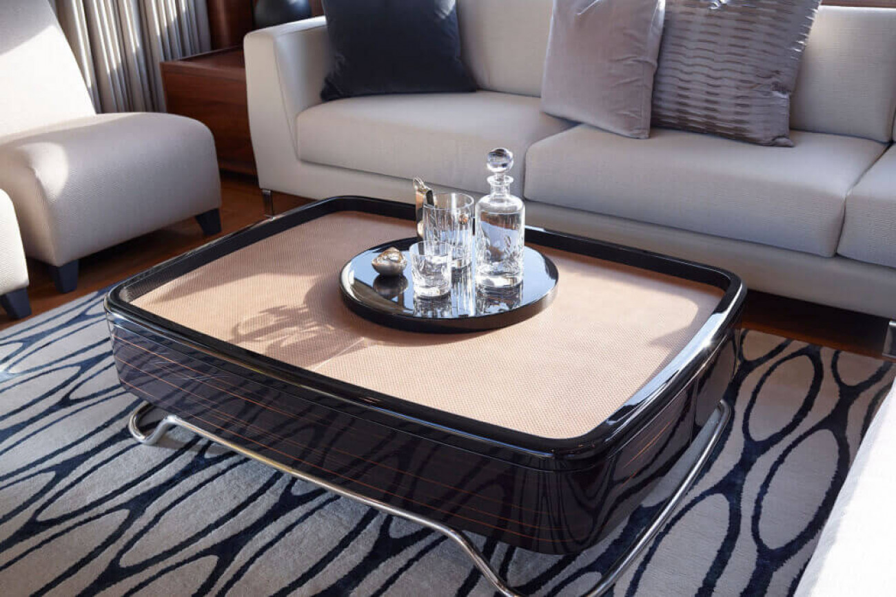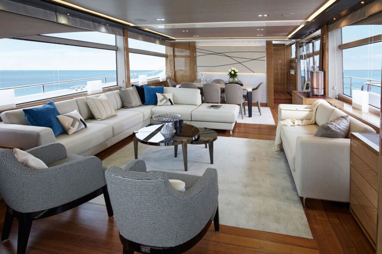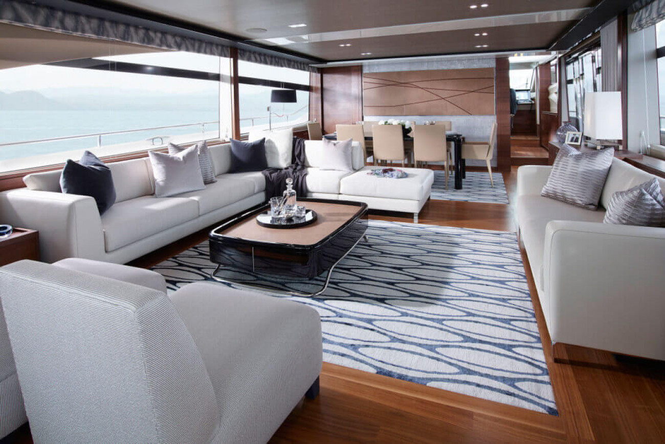 Den invändiga designen och detaljutformningen är exceptionell, med de finaste textilier och den bästa finish. Den stora salongen och konventionellt designade matsalen är utsökt möblerad och badar i ljus från stora panoramafönster på båda sidor. Styrhytten och det välutrustade pentryt, med eget matrum, för besättningen är skilda från gästutrymmena och har egna ingångar, vilket garanterar fullständig ostördhet.