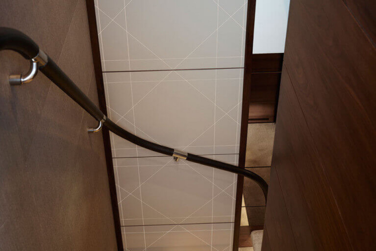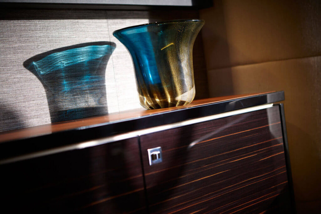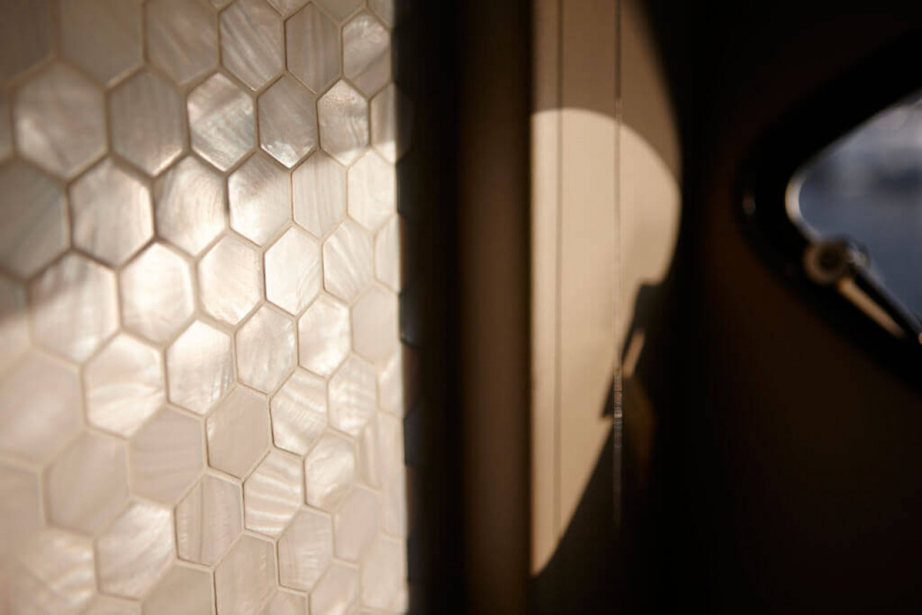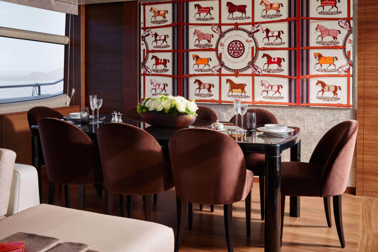 Den invändiga designen och detaljutformningen är exceptionell, med de finaste textilier och den bästa finish. Den stora salongen och konventionellt designade matsalen är utsökt möblerad och badar i ljus från stora panoramafönster på båda sidor. Styrhytten och det välutrustade pentryt, med eget matrum, för besättningen är skilda från gästutrymmena och har egna ingångar, vilket garanterar fullständig ostördhet.