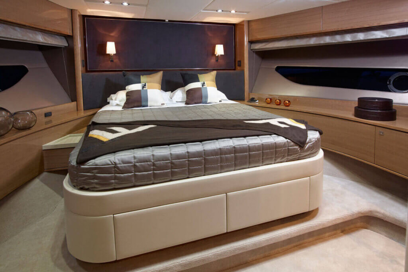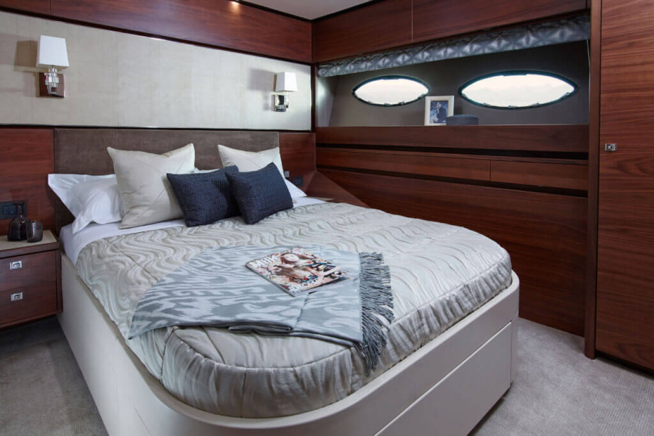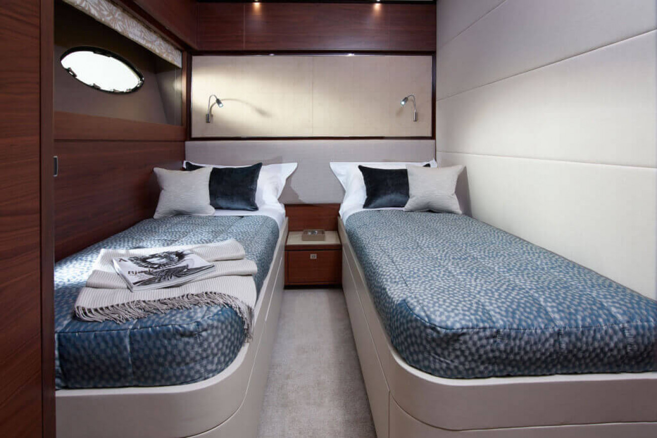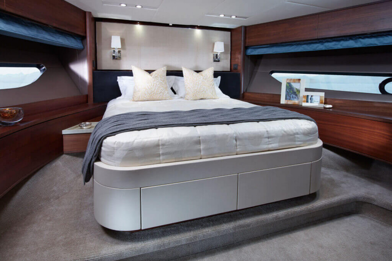 Bostadsutrymmena består av fyra kabiner med en VIP-svit i båtens bog, en dubbelkabin och en tvillingkabin samt en överdådig kaptenshytt midskepps. De nya ramlösa skrovfönstren samt hans-och-hennes handfat i badrummet gör detta till en verkligt speciell kabin. Det är också möjligt att få en utformning med fem kabiner, och med kaptenshytten delad i två mindre kabiner. Det är generöst med utrymme för besättningen akter om maskineriet (tre motoralternativ).