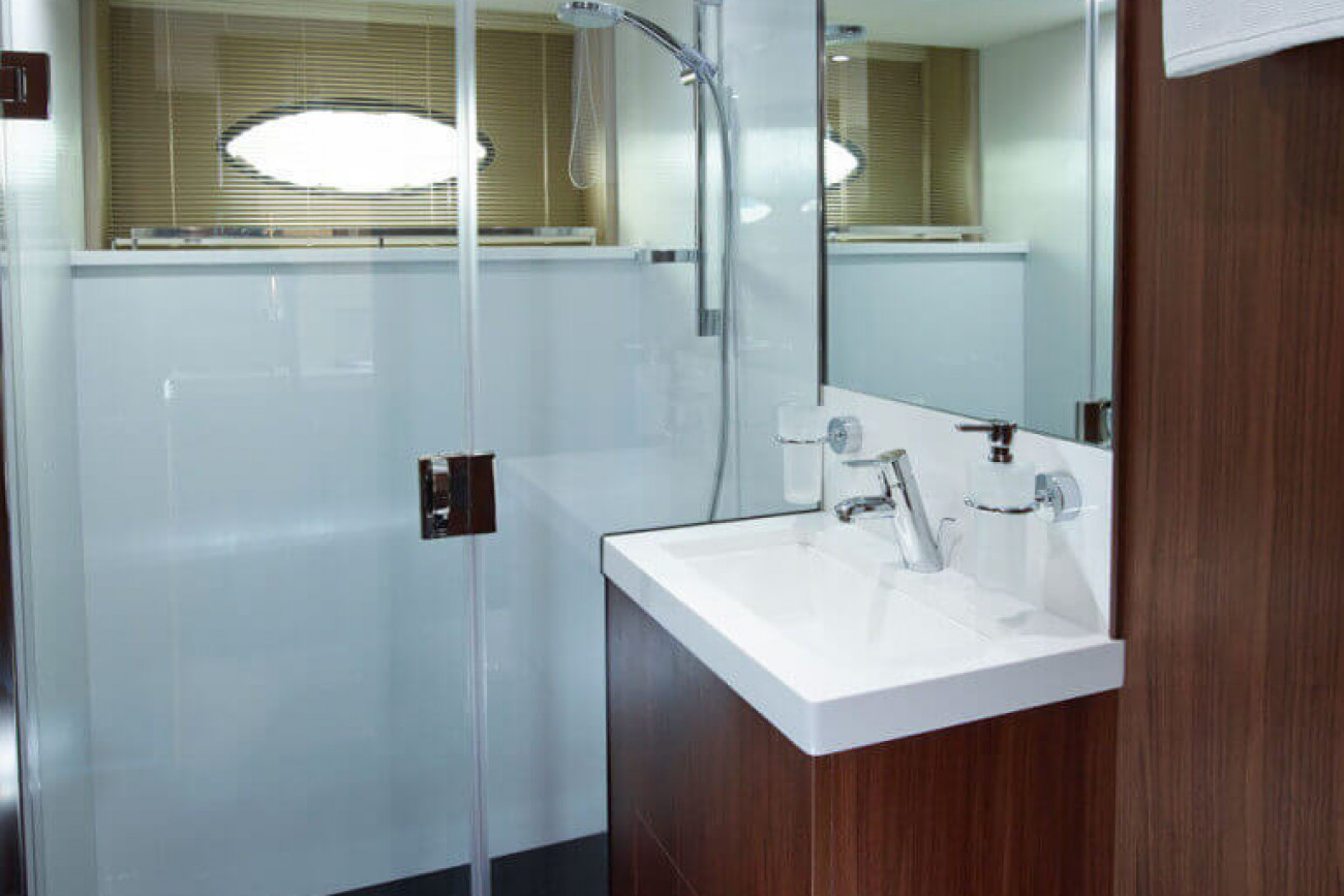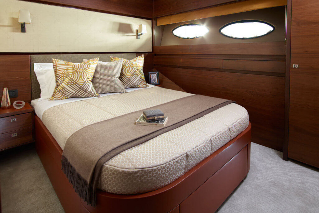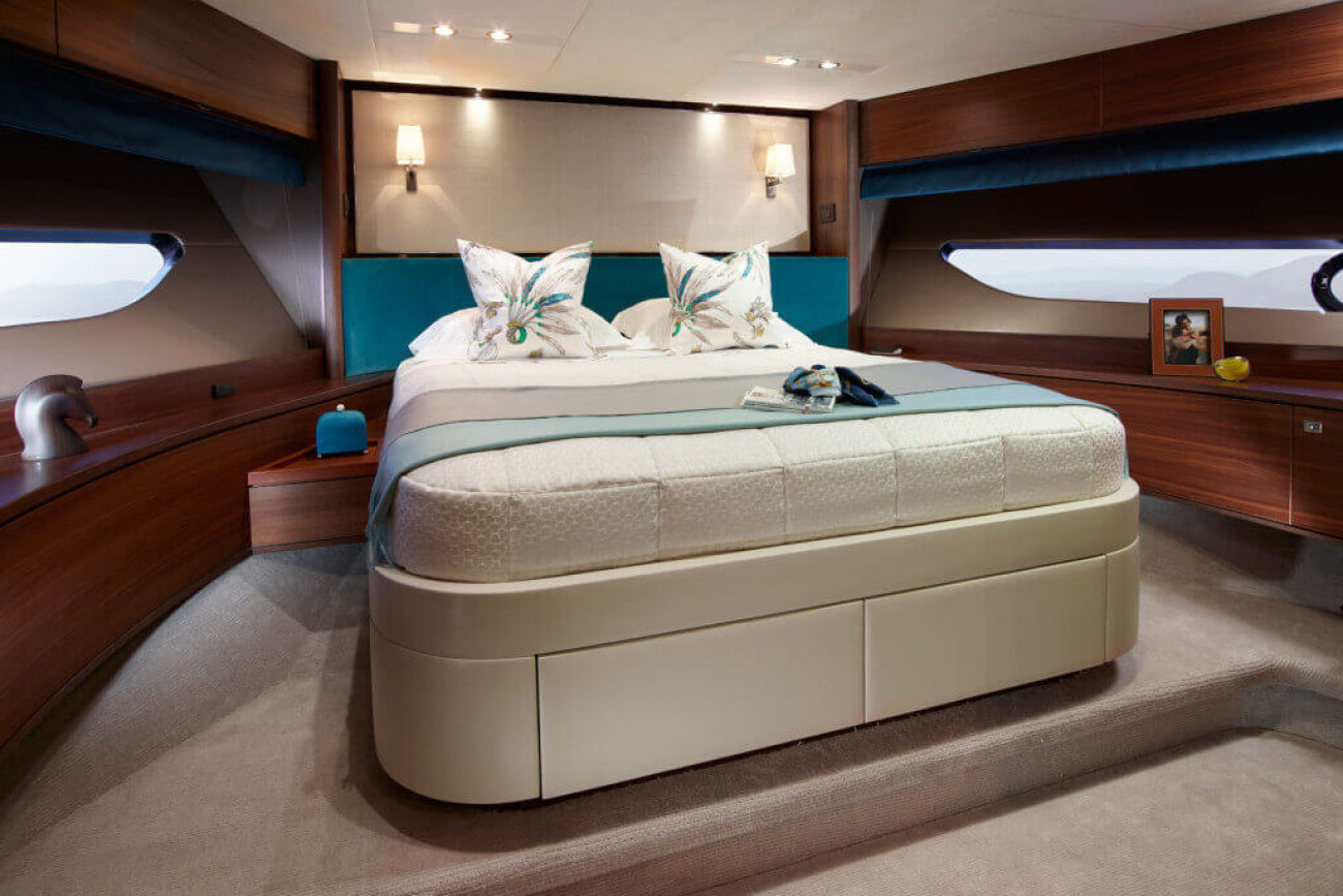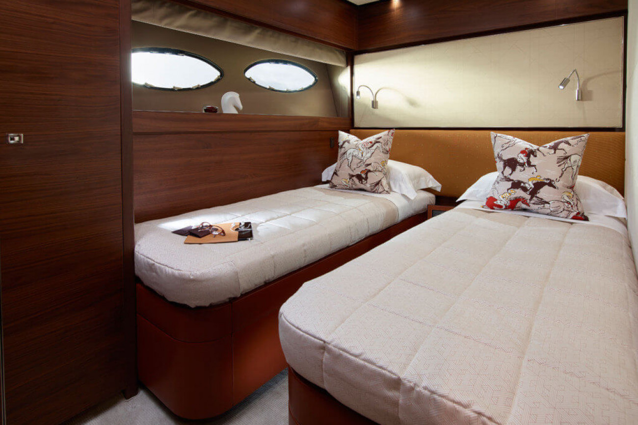 Bostadsutrymmena består av fyra kabiner med en VIP-svit i båtens bog, en dubbelkabin och en tvillingkabin samt en överdådig kaptenshytt midskepps. De nya ramlösa skrovfönstren samt hans-och-hennes handfat i badrummet gör detta till en verkligt speciell kabin. Det är också möjligt att få en utformning med fem kabiner, och med kaptenshytten delad i två mindre kabiner. Det är generöst med utrymme för besättningen akter om maskineriet (tre motoralternativ).