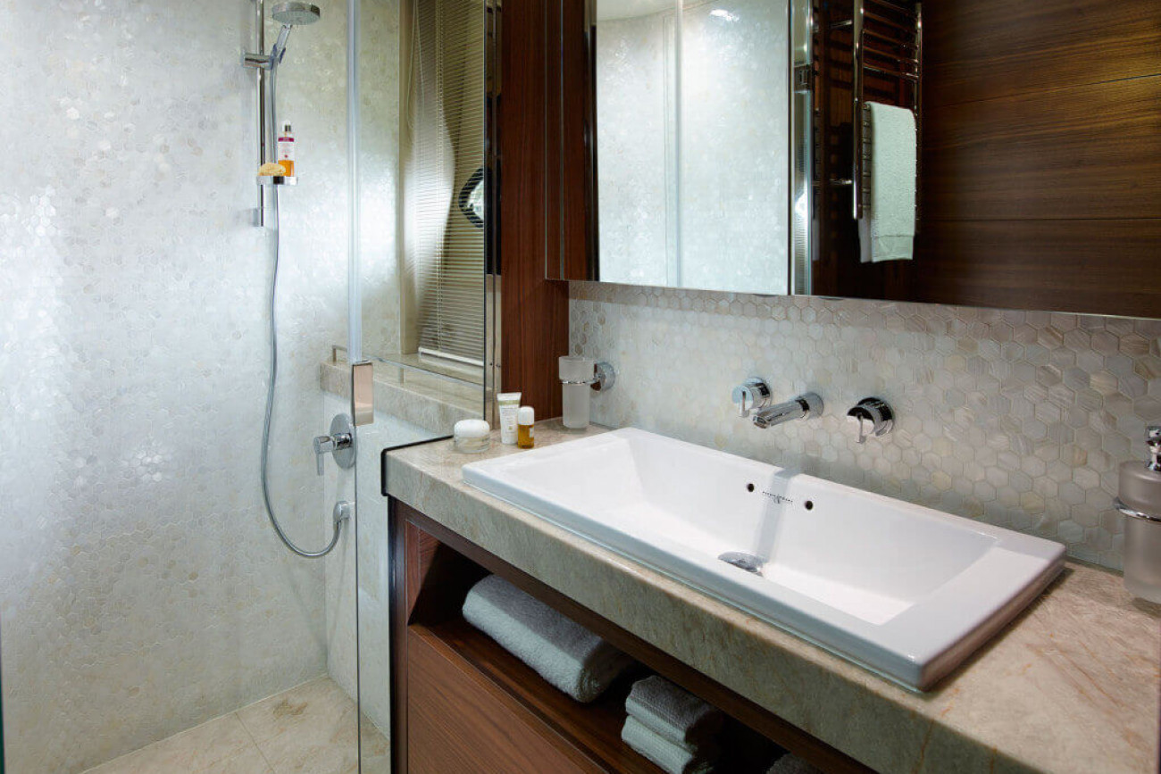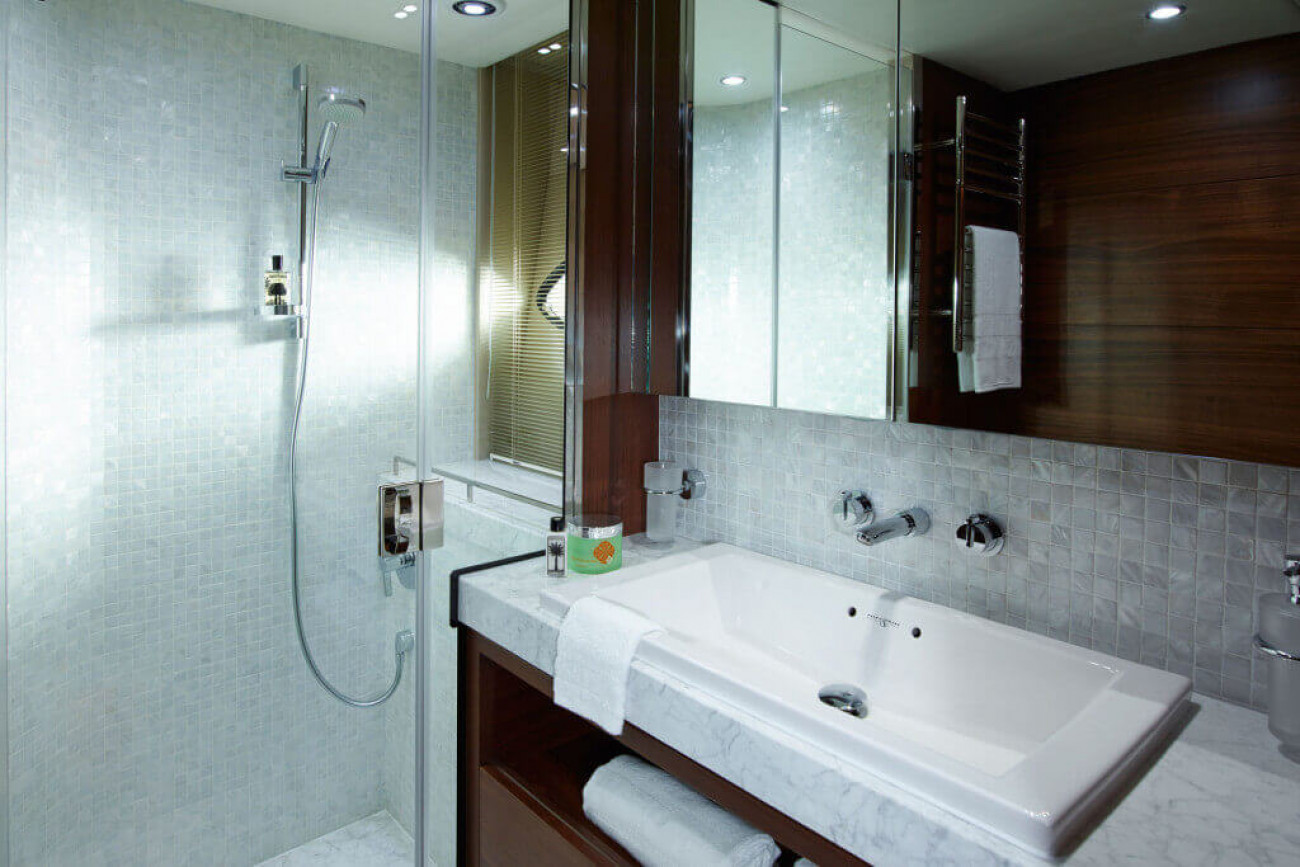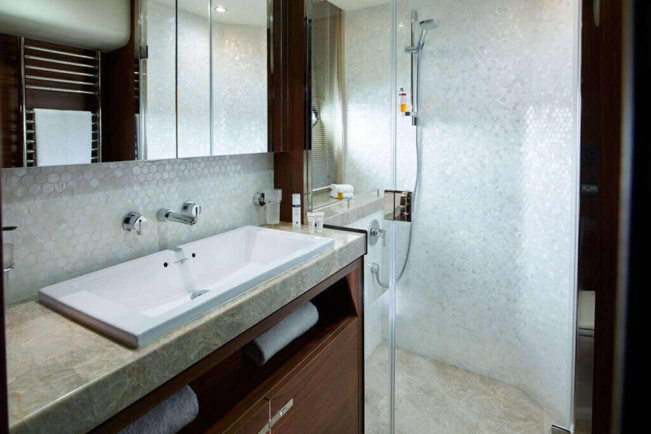 • Bathroom with separate stall shower, electric freshwater toilet and washbasin