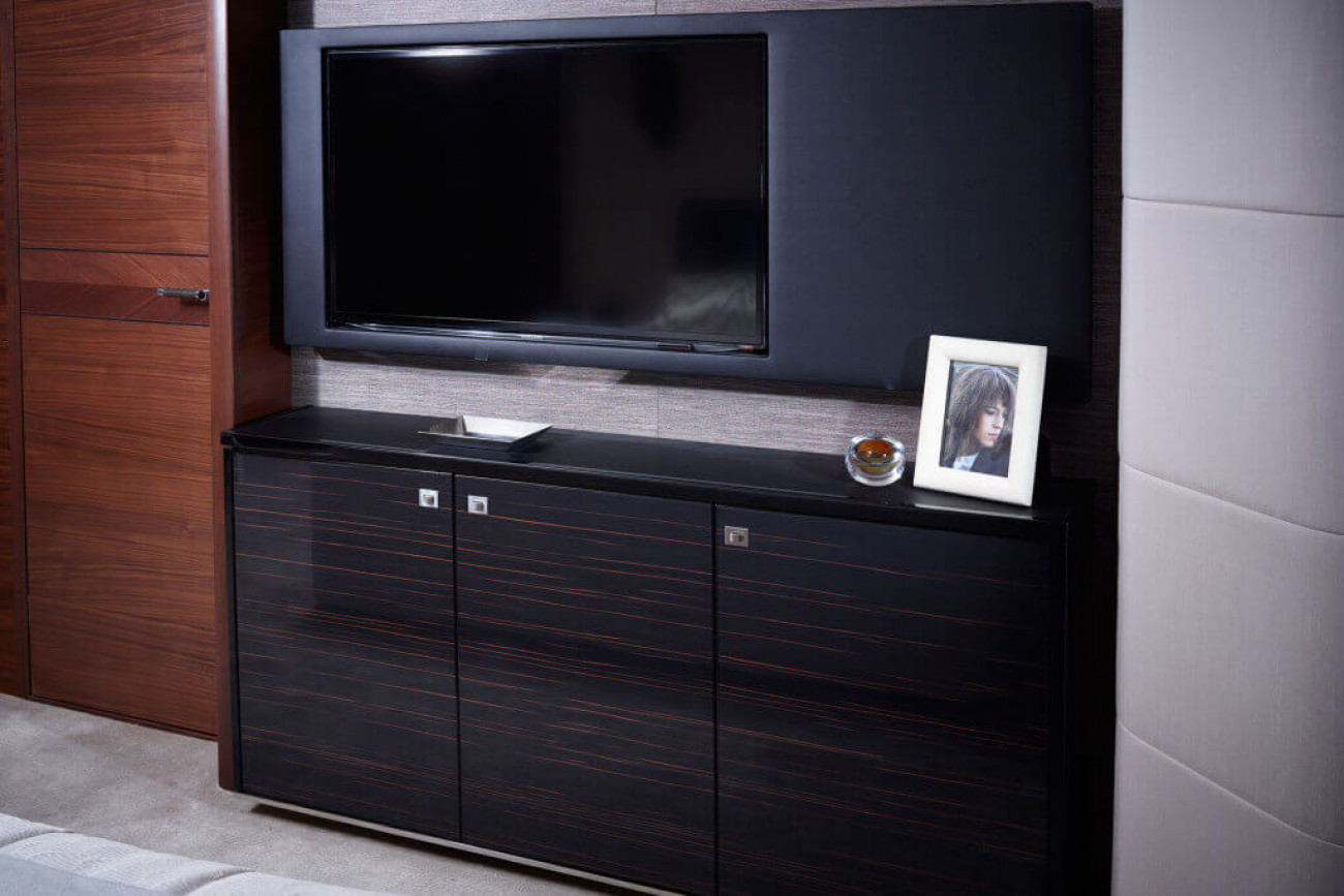• Entertainment centre incorporating 50” HD LED TV on electric raise/lower mechanism and DVD, radio/MP3 system with surround sound system