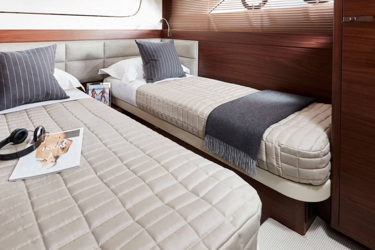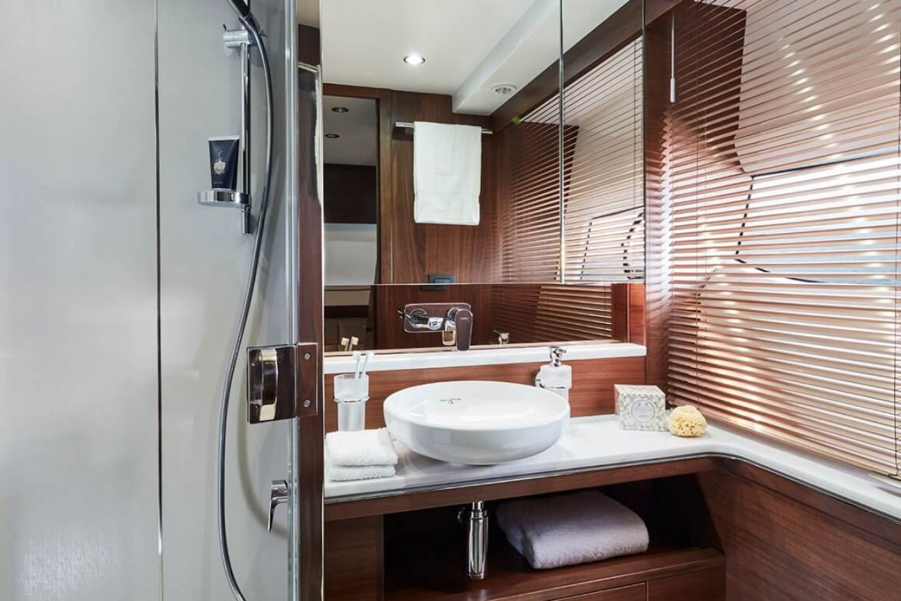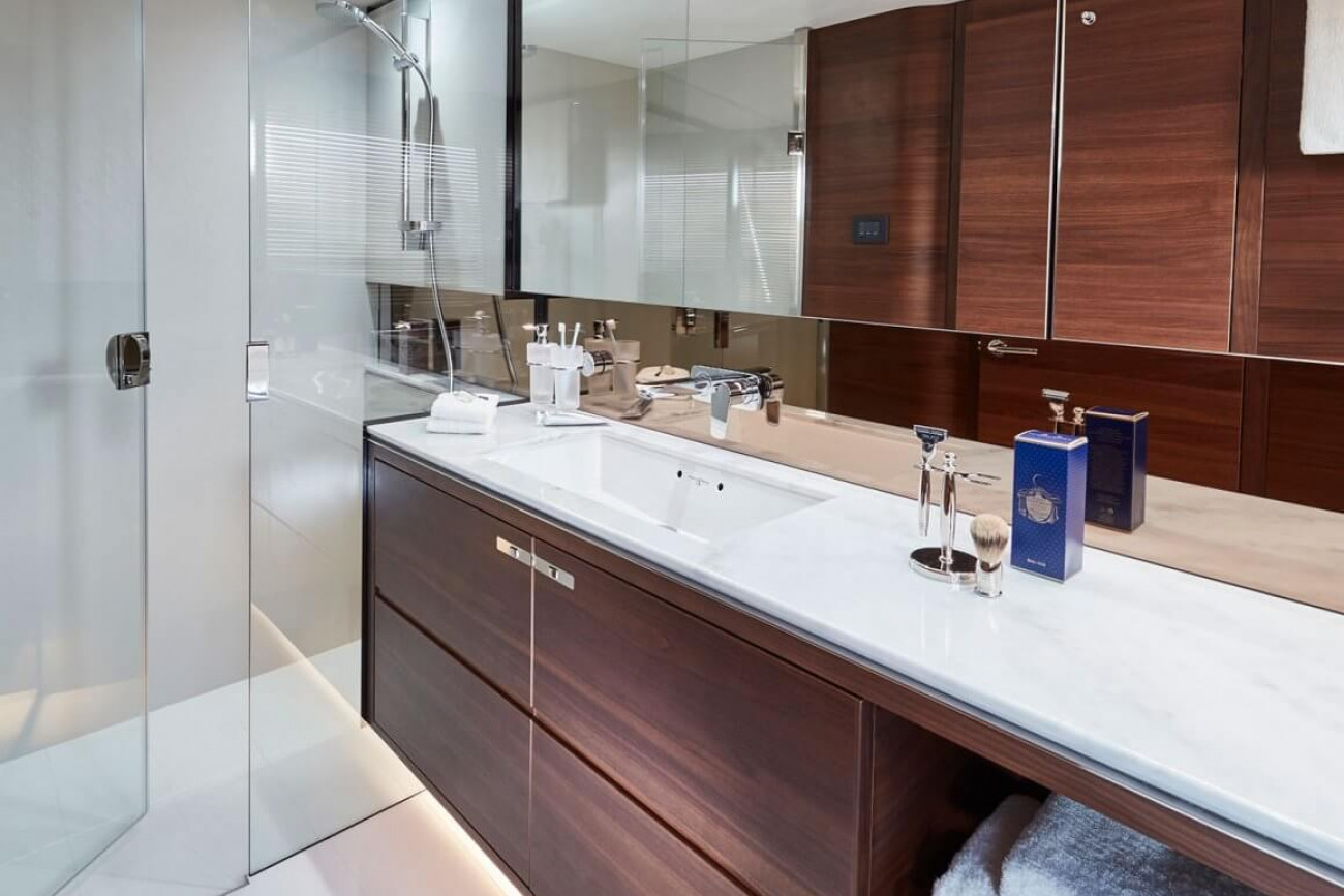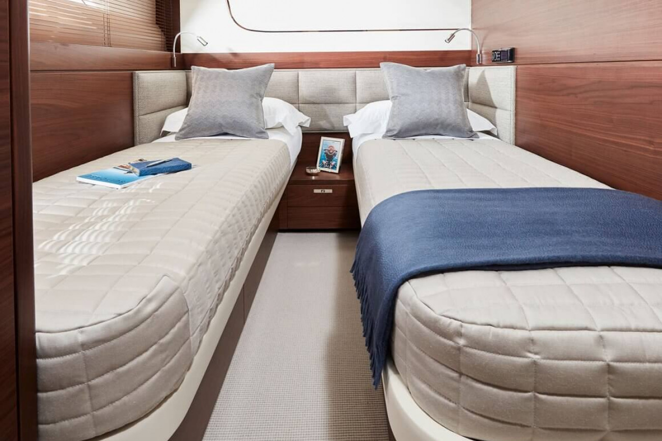 Definierat av detaljrika, handgjorda möbler och textiler, spelar hennes interiörytor med texturer och ljus. Mjuk mocka, bronsfärgad spegel, handsydda detaljer och japanska väggbeklädnader förenas i perfekt balans för en lockande effekt. Alla kabiner har eget badrum. Masterkabin har en privat trappingång, och den främre kabinen har en stor dubbelsäng. Ytterligare två gästkabiner förut och som tillval en extra besättningskabin med enkelbäddar med möjligheten att omvandlas till dubbel.