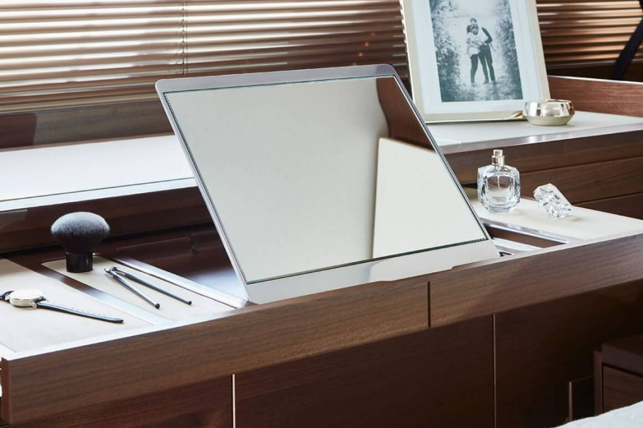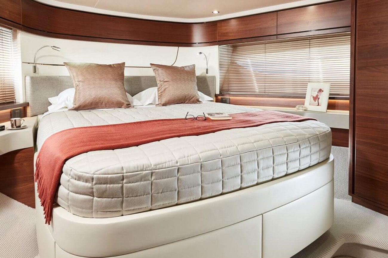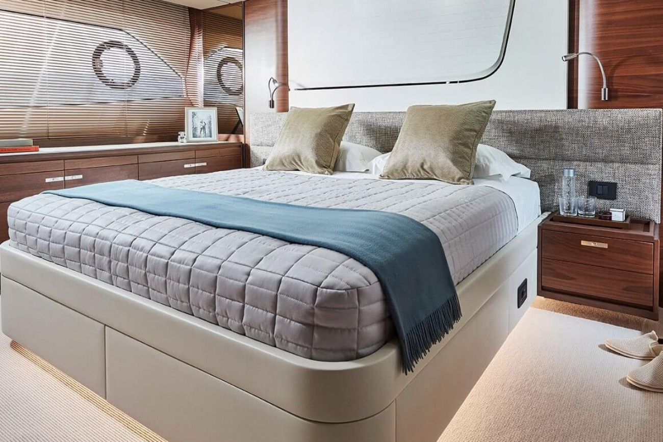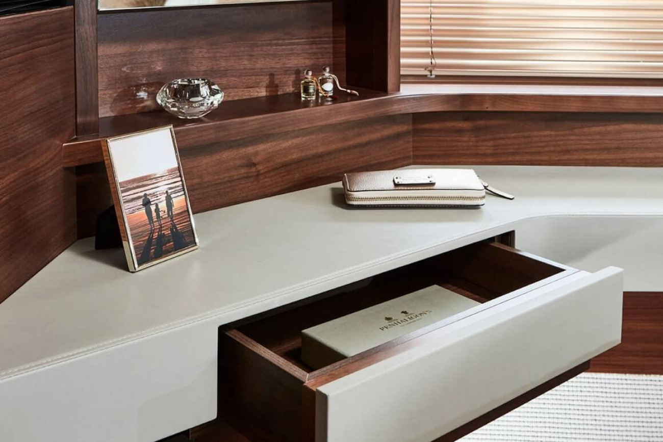 Definierat av detaljrika, handgjorda möbler och textiler, spelar hennes interiörytor med texturer och ljus. Mjuk mocka, bronsfärgad spegel, handsydda detaljer och japanska väggbeklädnader förenas i perfekt balans för en lockande effekt. Alla kabiner har eget badrum. Masterkabin har en privat trappingång, och den främre kabinen har en stor dubbelsäng. Ytterligare två gästkabiner förut och som tillval en extra besättningskabin med enkelbäddar med möjligheten att omvandlas till dubbel.
