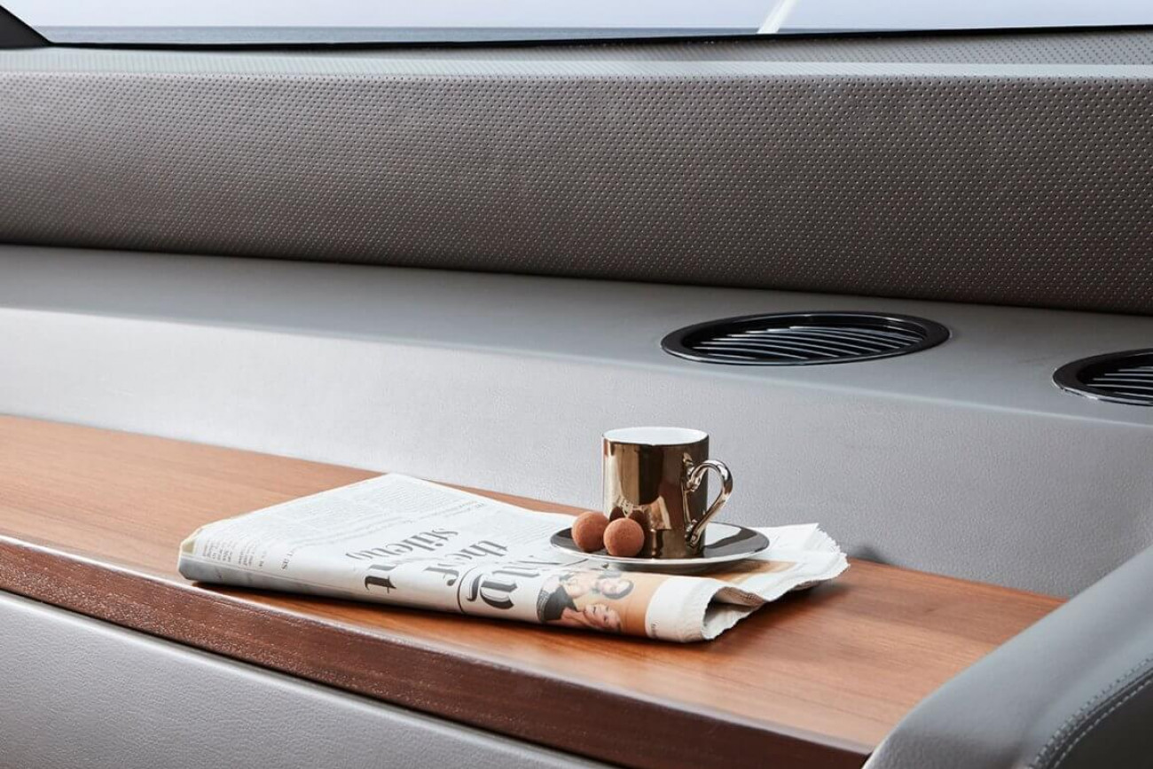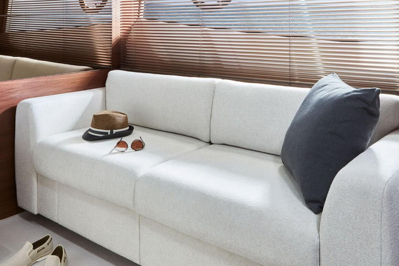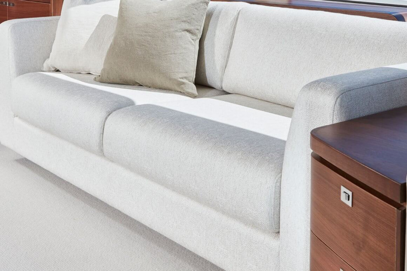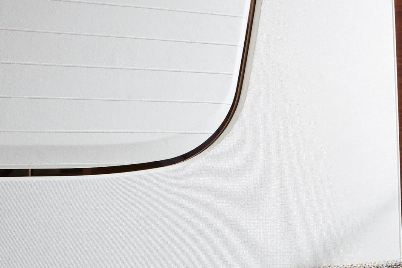 Definierat av detaljrika, handgjorda möbler och textiler, spelar hennes interiörytor med texturer och ljus. Mjuk mocka, bronsfärgad spegel, handsydda detaljer och japanska väggbeklädnader förenas i perfekt balans för en lockande effekt. Alla kabiner har eget badrum. Masterkabin har en privat trappingång, och den främre kabinen har en stor dubbelsäng. Ytterligare två gästkabiner förut och som tillval en extra besättningskabin med enkelbäddar med möjligheten att omvandlas till dubbel.