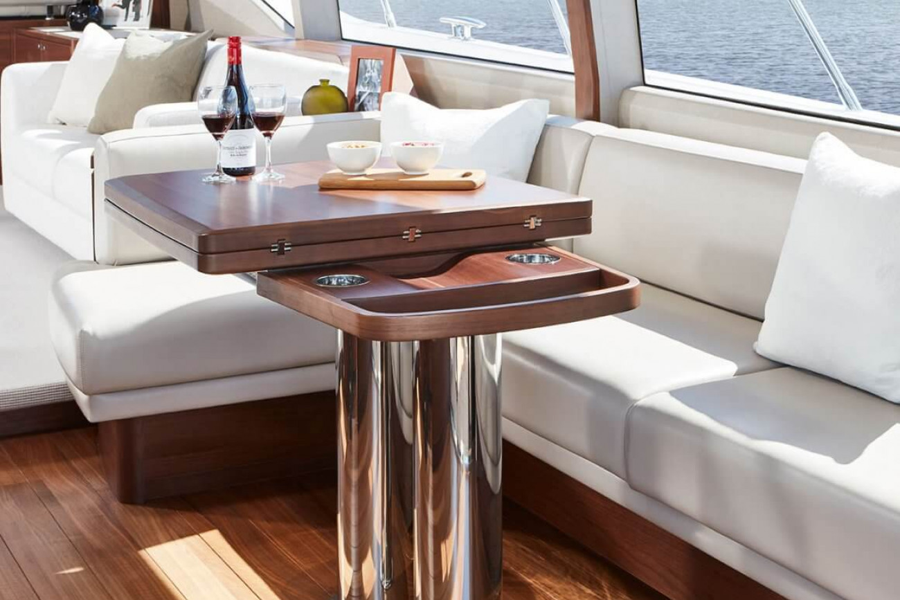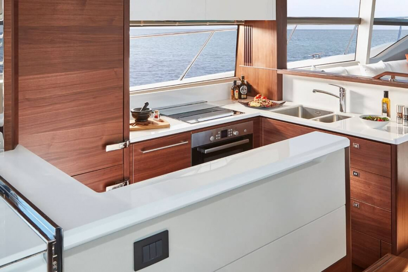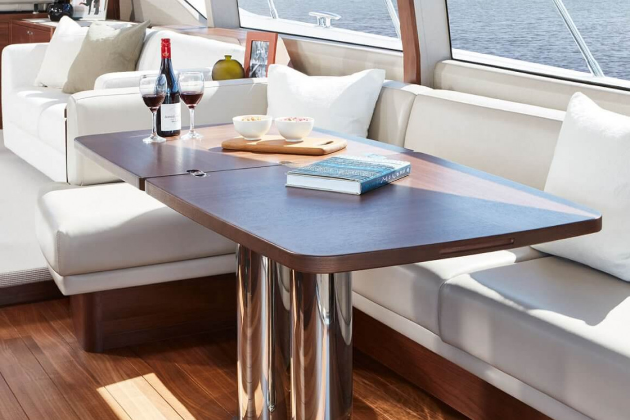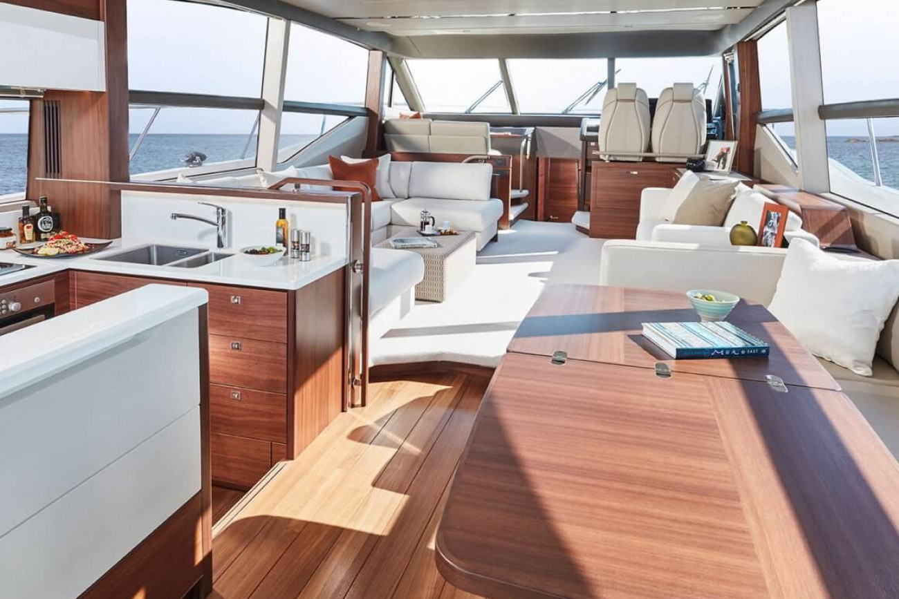 • Teak-laid decks to transom platform, steps to side decks, steps to flybridge and flybridge Timber-laid floor to galley and helm