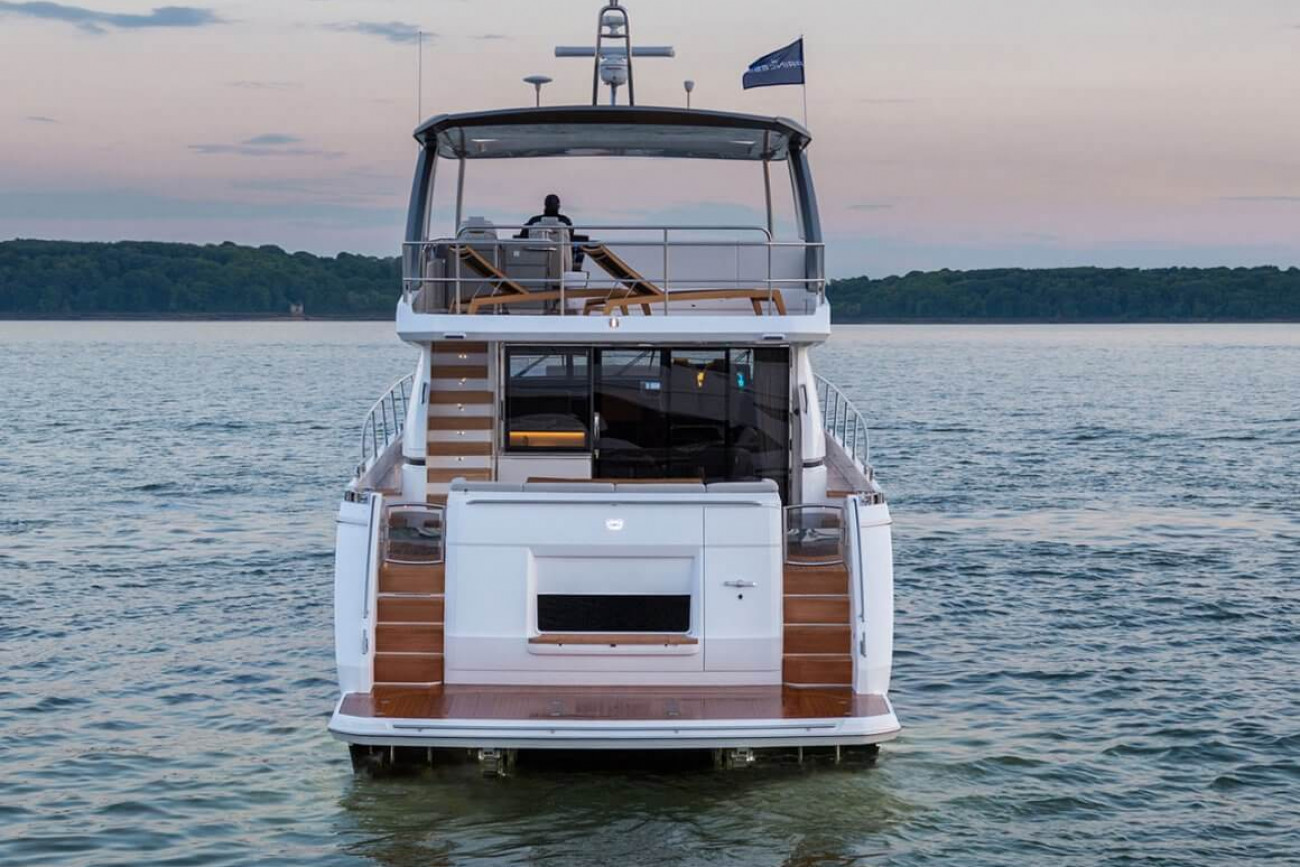 • Teak-laid transom platform, cockpit deck, flybridge, flybridge stairway and steps to side deck