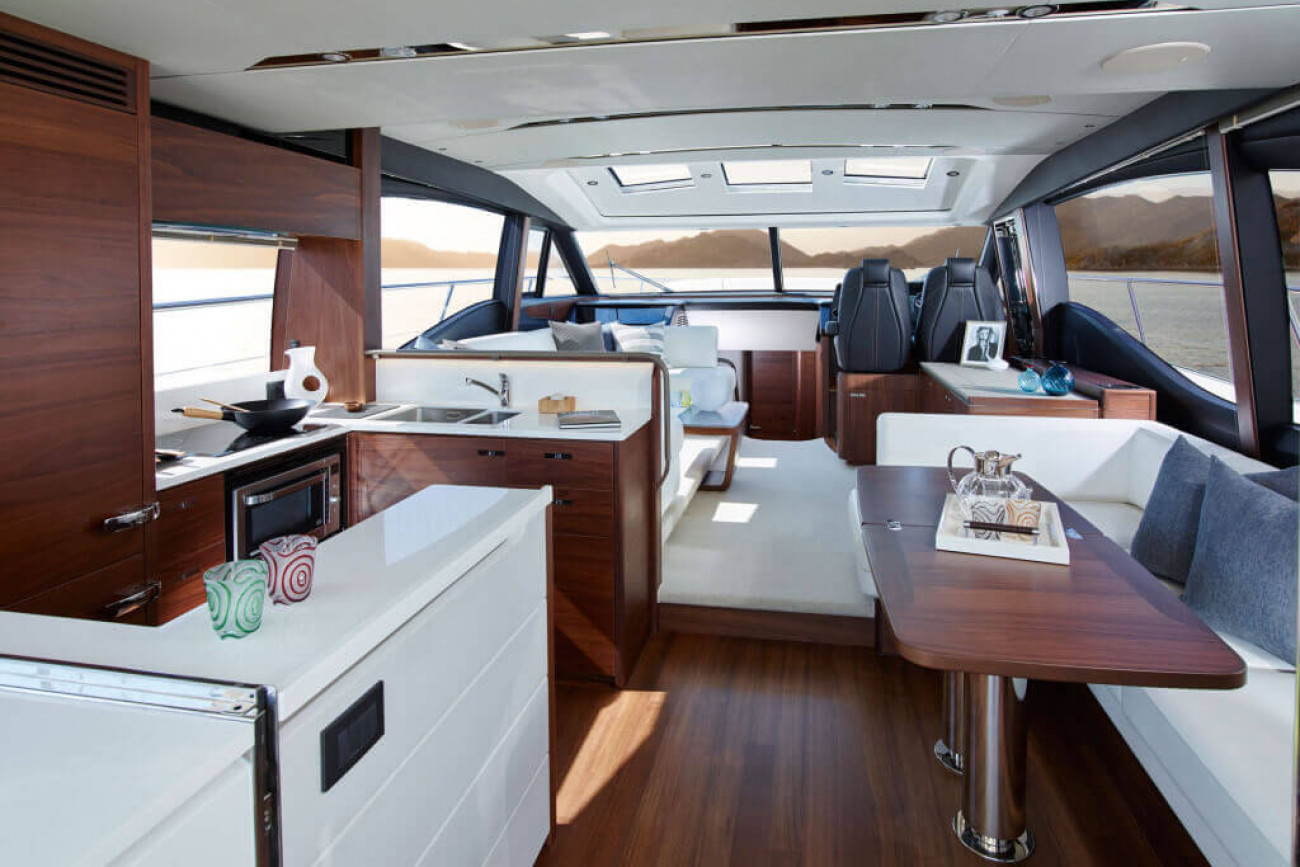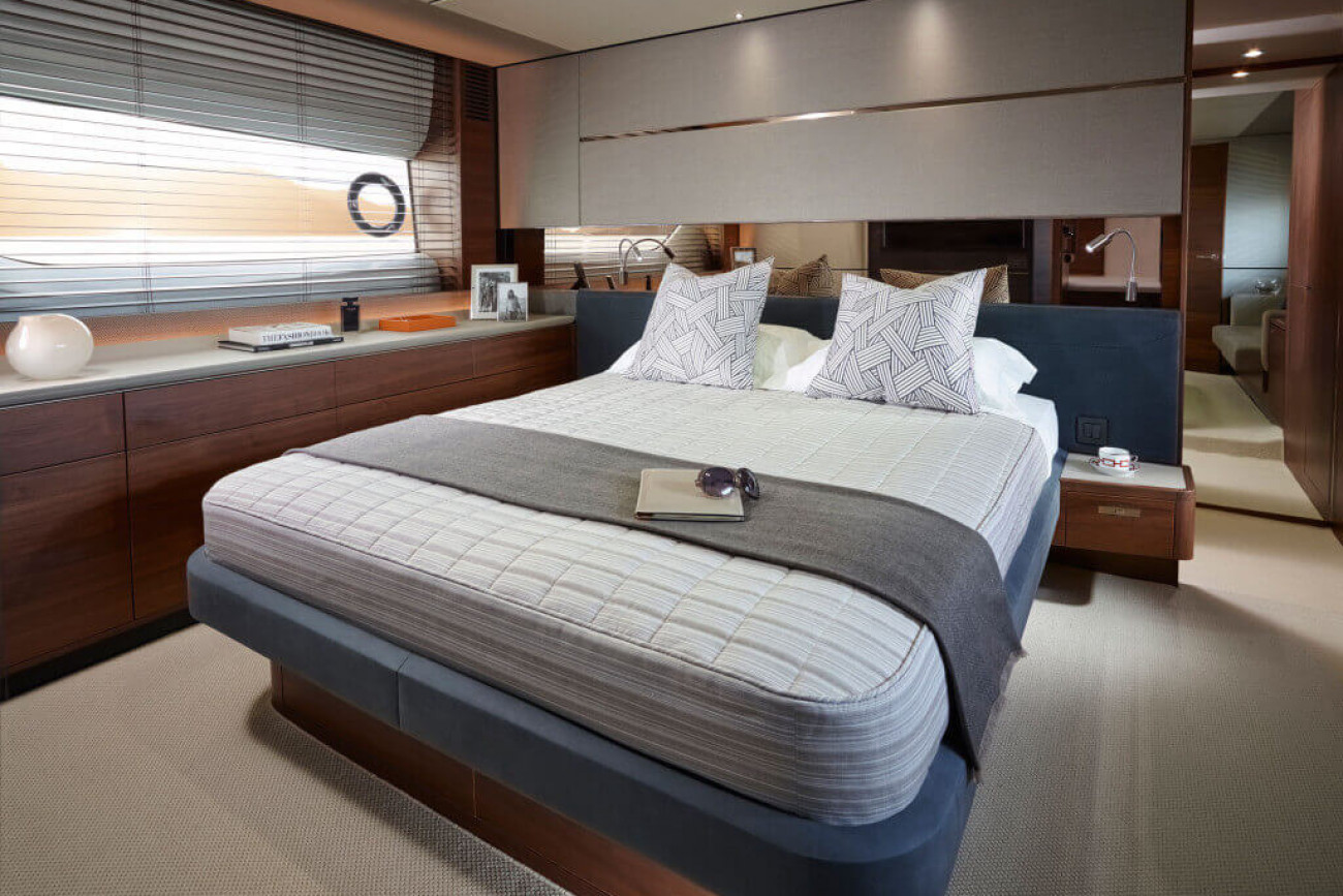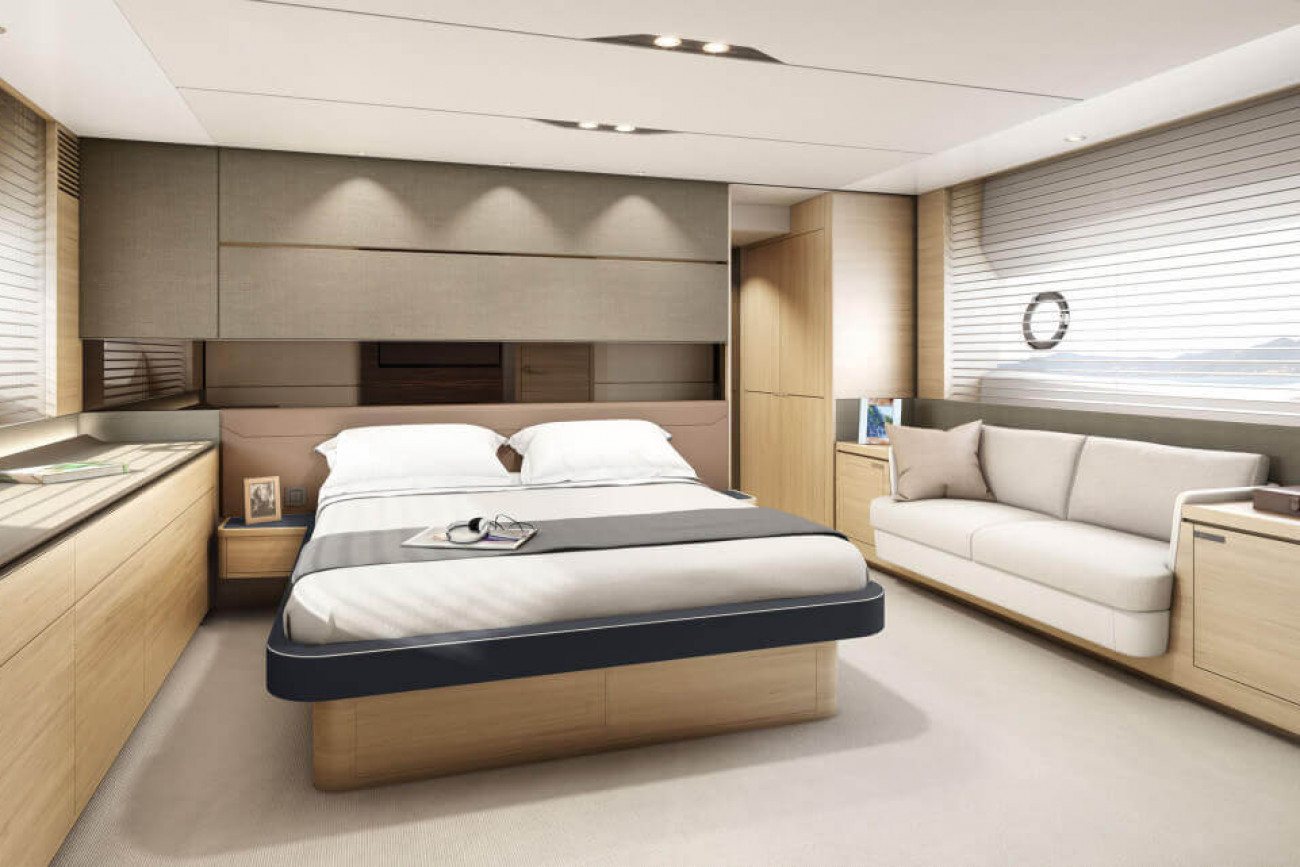 There’s an undeniable presence about the all-new S65, with her slender streamlined form that somehow also exudes a predatory air. A lightweight deep-V hull delivers on this promise with breathtaking agility up to 38 knots. When at anchor, peacefulness descends onto her generous well-appointed deck areas, which include a spacious foredeck seating area, whilst her hydraulic bathing platform and 3.3m tender garage become the perfect base for watersports. Her spacious interior features a sociable galley aft arrangement which opens out to the cockpit, whilst below deck eight guests are accommodated across four cabins, three of which are en suite.