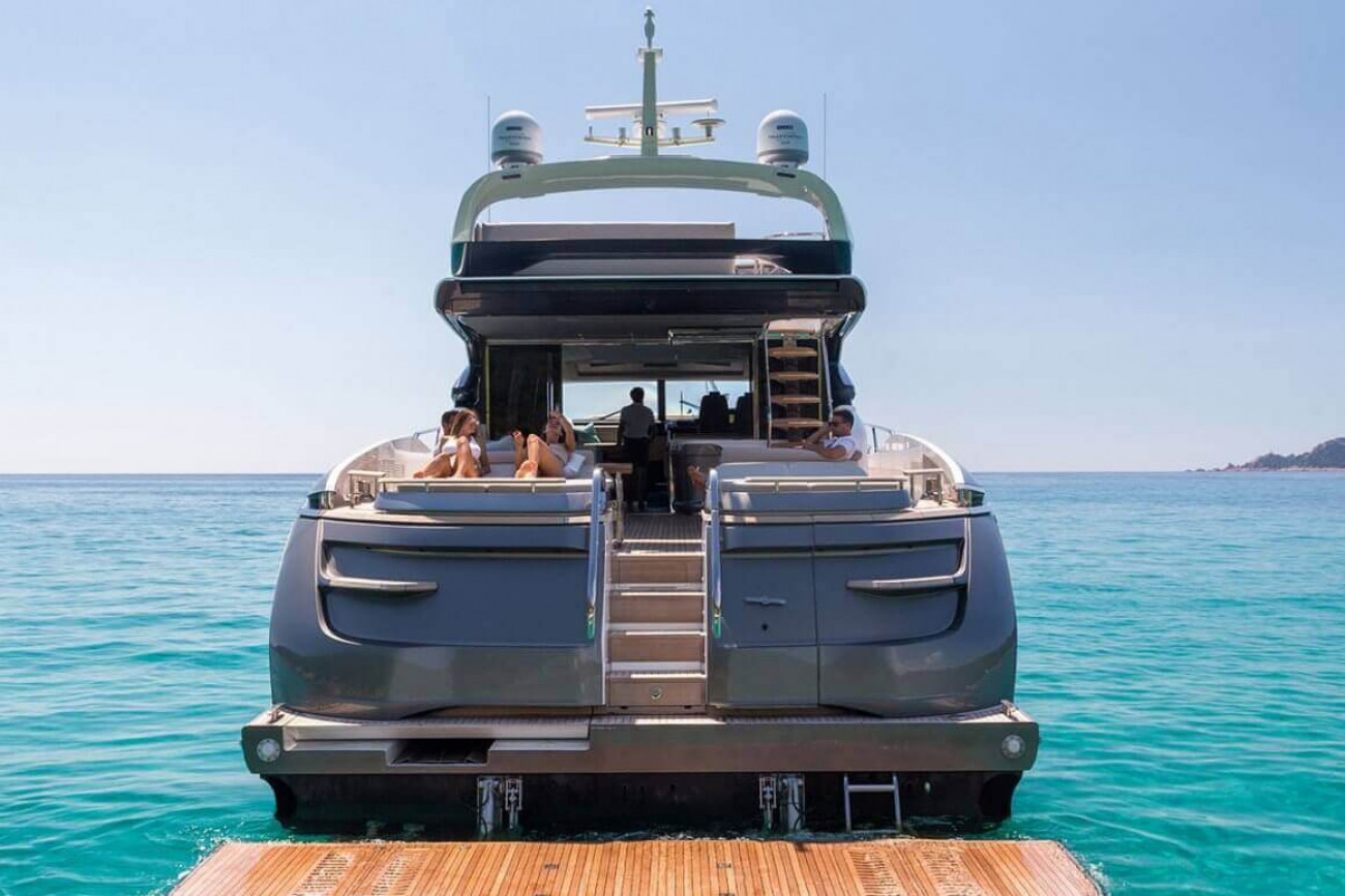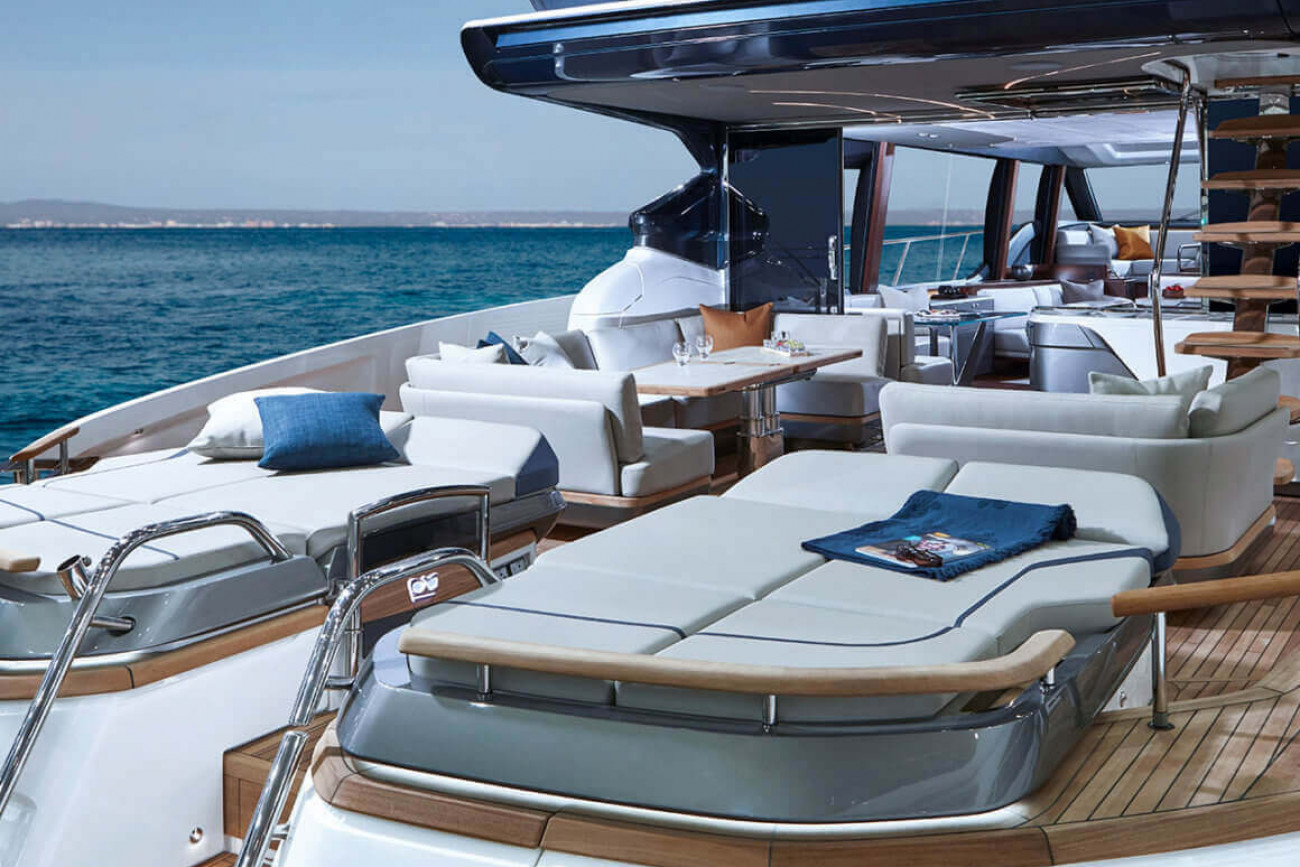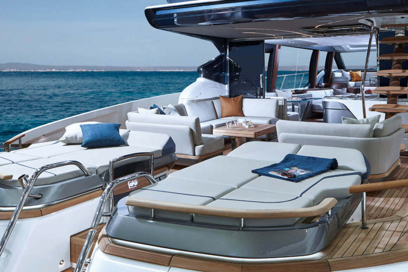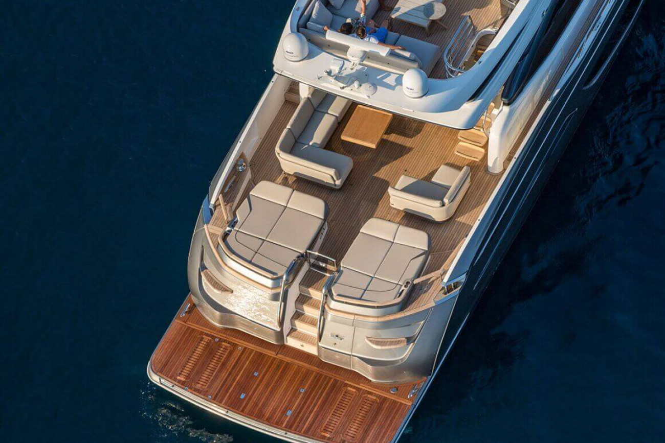 Twin aft sunbeds with lazarette and garage with electro-hydraulic door and tender launch system with electric winch below (4.45m tender)