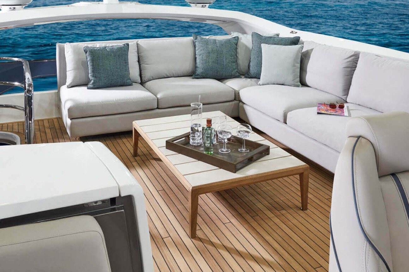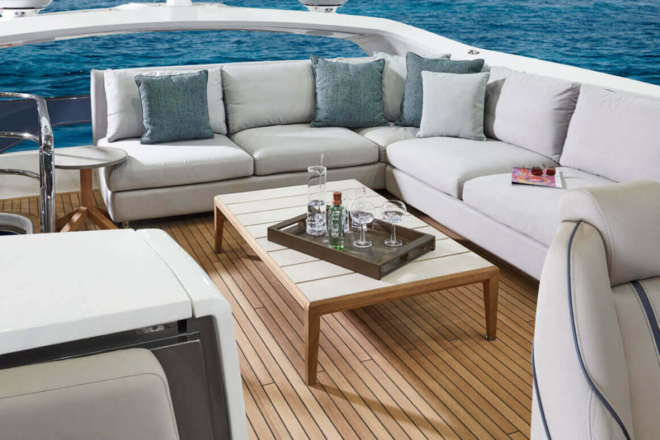 Teak-laid transom platform, cockpit deck, sportbridge, side decks and steps to side decks
