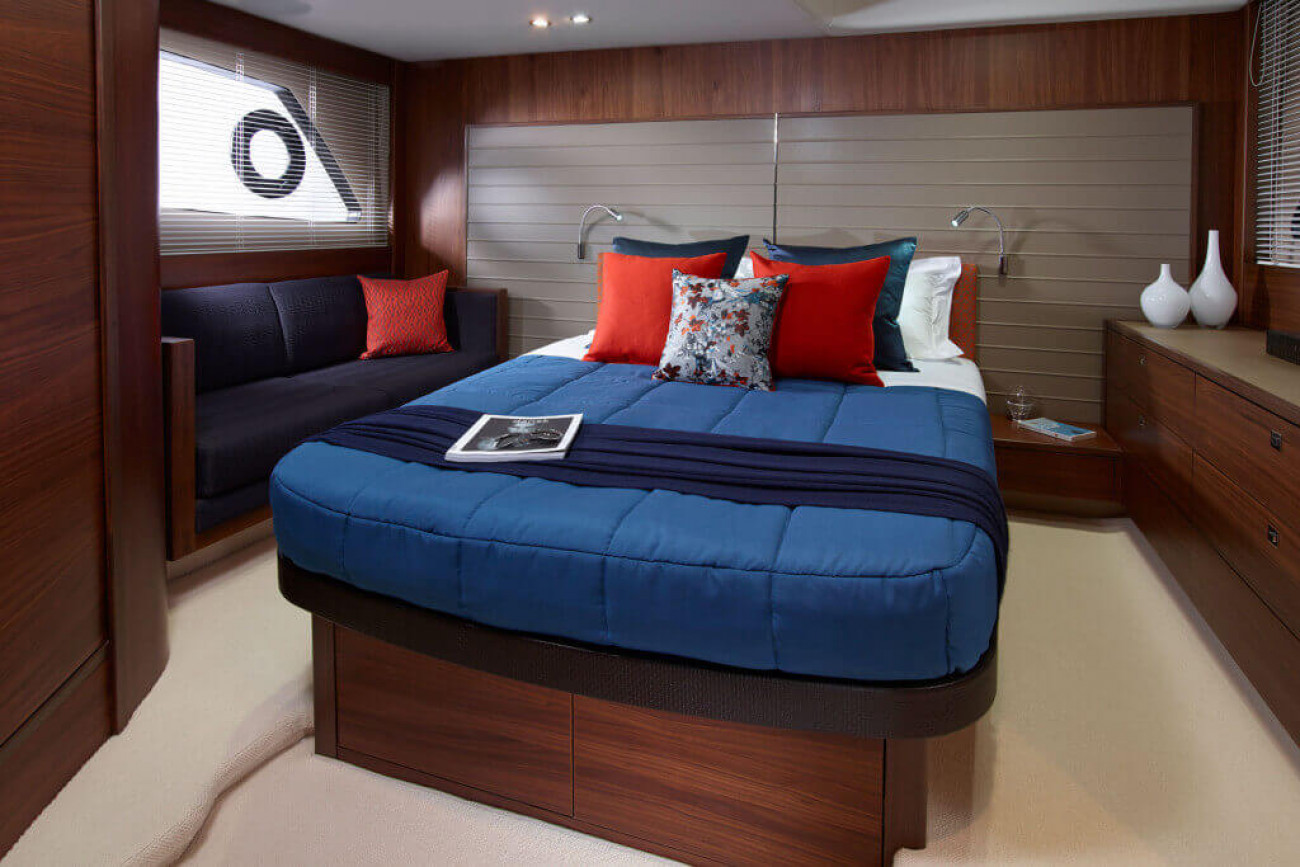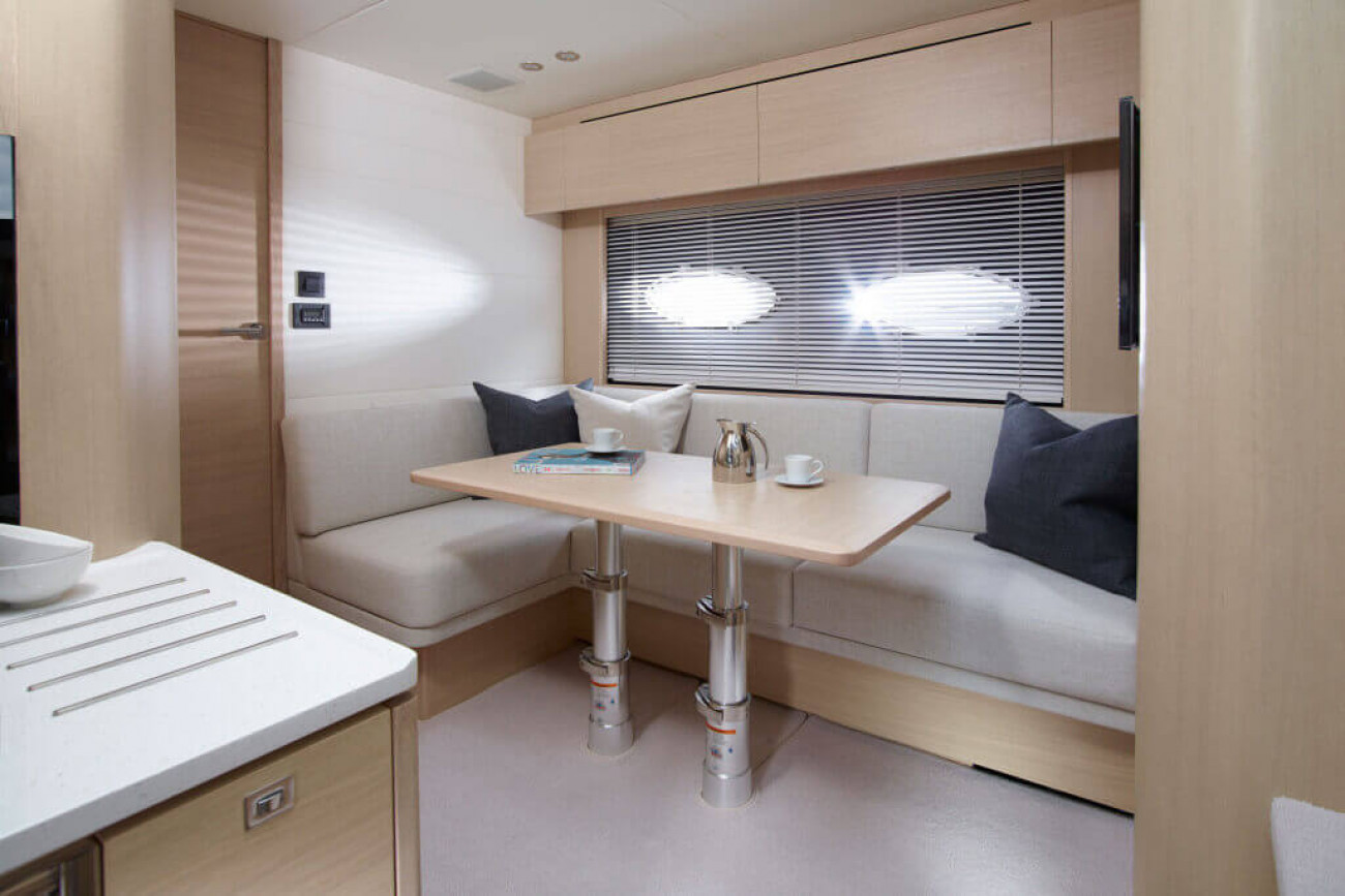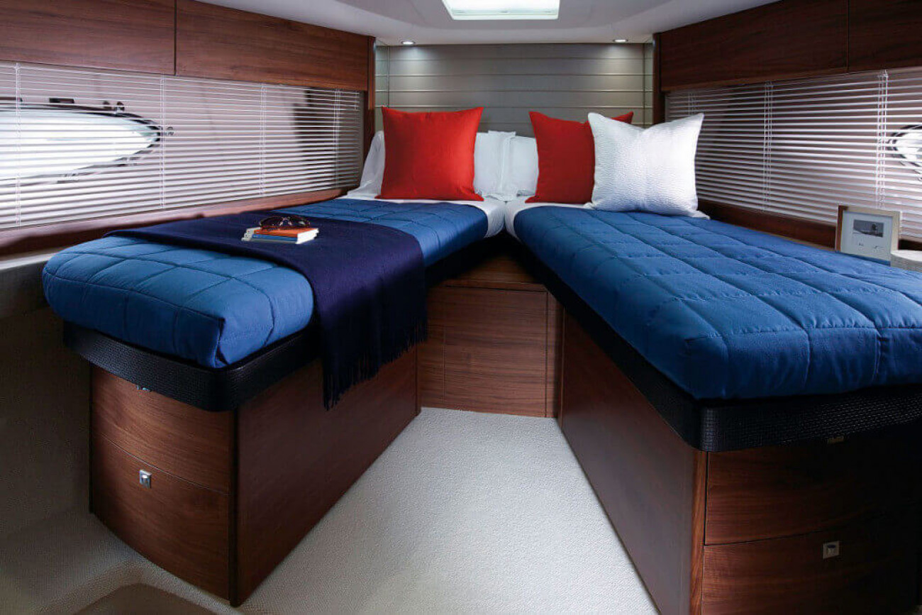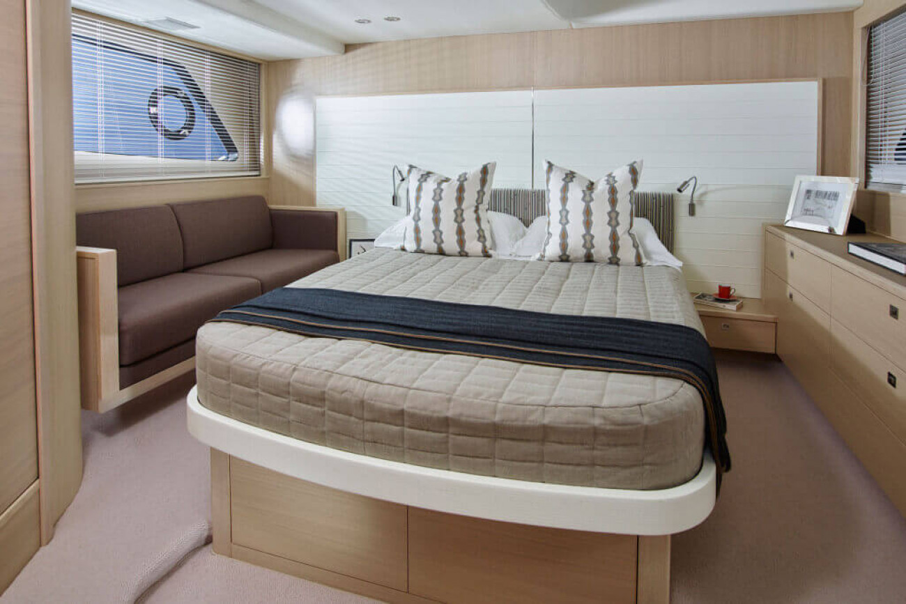 Utrymmena ombord får den här båten att verkligen sticka ut från andra i sin klass. I kaptenshytten midskepps med ståhöjd finns badrum och ett par enorma fönster nära vattenytan som ger utmärkt sikt – det här är mer som en häftig hotellsvit. Förkabinen har en dubbelbädd som enkelt delas i två och ovalformade fönster som släpper in rikligt med naturligt ljus.