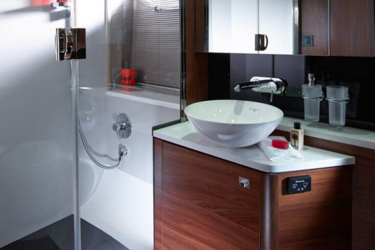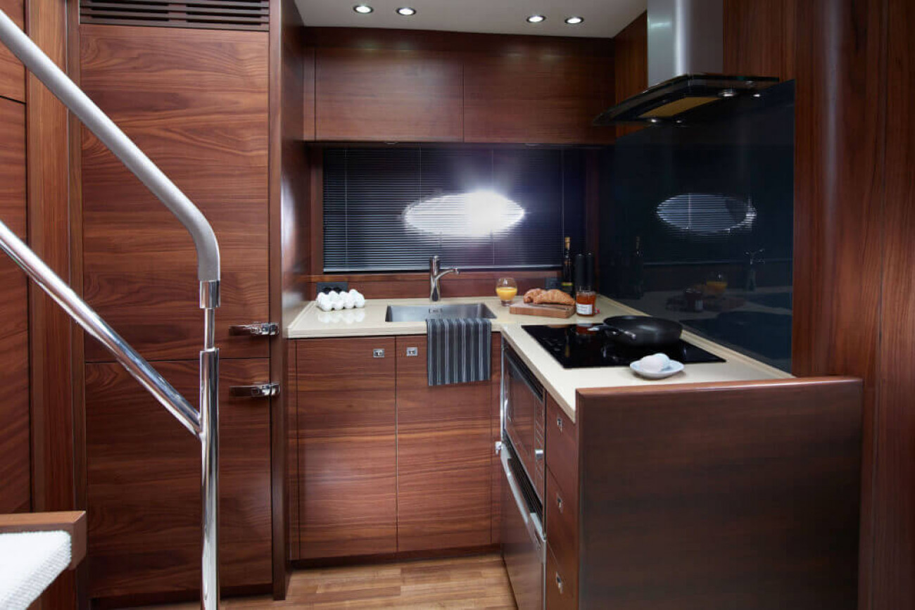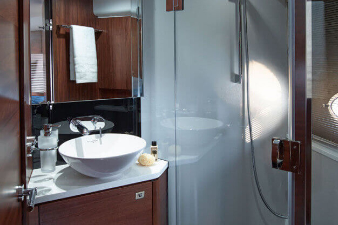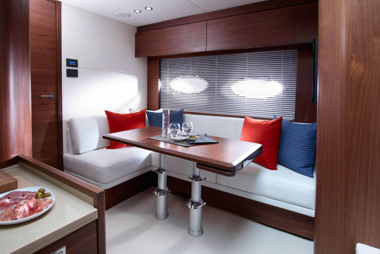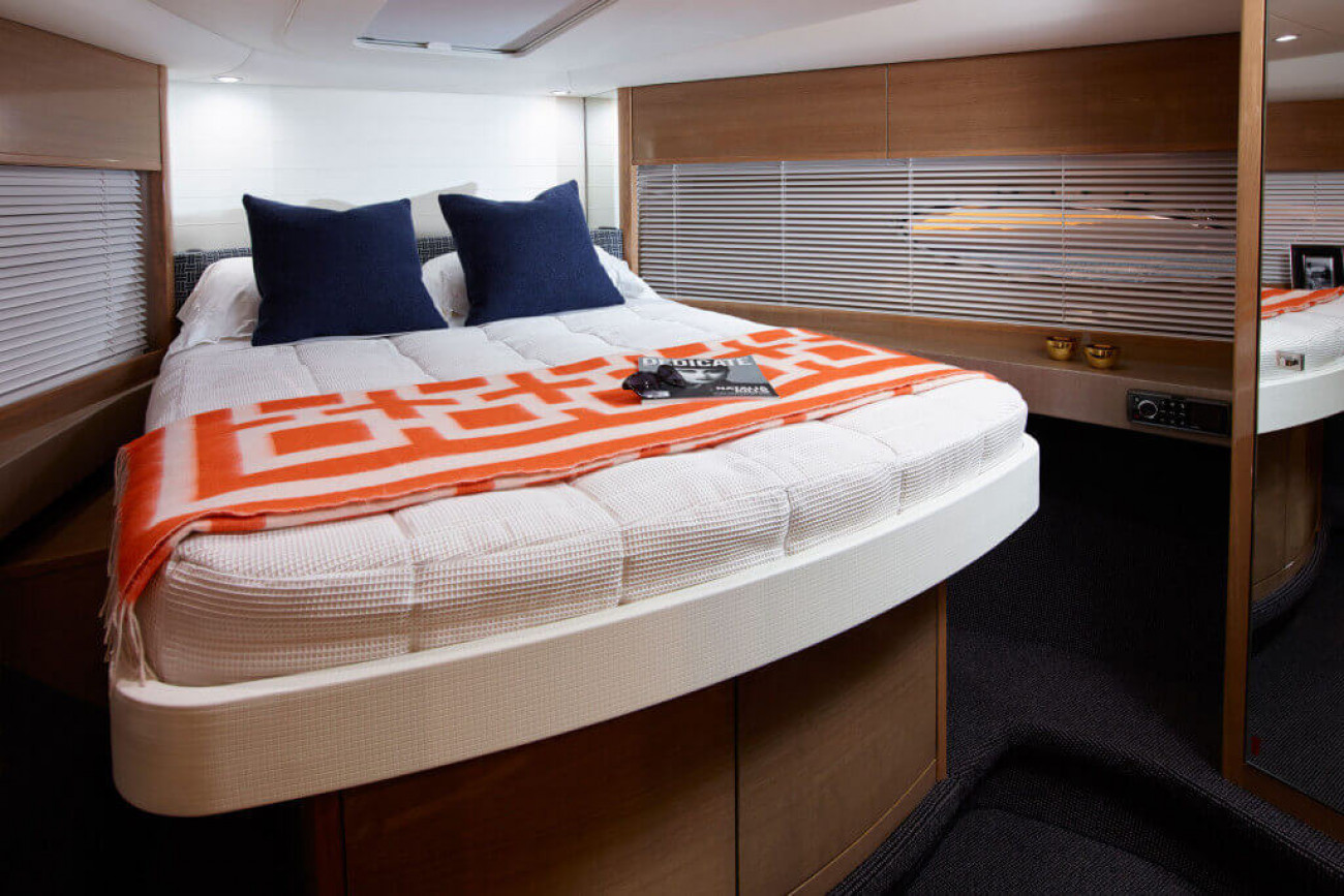 Utrymmena ombord får den här båten att verkligen sticka ut från andra i sin klass. I kaptenshytten midskepps med ståhöjd finns badrum och ett par enorma fönster nära vattenytan som ger utmärkt sikt – det här är mer som en häftig hotellsvit. Förkabinen har en dubbelbädd som enkelt delas i två och ovalformade fönster som släpper in rikligt med naturligt ljus.