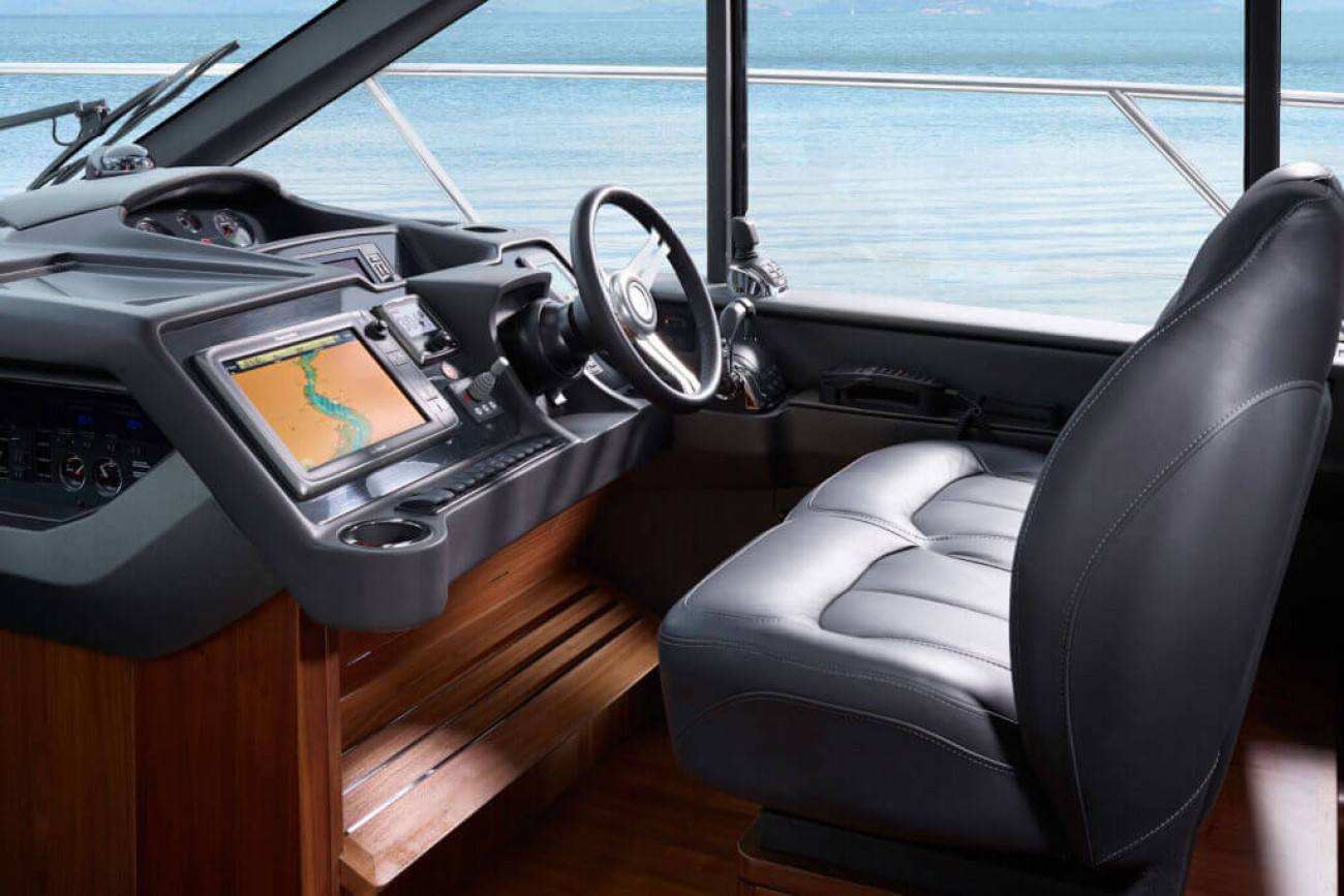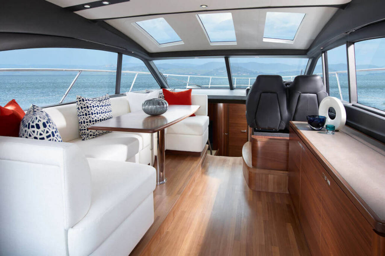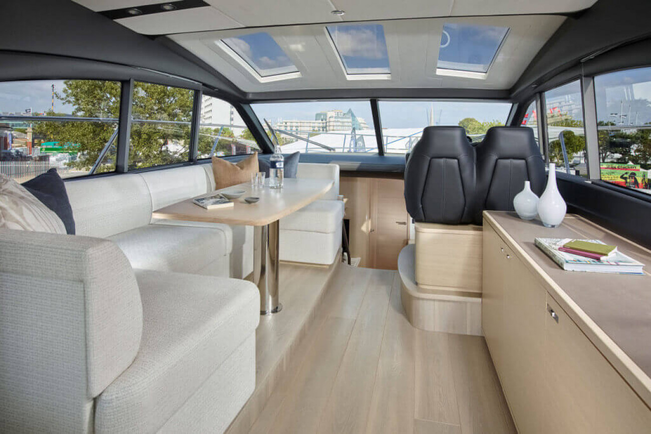 V48:an erbjuder både en skön upplevelse ute med gott om utrymme på förstäven att sträcka ut sig på under långa soliga dagar, men också en rymlig övre salong med GRP-hardtop som är perfekt att vara i om vädret skulle slå om. Det finns gott om förvaringsutrymmen både på förarplatsen och i salongen.