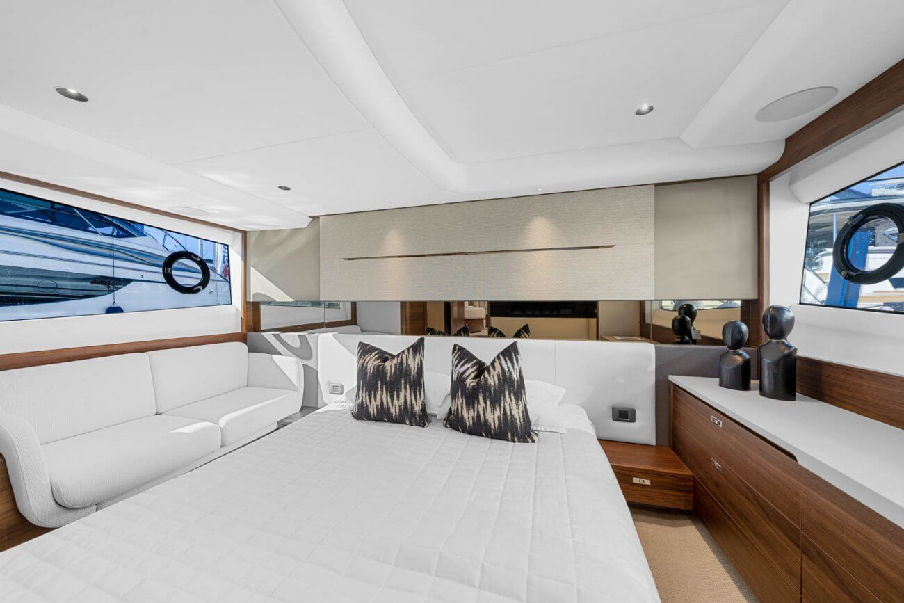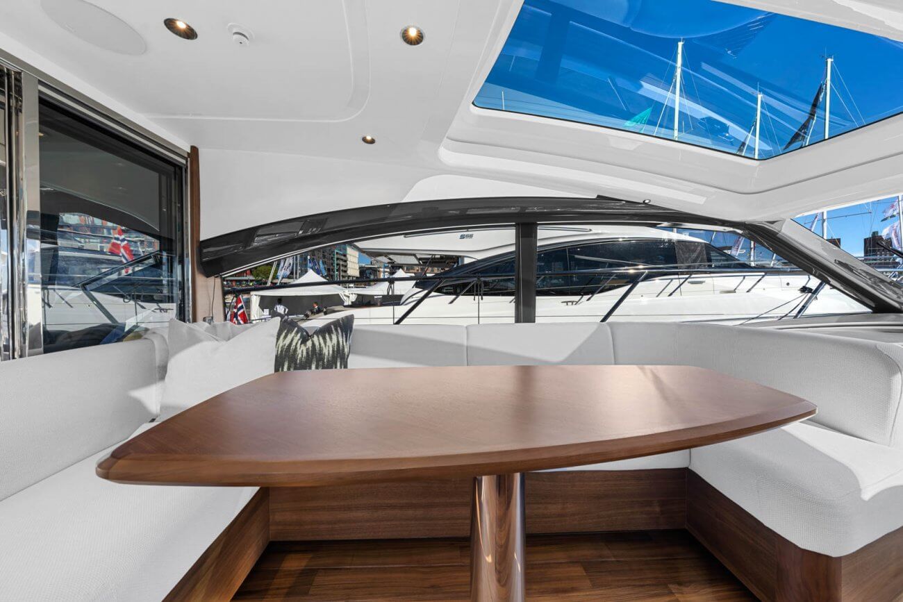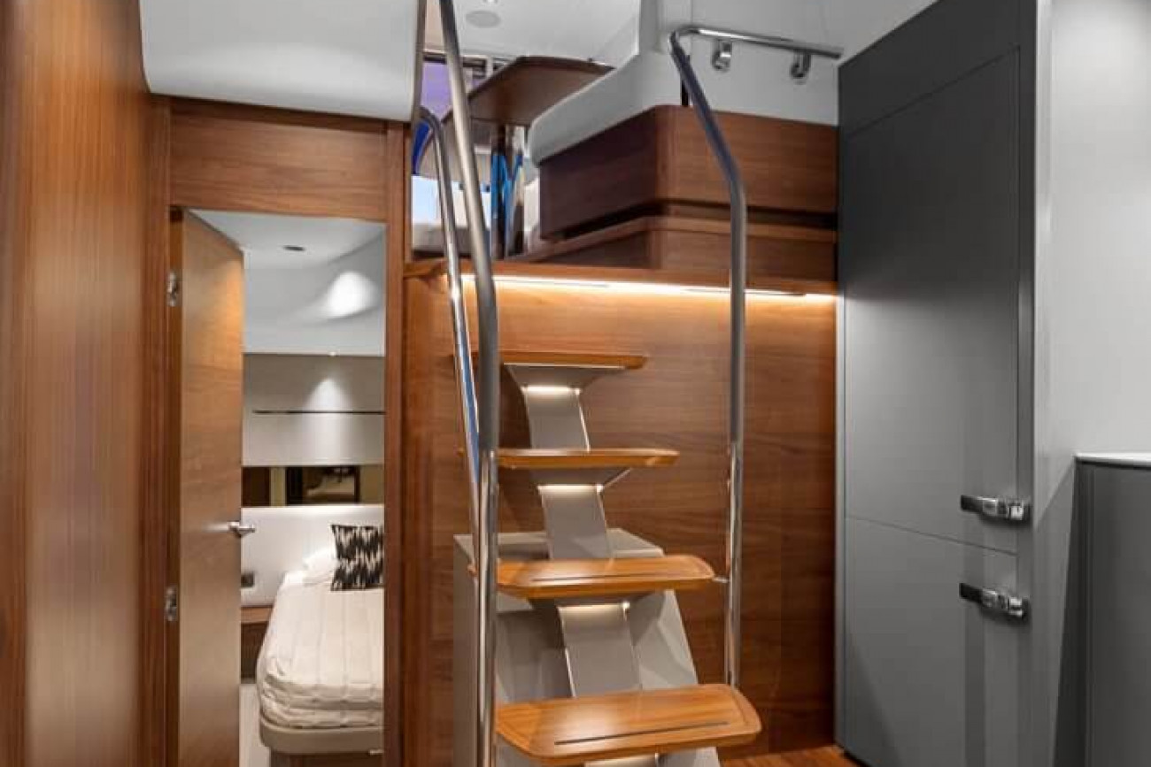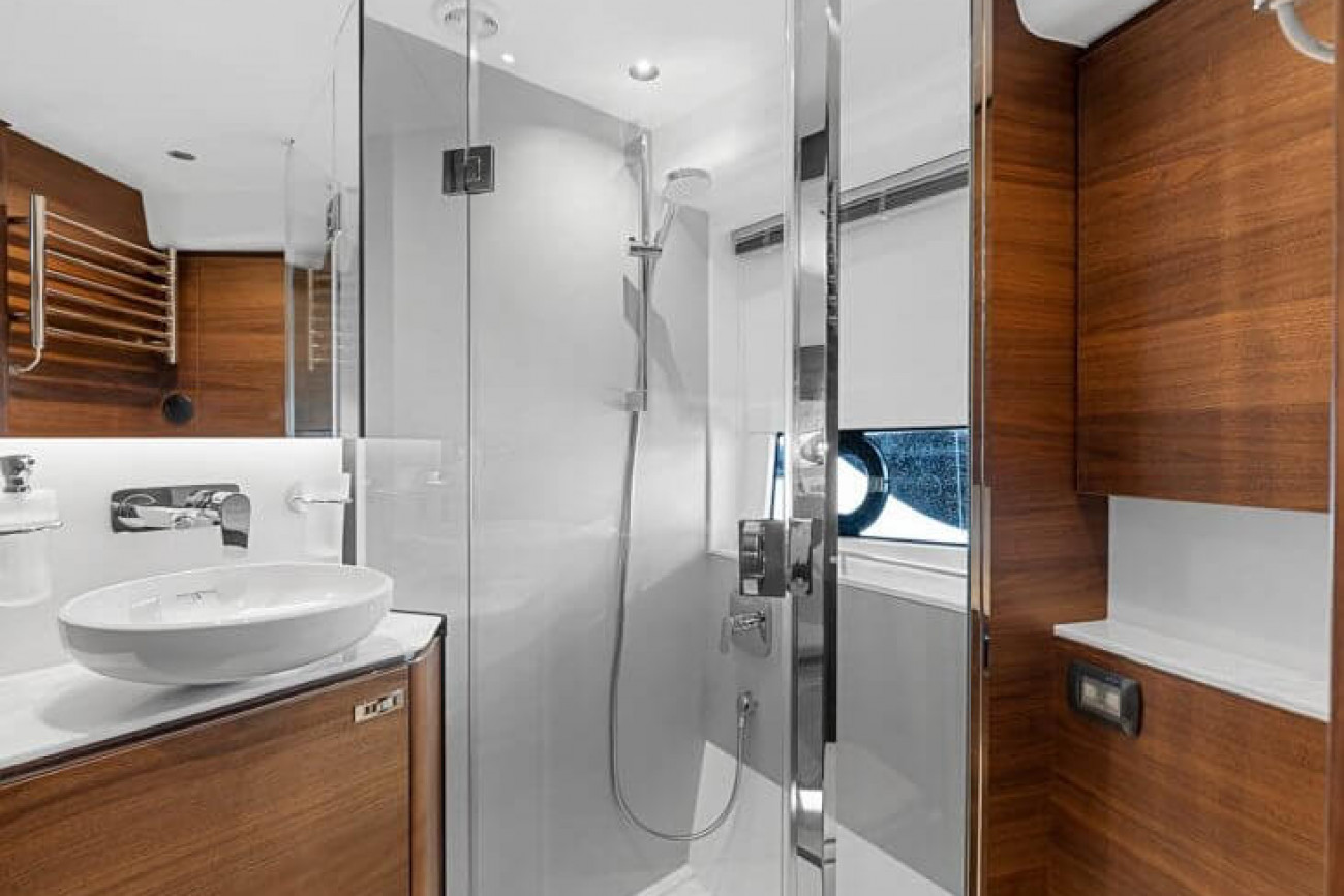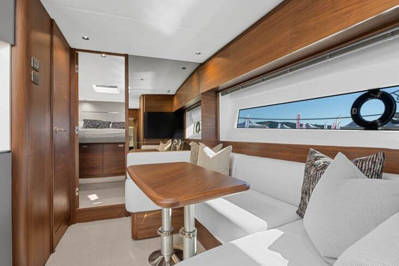 Vid underhållning ger den utökade sittbrunnen exceptionellt utomhuslivsutrymme där man kan skapa oförglömliga upplevelser. Under däck ligger ett ljust, modernt öppet kök mittemot ett sällskapligt underhållande utrymme. Fyra till sex gäster kan njuta av två eller tre vackert inredda hytter som är fyllda med naturligt ljus från den omfattande skrovglasningen, med en masterkabin midskepps i hela båtens bredd.