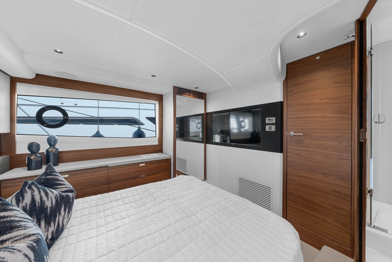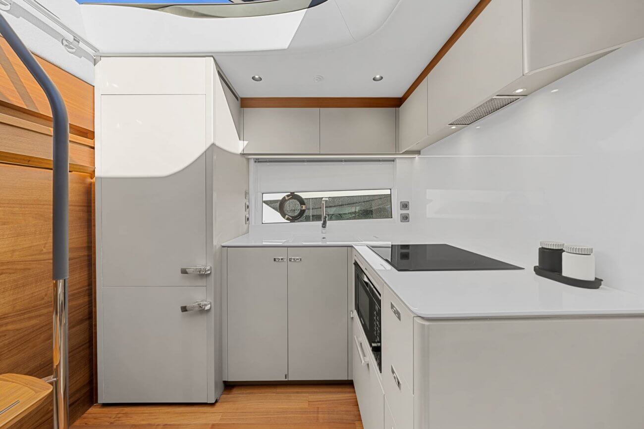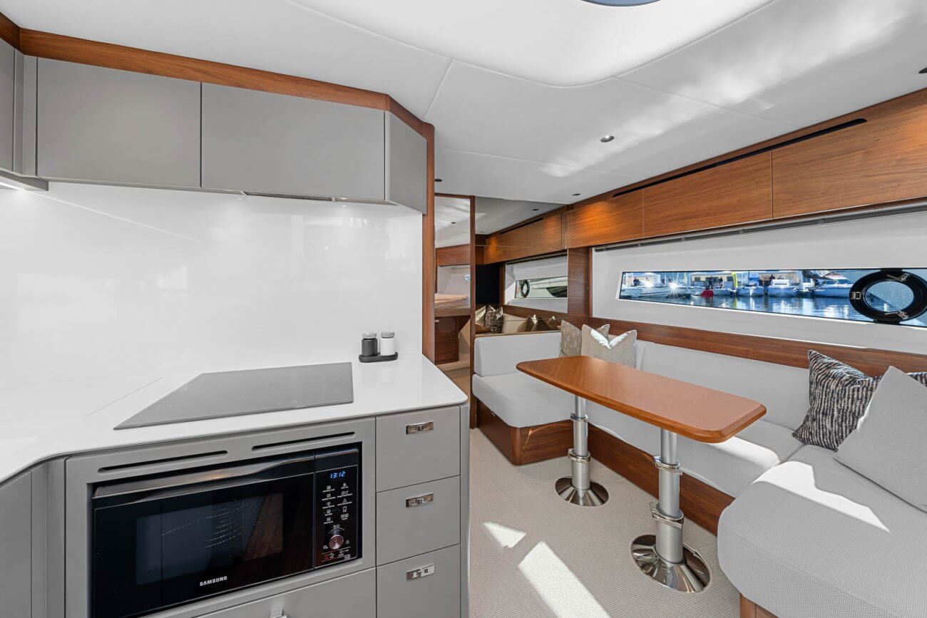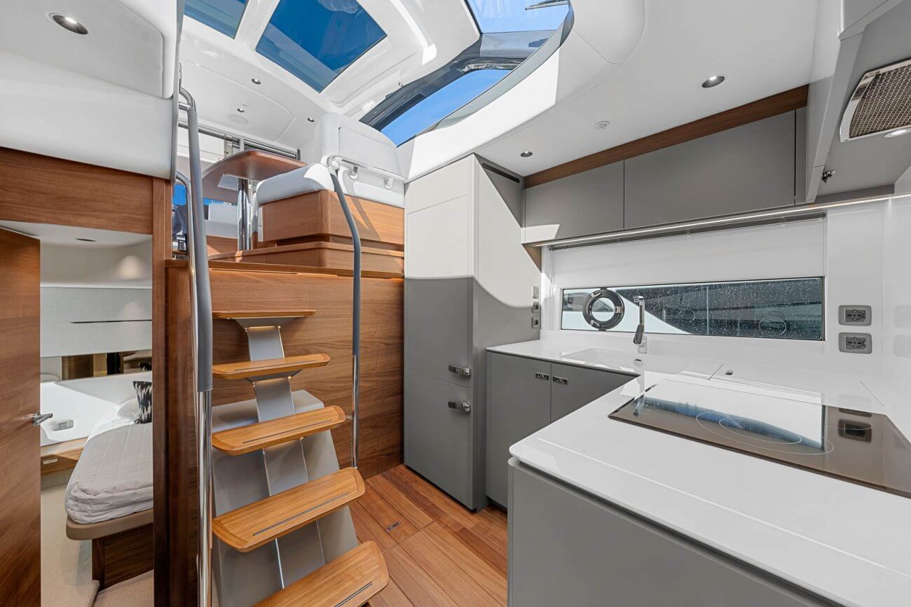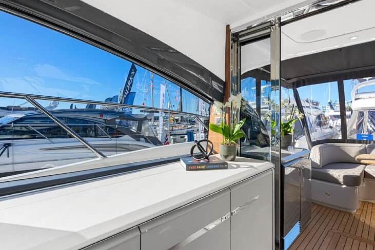 Vid underhållning ger den utökade sittbrunnen exceptionellt utomhuslivsutrymme där man kan skapa oförglömliga upplevelser. Under däck ligger ett ljust, modernt öppet kök mittemot ett sällskapligt underhållande utrymme. Fyra till sex gäster kan njuta av två eller tre vackert inredda hytter som är fyllda med naturligt ljus från den omfattande skrovglasningen, med en masterkabin midskepps i hela båtens bredd.