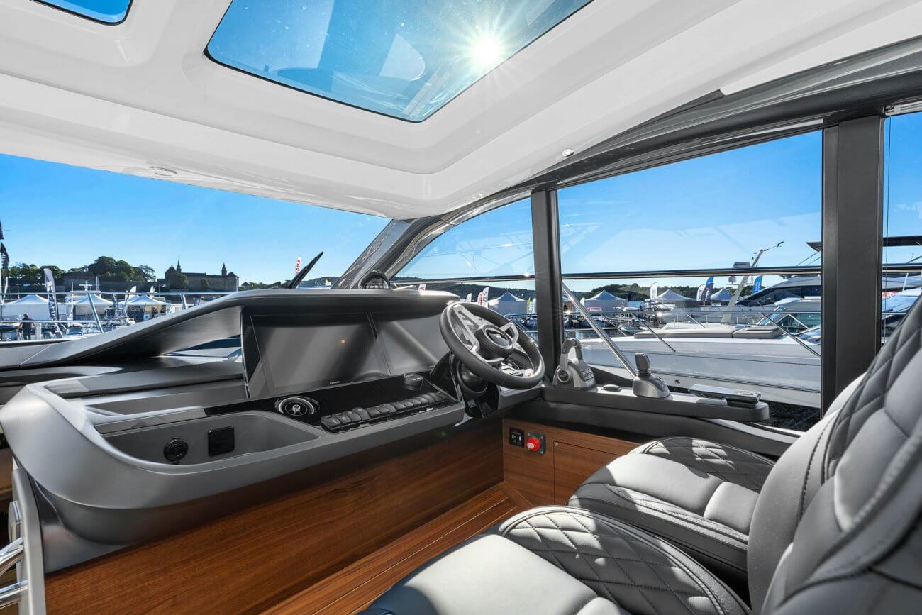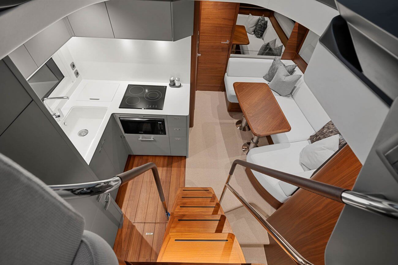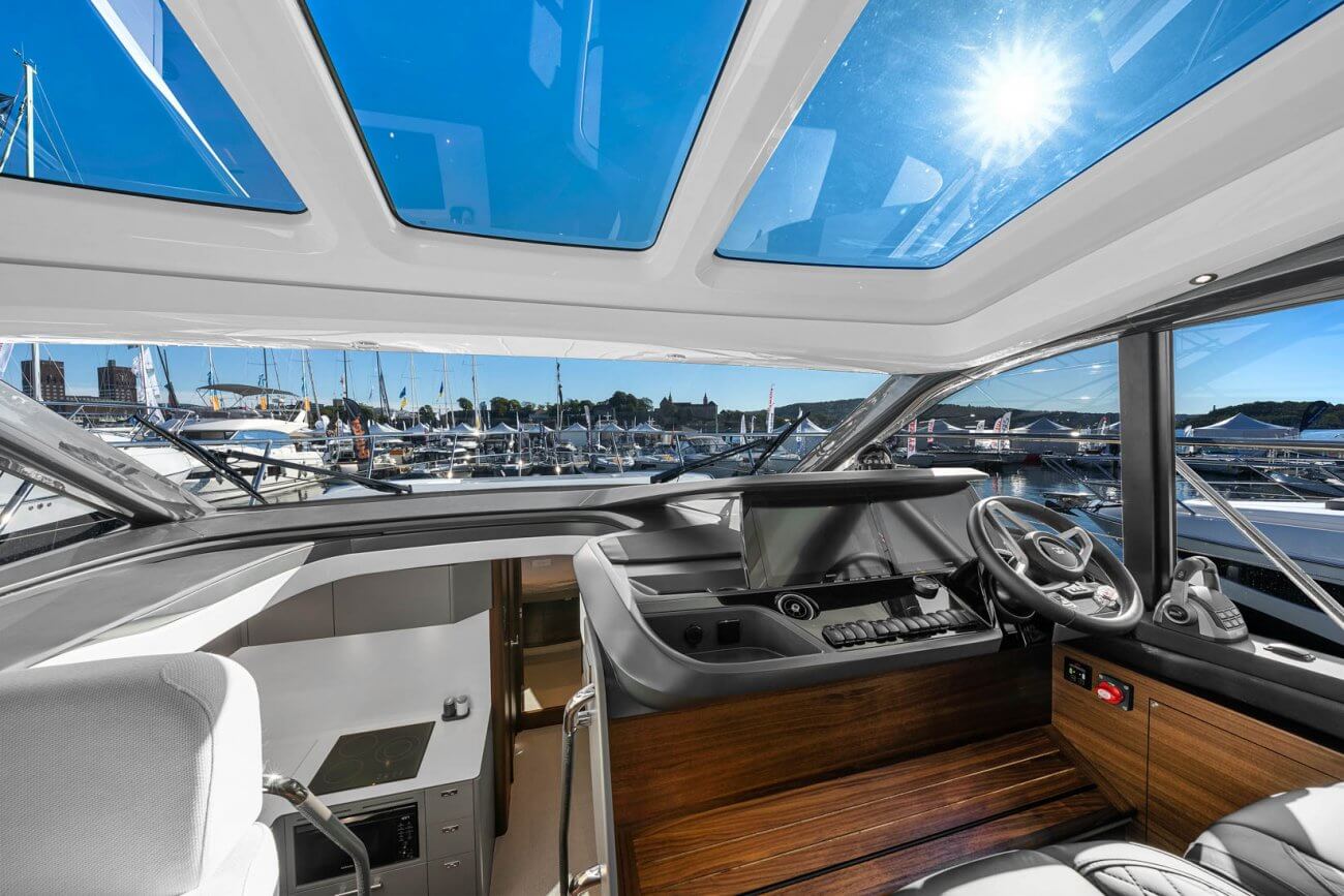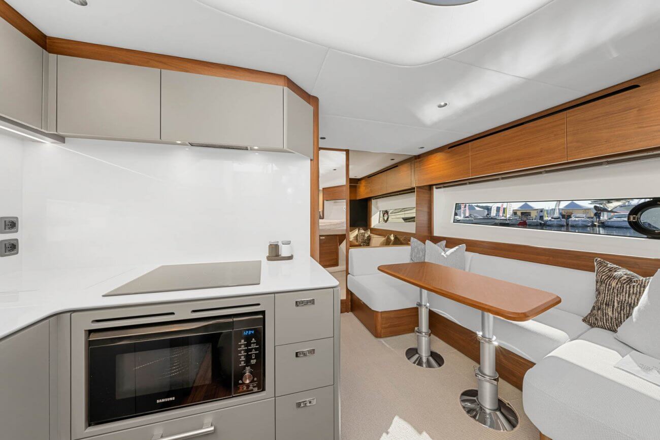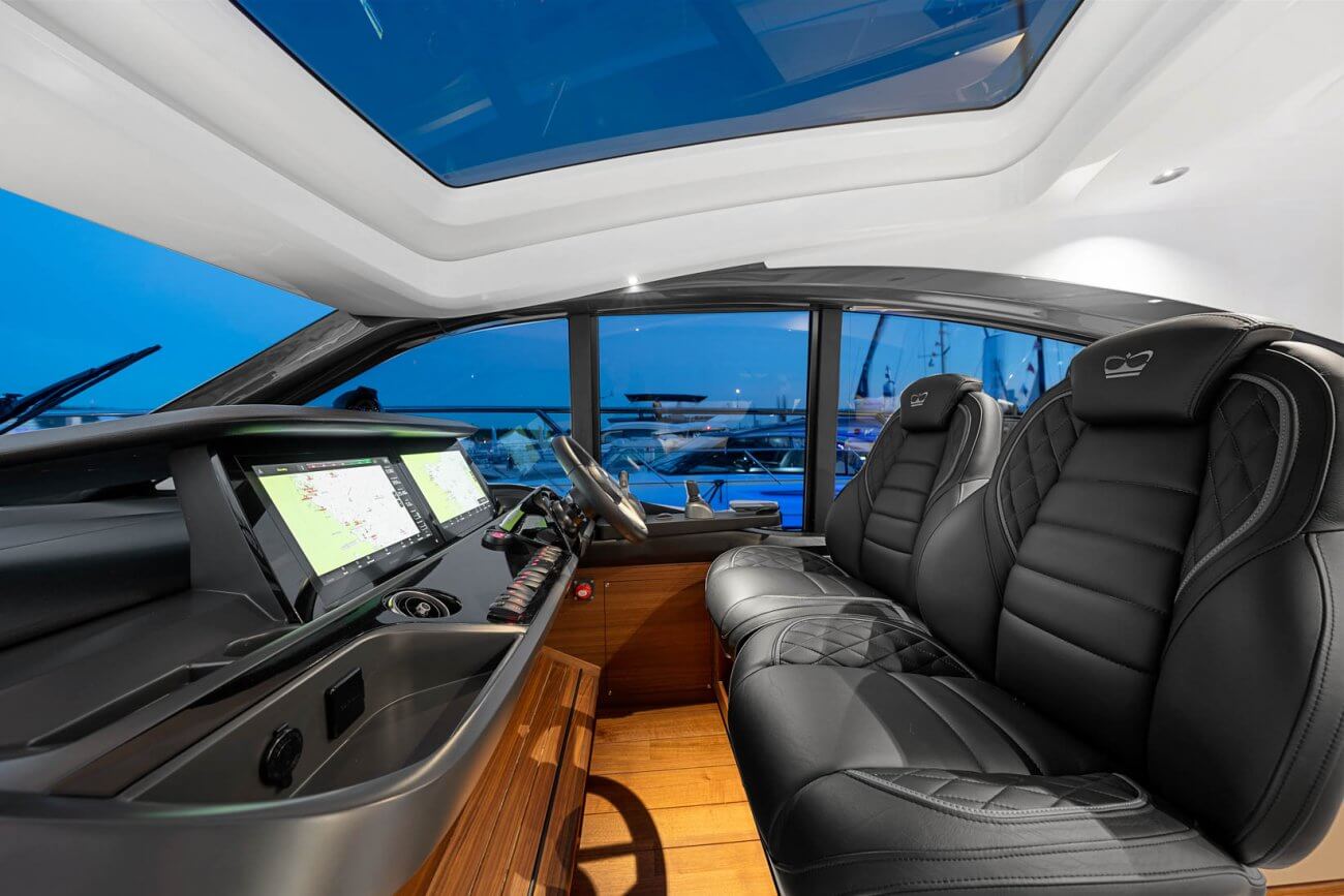 Vid underhållning ger den utökade sittbrunnen exceptionellt utomhuslivsutrymme där man kan skapa oförglömliga upplevelser. Under däck ligger ett ljust, modernt öppet kök mittemot ett sällskapligt underhållande utrymme. Fyra till sex gäster kan njuta av två eller tre vackert inredda hytter som är fyllda med naturligt ljus från den omfattande skrovglasningen, med en masterkabin midskepps i hela båtens bredd.