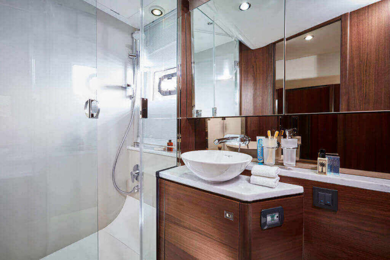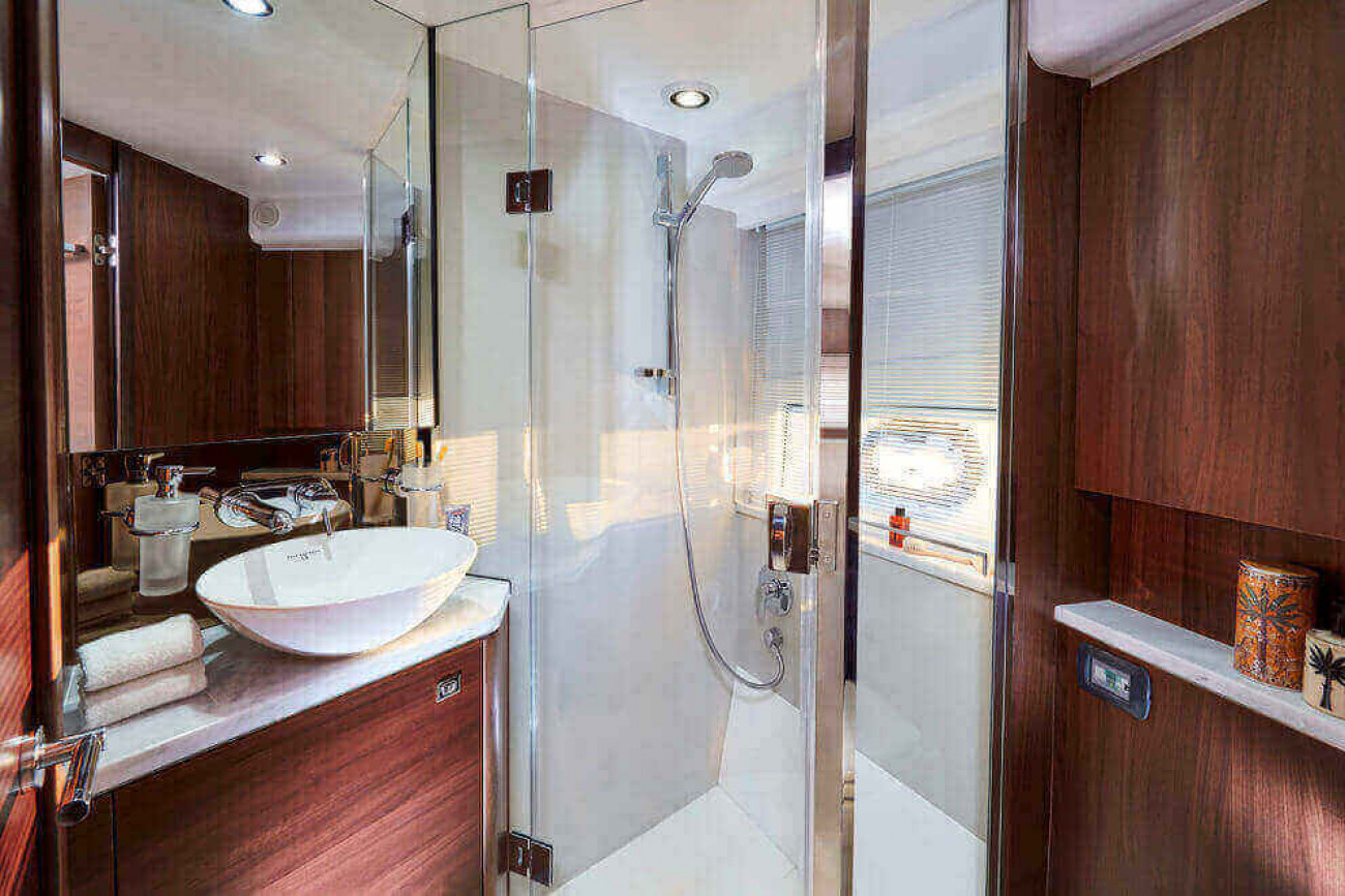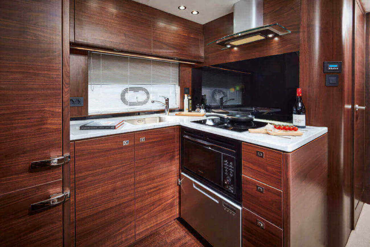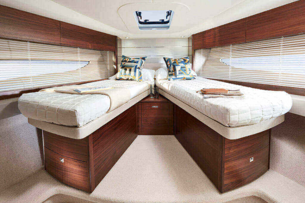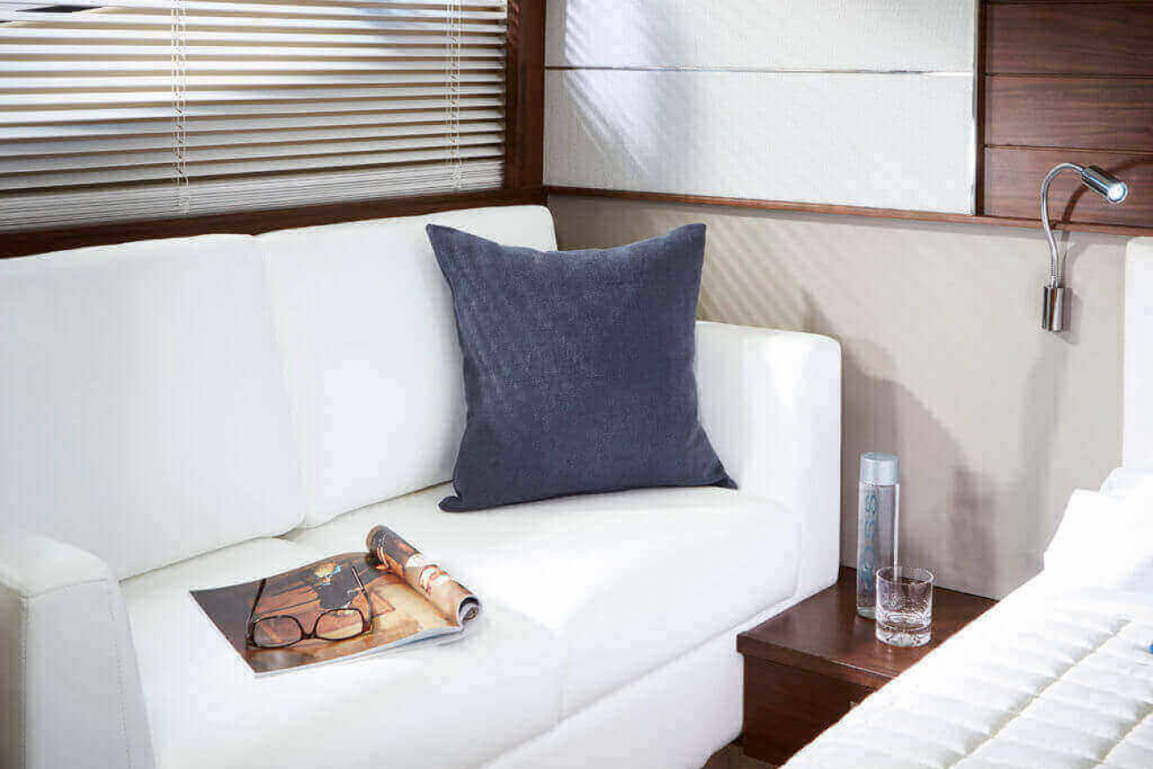 Midkabinen i fullbredd är en inbjudande fristad och den främre gästkabinen har en stor dubbelsäng med möjlighet att dela i två enkelsängar. Hennes välutrustade nedre salong kan användas för umgänge eller omvandlas till en tillfällig dubbelbädd. Det finns också möjlighet att specificera båten med en tredje dubbelkabin. Denna exceptionella yacht utan kompromisser utlovar många minnesvärda äventyr.