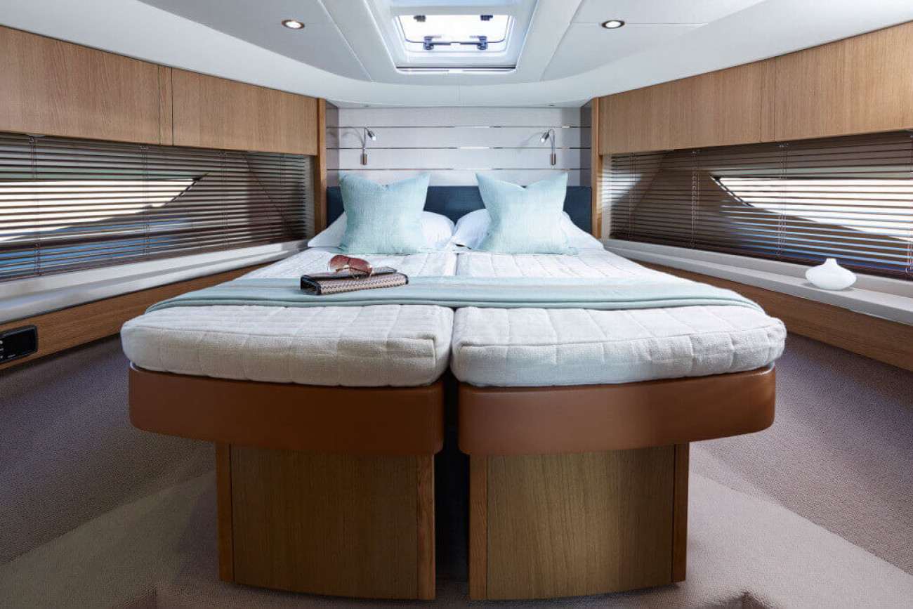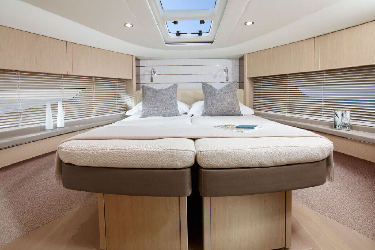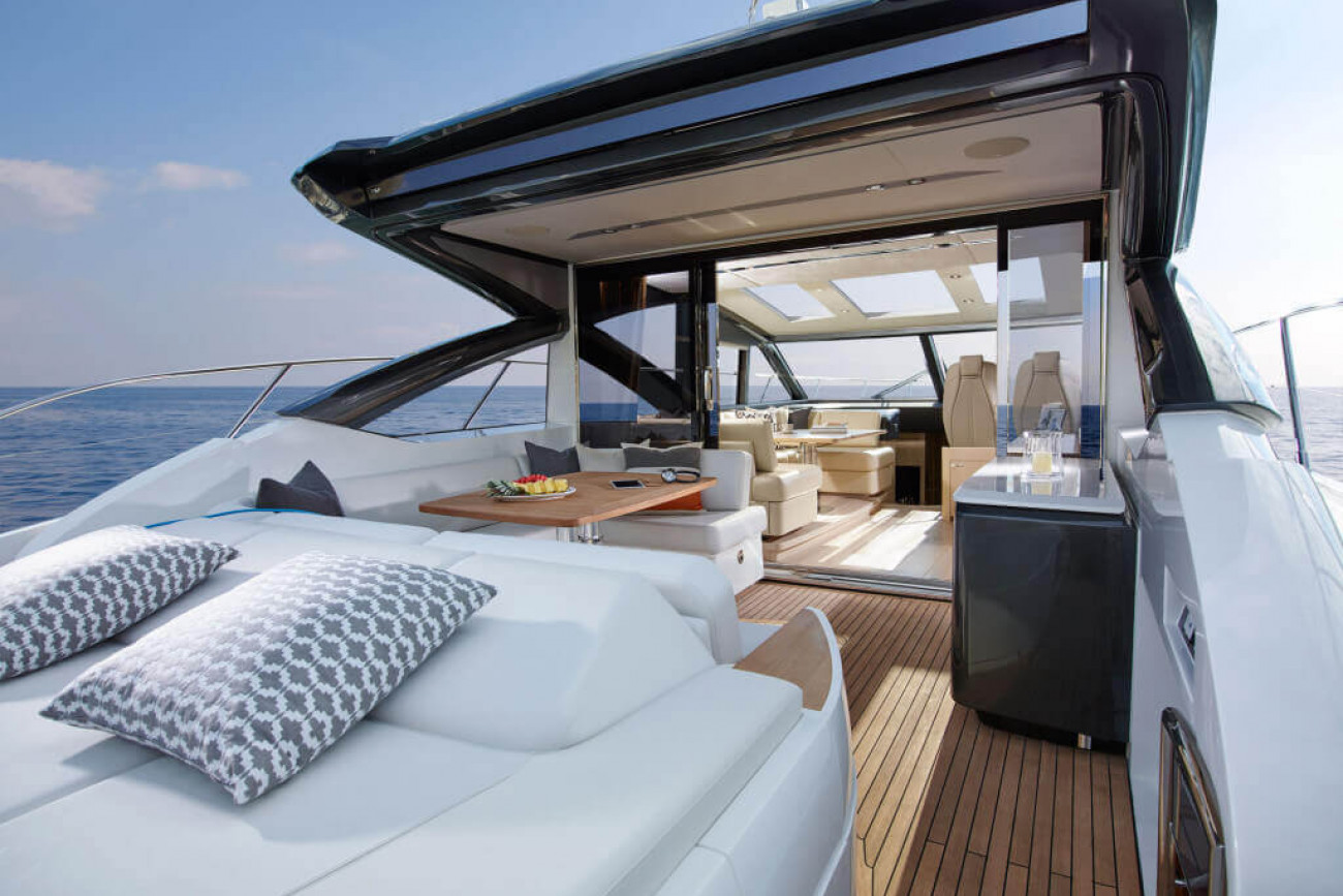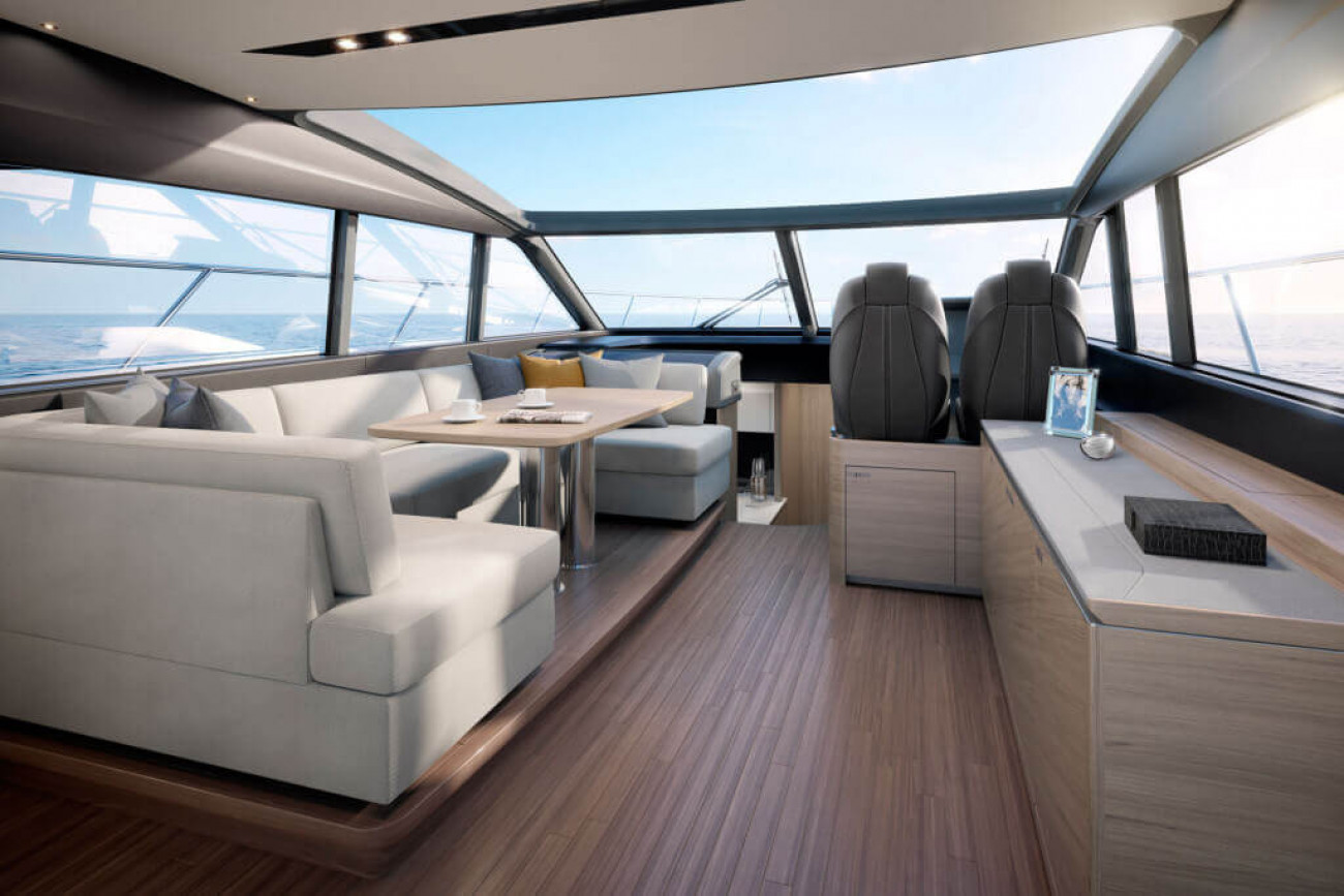 Det senaste tillskottet till modellprogrammet V Class, är den dynamiska nya V58, om finns i två versioner – Öppen eller Däcksalong. Den öppna modellen med en fullängdssittbrunn med stort elektriskt öppningsbart kapelltak är perfekt för sommardagar, medan den flexibla slutna däckssalongsmodellen kan kylas med klimatanläggning eller öppnas via trippel skjutdörr och taklucka. De stora, dynamiska skrovfönstren släpper in ljuset i de vackert inredda boendeutrymmena. Med tre gästhytter, två av som åtnjuter ett eget badrum, och möjligheten att välja till en extra hytt akterut – är hon ett helt enastående fartyg.