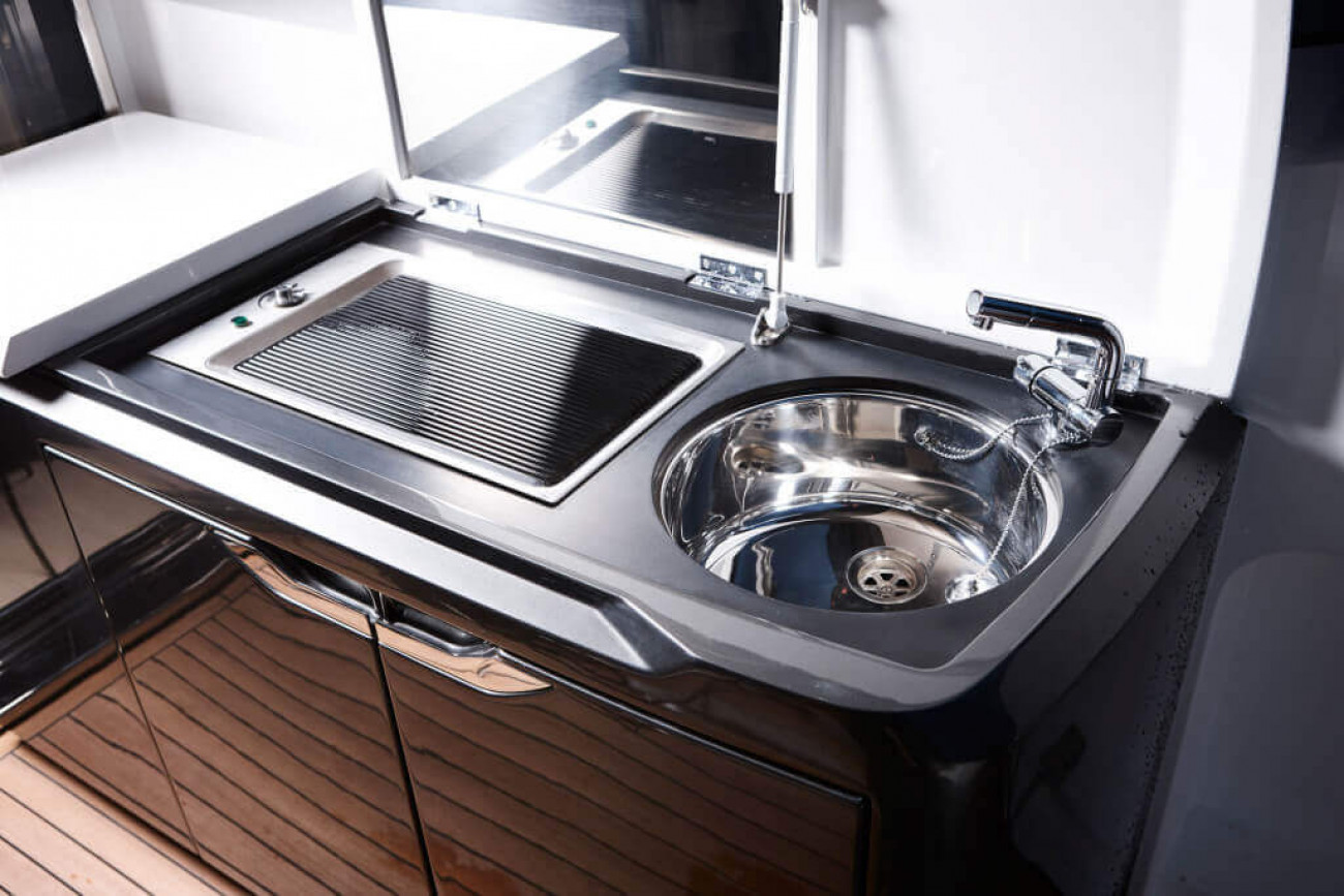 • Transom gate leading to bathing platform with electro-hydraulic raise/lower mechanism, foldaway swimming ladder and hot and cold shower
