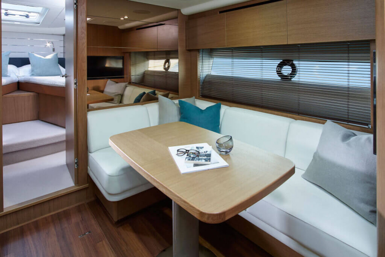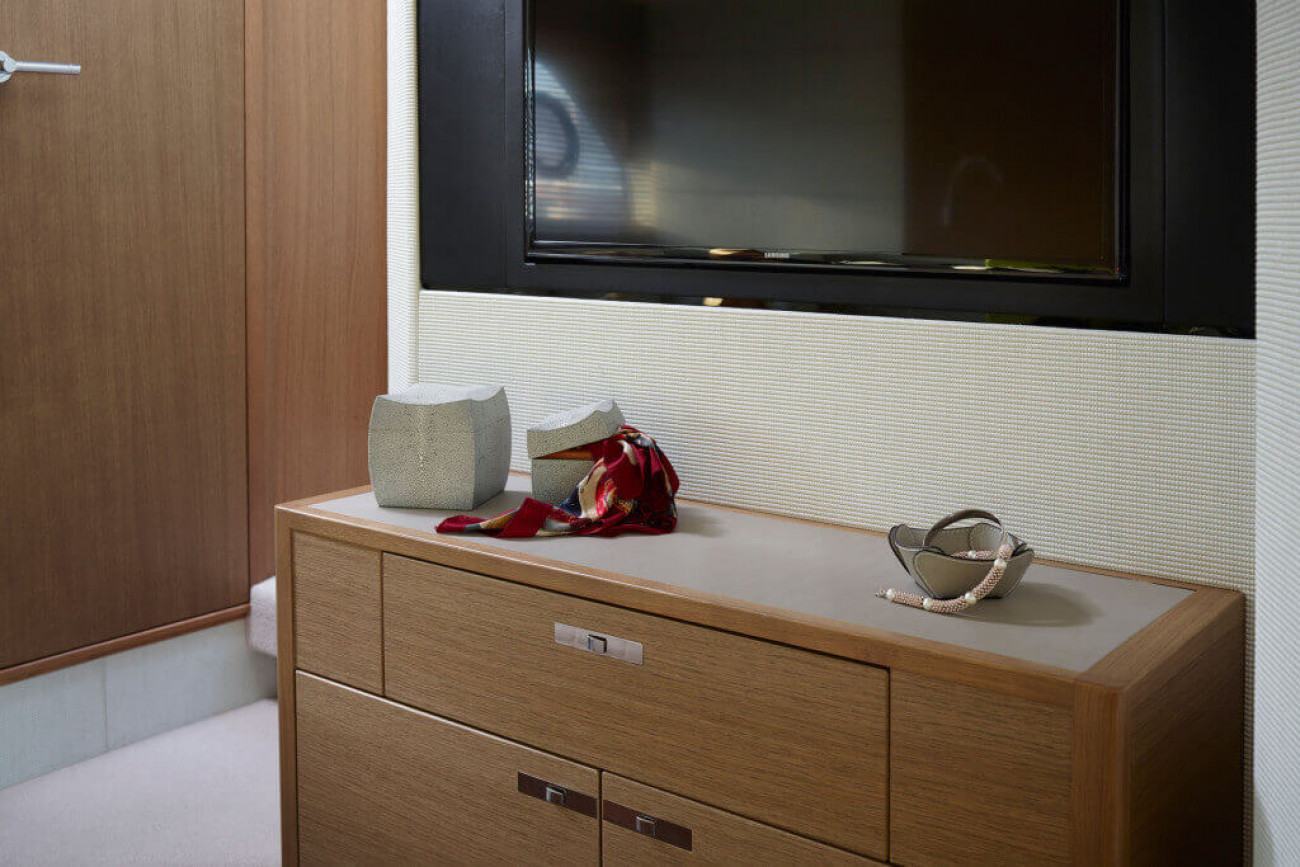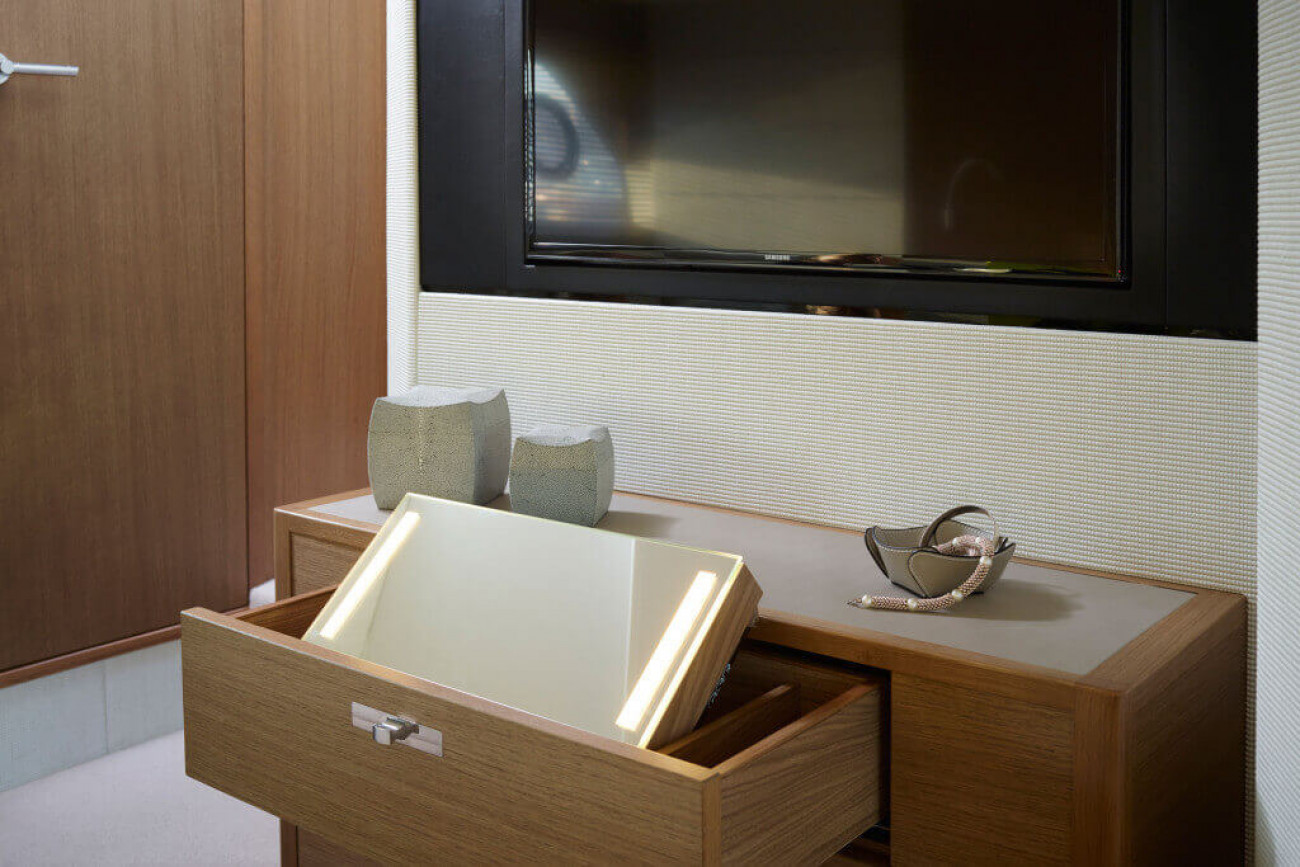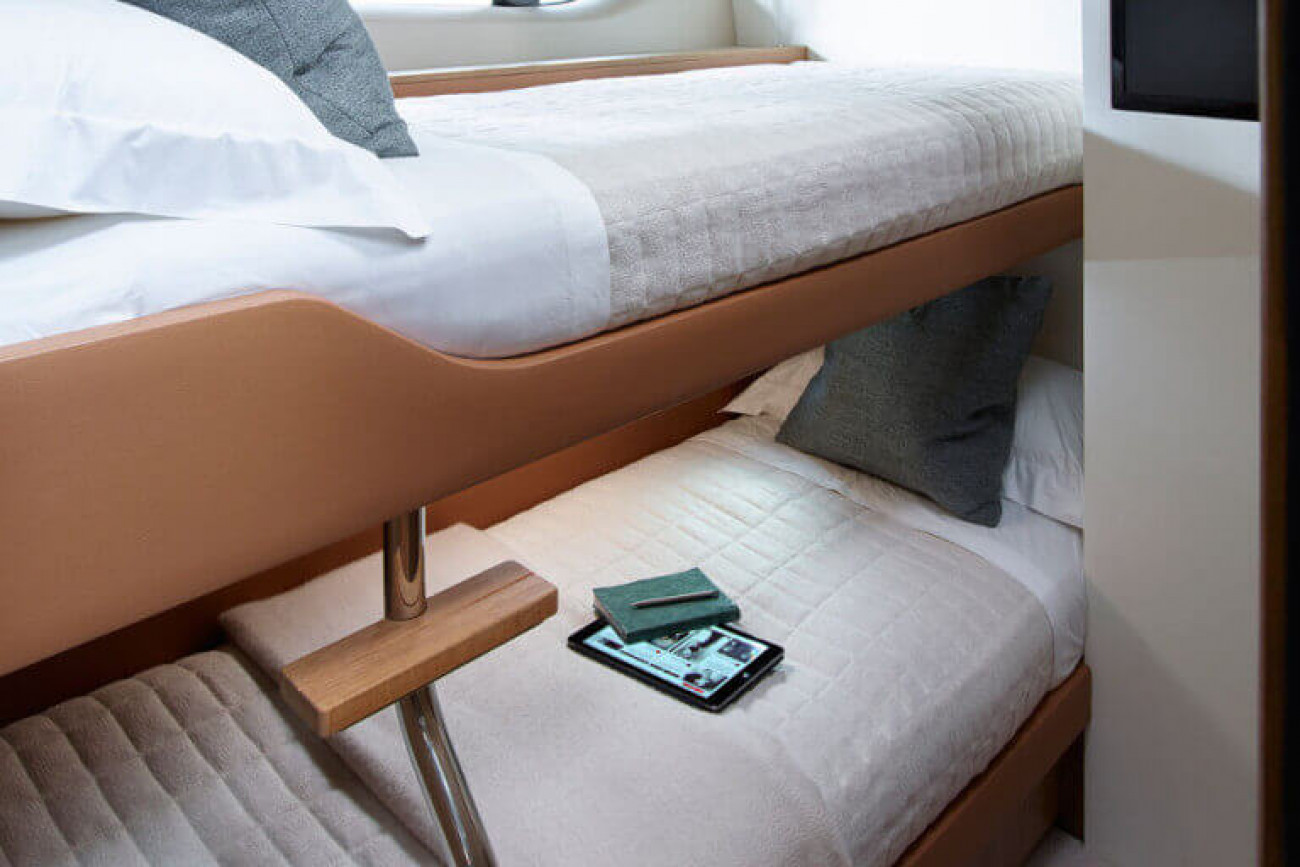 • 46” LED TV on electric raise/lower mechanism and DVD, radio/MP3 with saloon and cockpit speakers