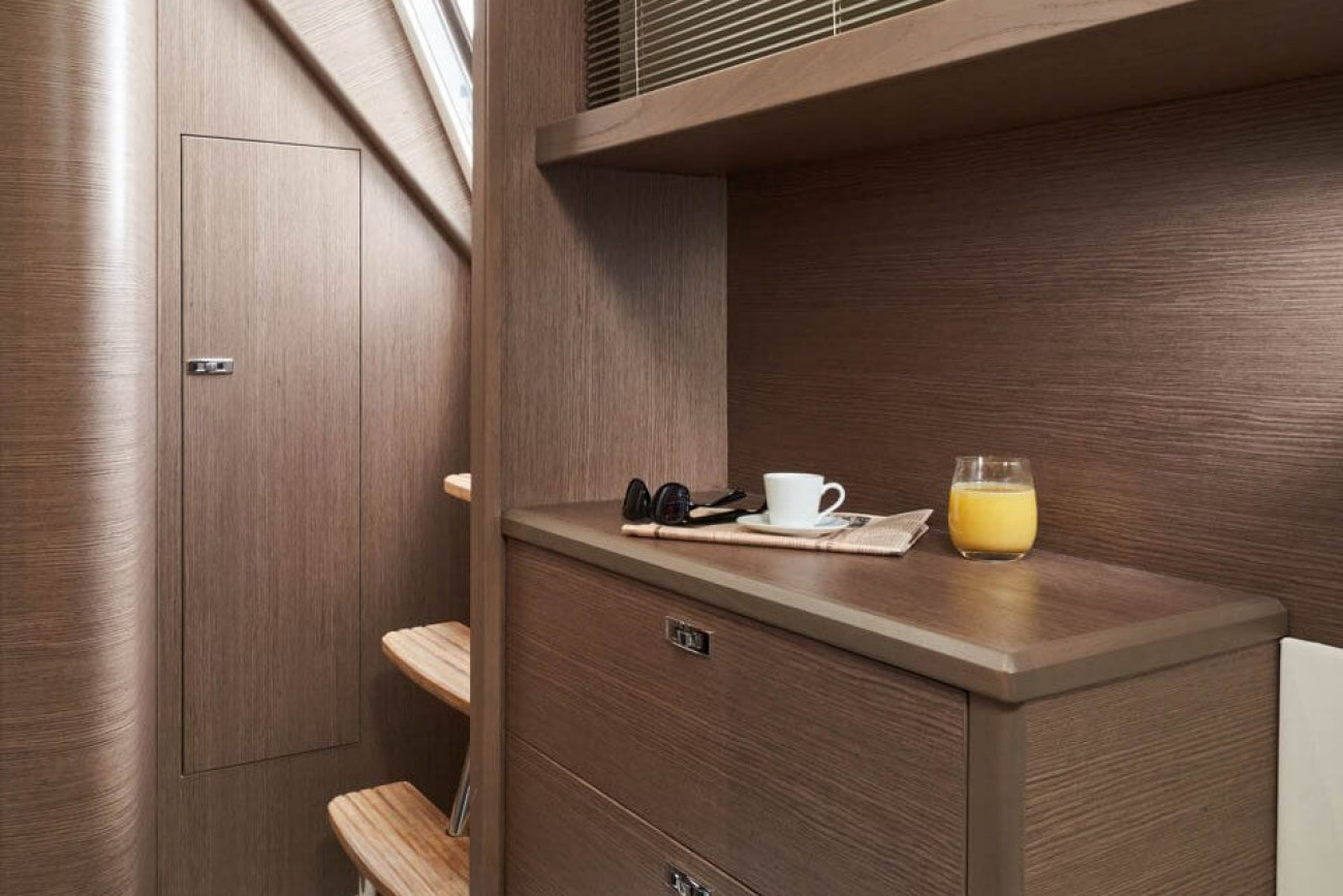 Fulländad med genomgående hög standard, kan helt nya Y72s designfunktioner jämföras med de större Y Class-yachterna. Varje centimeter av båtens utrymmen är smart nyttjat med förvaring och praktiska lösningar samtidigt visar hon upp ljusa öppna ytor på varje däck. Flexibilitet är nyckeln ombord, med anpassningsbara möblemang och tillval som passar dig – hennes sociala layout i huvudsalongen kombinerar en baryta och en öppen planlösning, kompletterat med ett toppmodernt Naim-ljudsystem. Öppna upp mot världen med skjutdörrar i glas mellan huvudsalongen och sittbrunnsområdena med ett integrerat öppningsbart fönster akter om pentryt. Njut av vattensporter med lätthet med hennes stora akterspegel med en hopfällbar badstege och dusch. Moderna och klassiska toner matchade med ljusa träslag och panoramafönster skapar ett avundsvärt utrymme ombord för att fördriva de långa sommardagarna.