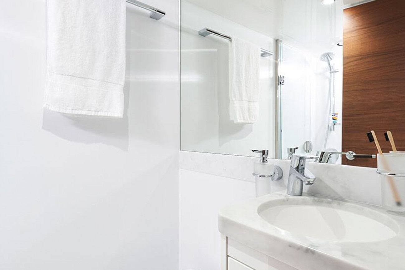 • Bathroom with separate stall shower, electric freshwater toilet and washbasin