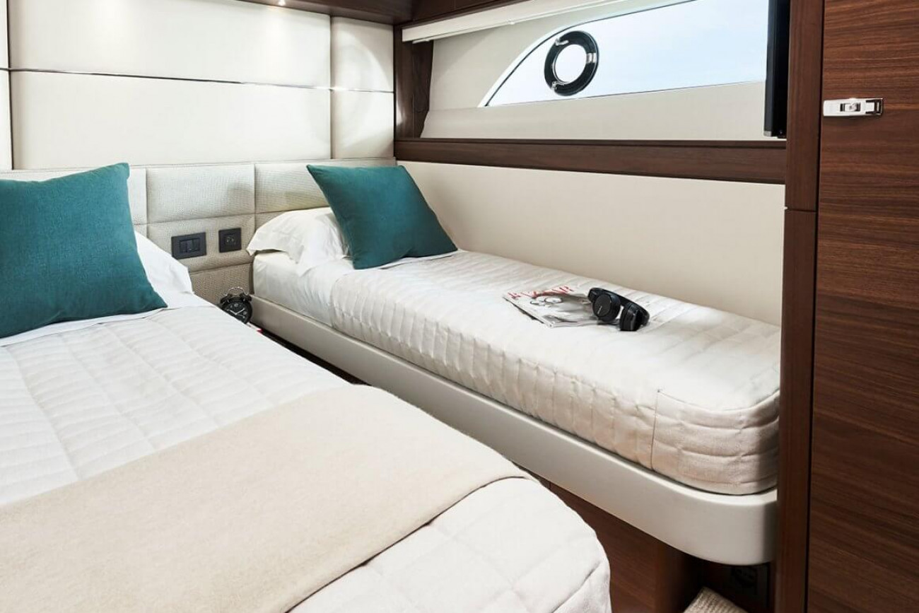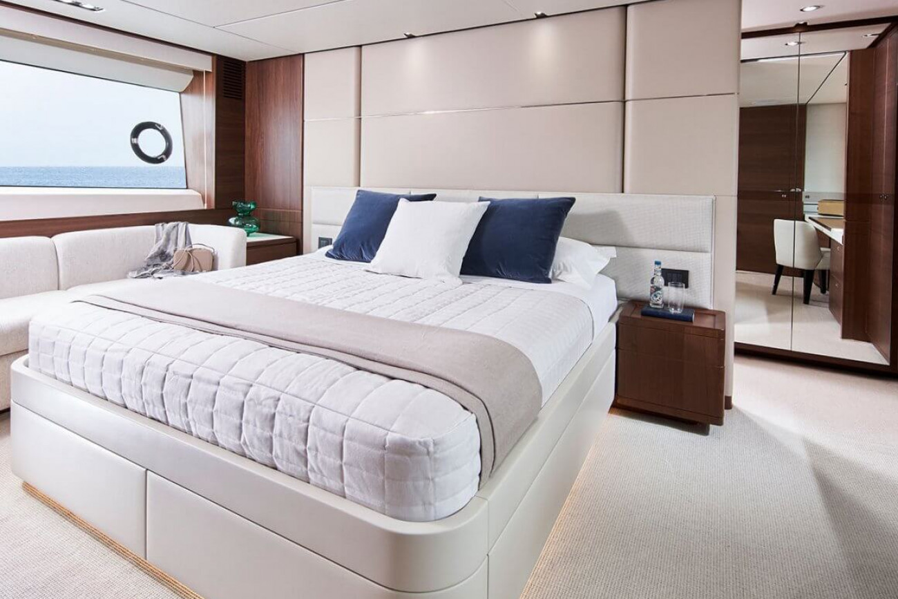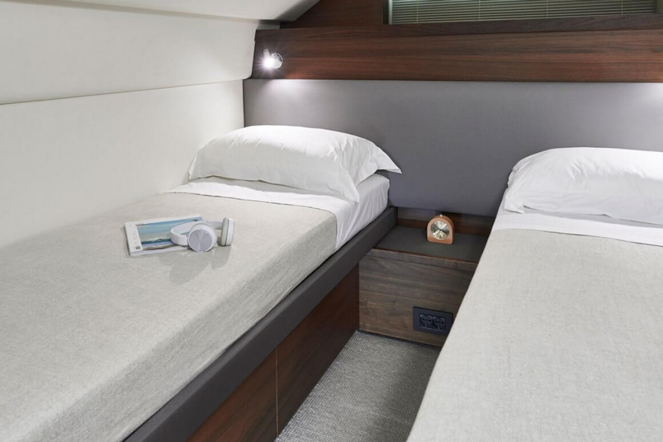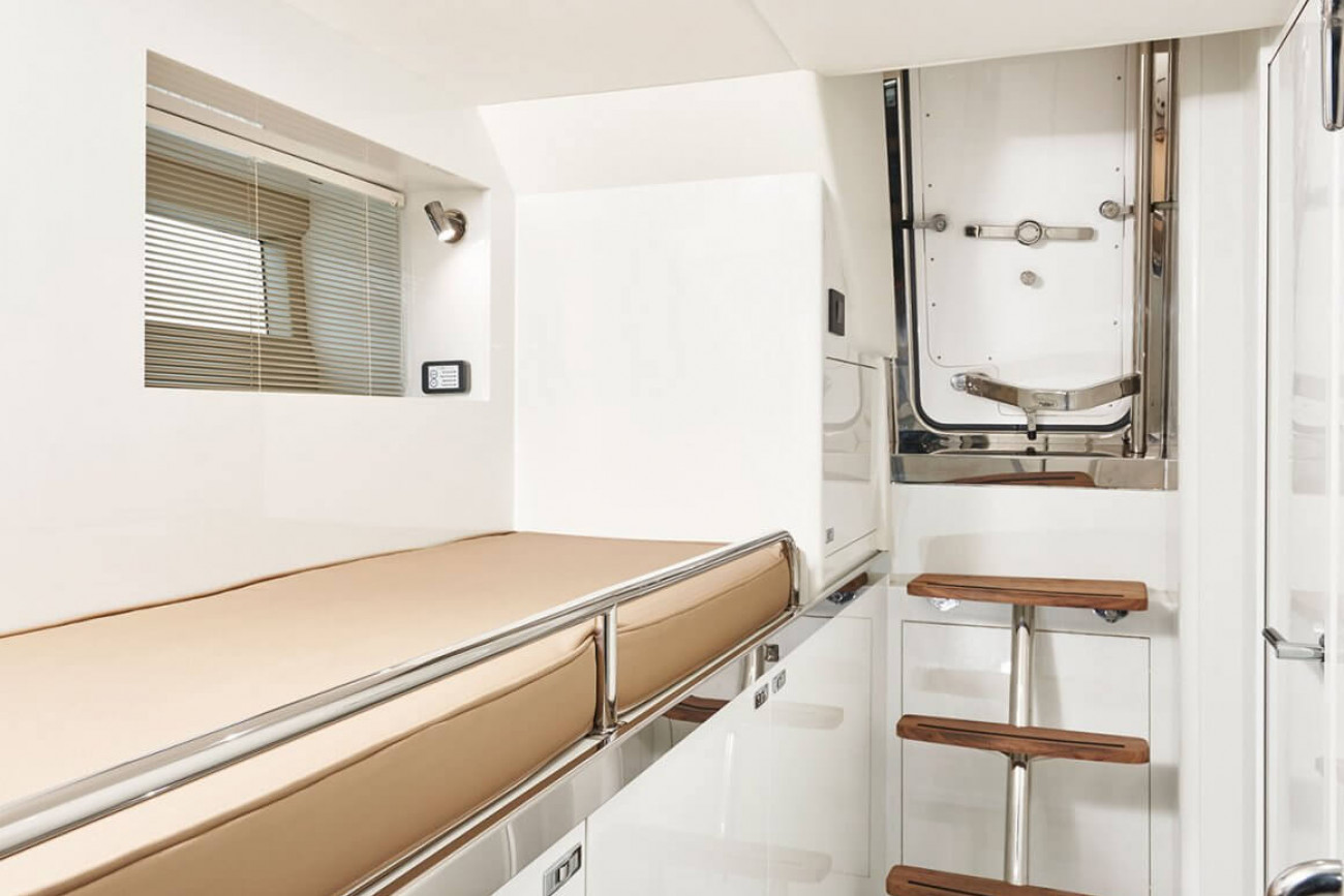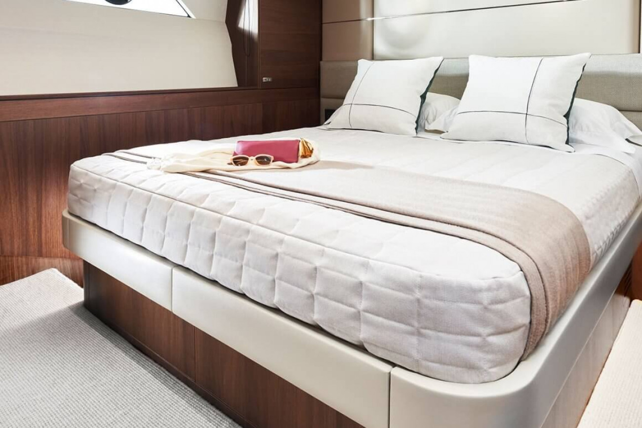 • Large double bed with drawers below (with the option of powered sliding berths)
