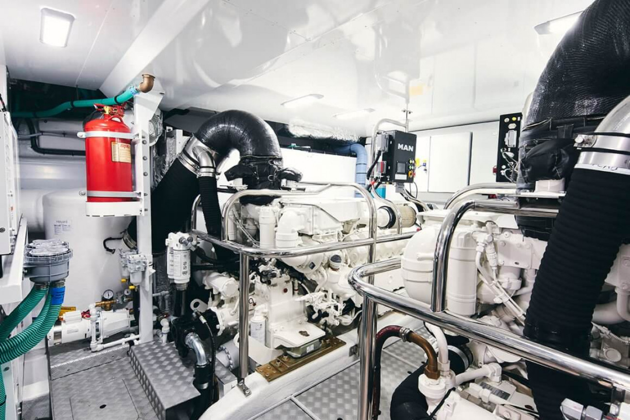 • Automatic/manual override fire extinguishers in engine room with warning system at both helm positions and incorporating engine air vent closure system